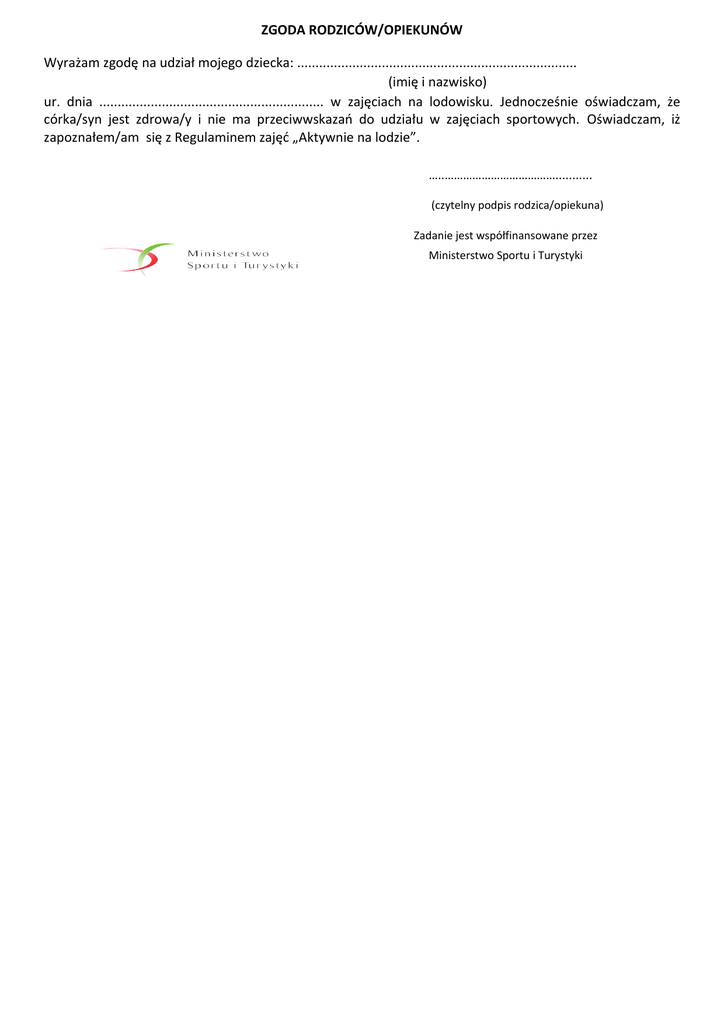 ZGODA RODZICÓW/OPIEKUNÓW Wyrażam zgodę na udział mojego dziecka: ............................................................................ (imię i nazwisko) ur. dnia ............................................................. w zajęciach na lodowisku. Jednocześnie oświadczam, że córka/syn jest zdrowa/y i nie ma przeciwwskazań do udziału w zajęciach sportowych. Oświadczam, iż zapoznałem/am się z Regulaminem zajęć „Aktywnie na lodzie”. …..………………………………........... (czytelny podpis rodzica/opiekuna) Zadanie jest współfinansowane przez Ministerstwo Sportu i Turystyki