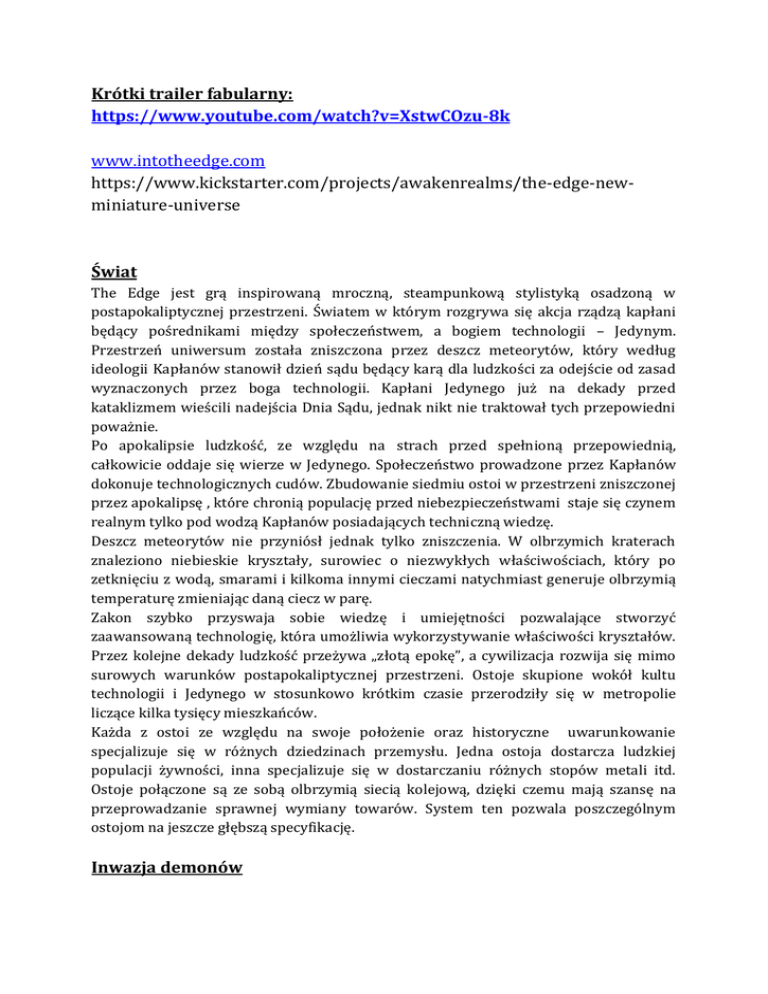 Krótki trailer fabularny: https://www.youtube.com/watch?v=XstwCOzu-8k www.intotheedge.com https://www.kickstarter.com/projects/awakenrealms/the-edge-newminiature-universe Świat The Edge jest grą inspirowaną mroczną, steampunkową stylistyką osadzoną w postapokaliptycznej przestrzeni. Światem w którym rozgrywa się akcja rządzą kapłani będący pośrednikami między społeczeństwem, a bogiem technologii – Jedynym. Przestrzeń uniwersum została zniszczona przez deszcz meteorytów, który według ideologii Kapłanów stanowił dzień sądu będący karą dla ludzkości za odejście od zasad wyznaczonych przez boga technologii. Kapłani Jedynego już na dekady przed kataklizmem wieścili nadejścia Dnia Sądu, jednak nikt nie traktował tych przepowiedni poważnie. Po apokalipsie ludzkość, ze względu na strach przed spełnioną przepowiednią, całkowicie oddaje się wierze w Jedynego. Społeczeństwo prowadzone przez Kapłanów dokonuje technologicznych cudów. Zbudowanie siedmiu ostoi w przestrzeni zniszczonej przez apokalipsę , które chronią populację przed niebezpieczeństwami staje się czynem realnym tylko pod wodzą Kapłanów posiadających techniczną wiedzę. Deszcz meteorytów nie przyniósł jednak tylko zniszczenia. W olbrzymich kraterach znaleziono niebieskie kryształy, surowiec o niezwykłych właściwościach, który po zetknięciu z wodą, smarami i kilkoma innymi cieczami natychmiast generuje olbrzymią temperaturę zmieniając daną ciecz w parę. Zakon szybko przyswaja sobie wiedzę i umiejętności pozwalające stworzyć zaawansowaną technologię, która umożliwia wykorzystywanie właściwości kryształów. Przez kolejne dekady ludzkość przeżywa „złotą epokę”, a cywilizacja rozwija się mimo surowych warunków postapokaliptycznej przestrzeni. Ostoje skupione wokół kultu technologii i Jedynego w stosunkowo krótkim czasie przerodziły się w metropolie liczące kilka tysięcy mieszkańców. Każda z ostoi ze względu na swoje położenie oraz historyczne uwarunkowanie specjalizuje się w różnych dziedzinach przemysłu. Jedna ostoja dostarcza ludzkiej populacji żywności, inna specjalizuje się w dostarczaniu różnych stopów metali itd. Ostoje połączone są ze sobą olbrzymią siecią kolejową, dzięki czemu mają szansę na przeprowadzanie sprawnej wymiany towarów. System ten pozwala poszczególnym ostojom na jeszcze głębszą specyfikację. Inwazja demonów Złota epoka technologii i rozwoju cywilizacji The Edge dobiegła jednak szybko i brutalnie końca. Demony – zdobywcy światów przypomniały nowym pokoleniom wychowanym pod czujnym okiem Zakonu horror apokalipsy. Demony dostają się do świata The Edge przez portale znajdujące się w różnych lokalizacjach, najczęściej w bardzo głębokich kraterach pozostawionych po deszczu meteorytów. O ile cel najeźdźców jest prosty (zależy im na zdobyciu kolejnego świata i wykorzystaniu wszystkich jego surowców), to środki, których do tego używają są dobrze zaplanowane i wyrafinowane. Przed inwazją na każdy kolejny świat, Demony przygotowują się dostosowując narzędzia walki do przeciwnika tak, aby maksymalnie wykorzystać jego słabości. Armia demonów podzielona jest na trzy kasty: PRIME – kasta przewodząca siłami demonów, cechująca się najwyższą inteligencją. Demony te skupiają się przede wszystkim na planowaniu kolejnych inwazji i tworzeniu strategii bojowych, używają magii krwi, posiadają możliwości rzucania czarów oraz wykorzystują moc kryształów. TERROR – kasta skupiająca się na niszczeniu morale przeciwników, wykorzystywaniu ich słabości i strachu. Przed każdą inwazją dostosowują swoje ciała tak, aby negatywnie oddziaływać na wszystkie zmysły przeciwnika. Działają poza linią frontu cierpliwie nękając wybrane jednostki. Swoją grę potrafią prowadzić miesiącami łamiąc psychikę ludzi i doprowadzając ich do całkowitego szaleństwa. Demony te spełniają również rolę zwiadowców i sabotażystów. BRUTE – kasta, której celem jest fizyczna walka. Brute są tradycyjnymi wojownika, którzy dbają o honor i stawiają sztukę wojny ponad wszystko. Ta kasta najczęściej wywołuje nieporozumienia i konflikty w armii demonów. Ich metody walki są czyste, Brute gardzą zarówno magią wykorzystywaną przez Prime, jak i działaniem kasty Terroru. Nie oznacza to jednak iż są litościwi wobec ludzi, wręcz przeciwnie, bardzo brutalnie rozprawiają się ze swoimi przeciwnikami. Działania demonów są dobrze zaplanowane, a każda z kast wykorzystuje konsekwentnie swoją rolę do całkowitej anihilacji przeciwnika. Przeniesienie jednostek między portalami jest czasochłonne i wymaga od Demonów dużego wysiłku, stąd inwazja jest zaplanowana długoterminowo, wymaga umiejętności strategicznych i cierpliwości. Konflikt demonów z zakonem: W pierwszych latach walkę Demonów z Zakonem trudno było nazwać nawet konfliktem, była to masakra sił zakonu. Zakon, który przez lata nie rozwijał technologii wojennej, w trakcie pierwszych bitew nie odniósł najmniejszego zwycięstwa. Tradycyjne bronie nie były w stanie przebić grubych skór demonów, a magia kasty Primów jedynie utrudniała sprawę. Zakon tracił kolejne strefy wpływów: wsie przyczółki i co najgorsze, kopalnie kryształów. Dopiero nowopowstałe struktury Świętych Rycerzy kładące nacisk na dyscyplinę i siłę ludzkiego ciała, łącząc to z zaawansowaną techniką, jaką był na przykład zaawansowany technologicznie pancerz rycerzy dający im nadludzką siłę podczas walki wręcz oraz metodami walki opartymi na statyce, dały nadzieję ludzkości na podjęcie skutecznej walki z demonami. Zakon mimo to nie był w stanie wygrać żadnej bitwy. Z roku na rok linia frontu zbliżała się coraz bardziej do pierwszej z siedmiu ostoi położonej najbliżej epicentrum dawnego deszczu meteorów oraz miejsca z którego wyłaniają się Demo