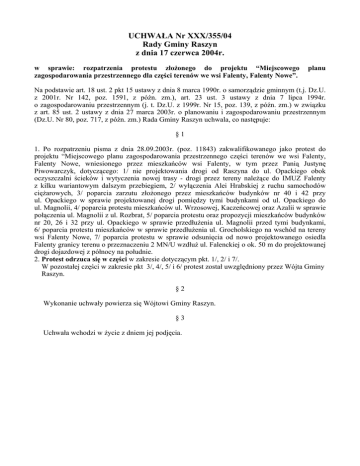 UCHWAŁA Nr XXX/355/04 Rady Gminy Raszyn z dnia 17 czerwca 2004r. w sprawie: rozpatrzenia protestu złożonego do projektu “Miejscowego zagospodarowania przestrzennego dla części terenów we wsi Falenty, Falenty Nowe”. planu Na podstawie art. 18 ust. 2 pkt 15 ustawy z dnia 8 marca 1990r. o samorządzie gminnym (t.j. Dz.U. z 2001r. Nr 142, poz. 1591, z późn. zm.), art. 23 ust. 3 ustawy z dnia 7 lipca 1994r. o zagospodarowaniu przestrzennym (j. t. Dz.U. z 1999r. Nr 15, poz. 139, z późn. zm.) w związku z art. 85 ust. 2 ustawy z dnia 27 marca 2003r. o planowaniu i zagospodarowaniu przestrzennym (Dz.U. Nr 80, poz. 717, z późn. zm.) Rada Gminy Raszyn uchwala, co następuje: §1 1. Po rozpatrzeniu pisma z dnia 28.09.2003r. (poz. 11843) zakwalifikowanego jako protest do projektu “Miejscowego planu zagospodarowania przestrzennego części terenów we wsi Falenty, Falenty Nowe, wniesionego przez mieszkańców wsi Falenty, w tym przez Panią Justynę Piwowarczyk, dotyczącego: 1/ nie projektowania drogi od Raszyna do ul. Opackiego obok oczyszczalni ścieków i wytyczenia nowej trasy - drogi przez tereny należące do IMUZ Falenty z kilku wariantowym dalszym przebiegiem, 2/ wyłączenia Alei Hrabskiej z ruchu samochodów ciężarowych, 3/ poparcia zarzutu złożonego przez mieszkańców budynków nr 40 i 42 przy ul. Opackiego w sprawie projektowanej drogi pomiędzy tymi budynkami od ul. Opackiego do ul. Magnolii, 4/ poparcia protestu mieszkańców ul. Wrzosowej, Kaczeńcowej oraz Azalii w sprawie połączenia ul. Magnolii z ul. Rozbrat, 5/ poparcia protestu oraz propozycji mieszkańców budynków nr 20, 26 i 32 przy ul. Opackiego w sprawie przedłużenia ul. Magnolii przed tymi budynkami, 6/ poparcia protestu mieszkańców w sprawie przedłużenia ul. Grocholskiego na wschód na tereny wsi Falenty Nowe, 7/ poparcia protestu w sprawie odsunięcia od nowo projektowanego osiedla Falenty granicy terenu o przeznaczeniu 2 MN/U wzdłuż ul. Falenckiej o ok. 50 m do projektowanej drogi dojazdowej z północy na południe. 2. Protest odrzuca się w części w zakresie dotyczącym pkt. 1/, 2/ i 7/. W pozostałej części w zakresie pkt 3/, 4/, 5/ i 6/ protest został uwzględniony przez Wójta Gminy Raszyn. §2 Wykonanie uchwały powierza się Wójtowi Gminy Raszyn. §3 Uchwała wchodzi w życie z dniem jej podjęcia.