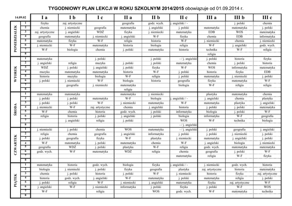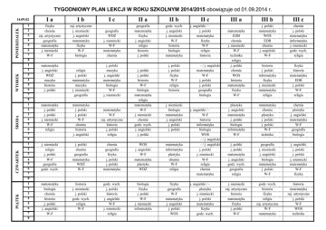 TYGODNIOWY PLAN LEKCJI W ROKU SZKOLNYM 2014/2015 obowiązuje od 01.09.2014 r. 14.09.02 PONIEDZIAŁEK 1 2 3 4 5 6 7 Ia Ib Ic II a II b fizyka chemia zaj. artystyczne geografia matematyka j. niemiecki W-F zaj. artystyczne j. niemiecki j. angielski matematyka fizyka W-F biologia geografia WDŻ j. niemiecki W-F matematyka chemia geografia matematyka fizyka j. angielski religia historia j. polski godz. wych. j. angielski j. niemiecki W-F historia biologia matematyka religia j. polski matematyka muzyka j. niemiecki geografia j. polski muzyka j. angielski matematyka biologia W-F j. niemiecki matematyka j. polski j. polski j. niemiecki W-F religia matematyka j. polski j. polski W-F chemia historia j. angielski matematyka W-F zaj. artystyczne historia j. polski religia j. polski j. polski historia W-F biologia matematyka religia matematyka W-F j. niemiecki chemia godz. wych. j. angielski j. polski j. niemiecki religia j. polski W-F geografia godz. wych. j. polski chemia geografia matematyka WDŻ W-F chemia geografia fizyka j. polski j. polski matematyka WOS j. angielski W-F matematyka plastyka WDŻ matematyka informatyka plastyka chemia W-F religia matematyka biologia chemia historia j. polski j. angielski W-F historia j. niemiecki j. polski godz. wych. religia W-F godz. wych. j. polski historia j. angielski W-F j. niemiecki religia biologia fizyka j. polski W-F j. niemiecki informatyka fizyka geografia W-F matematyka j. angielski j. polski WOS II c j. angielski / j. polski matematyka fizyka W-F religia historia 8 1 WTOREK 2 3 4 5 6 matematyka j. angielski WDŻ muzyka historia j. polski 7 8 1 ŚRODA 2 3 4 5 6 7 j. polski j. polski fizyka W-F religia historia j. niemiecki biologia matematyka j. angielski j. polski j. polski 8 CZWARTEK 1 2 3 4 5 6 7 - / j. angielski matematyka W-F j. polski j. polski geografia biologia j. angielski / W-F historia informatyka biologia WOS - / j. angielski - / j. angielski j. polski j. niemiecki W-F religia chemia matematyka III a III b III c matematyka EDB chemia j. niemiecki W-F technika religia j. polski chemia WOS historia matematyka fizyka W-F j. polski matematyka WOS EDB chemia j. angielski W-F chemia j. polski matematyka informatyka j. niemiecki godz. wych. religia historia j. polski informatyka fizyka j. niemiecki matematyka religia fizyka historia matematyka EDB j. polski W-F religia plastyka j. angielski matematyka j. polski biologia informatyka W-F matematyka chemia plastyka j. polski j. polski W-F technika chemia plastyka j. angielski matematyka W-F geografia biologia j. polski j. polski matematyka j. angielski godz. wych. geografia religia geografia j. niemiecki j. angielski biologia matematyka j. polski W-F j. angielski j. polski j. polski j. niemiecki matematyka W-F fizyka j. niemiecki zaj. artystyczne historia matematyka fizyka j. polski W-F godz. wych. historia fizyka religia zaj. artystyczne W-F matematyka historia matematyka zaj. artystyczne j. polski W-F WOS technika 8 1 PIĄTEK 2 3 4 5 6 7 8 j. angielski / plastyka j. niemiecki j. polski matematyka fizyka godz. wych.