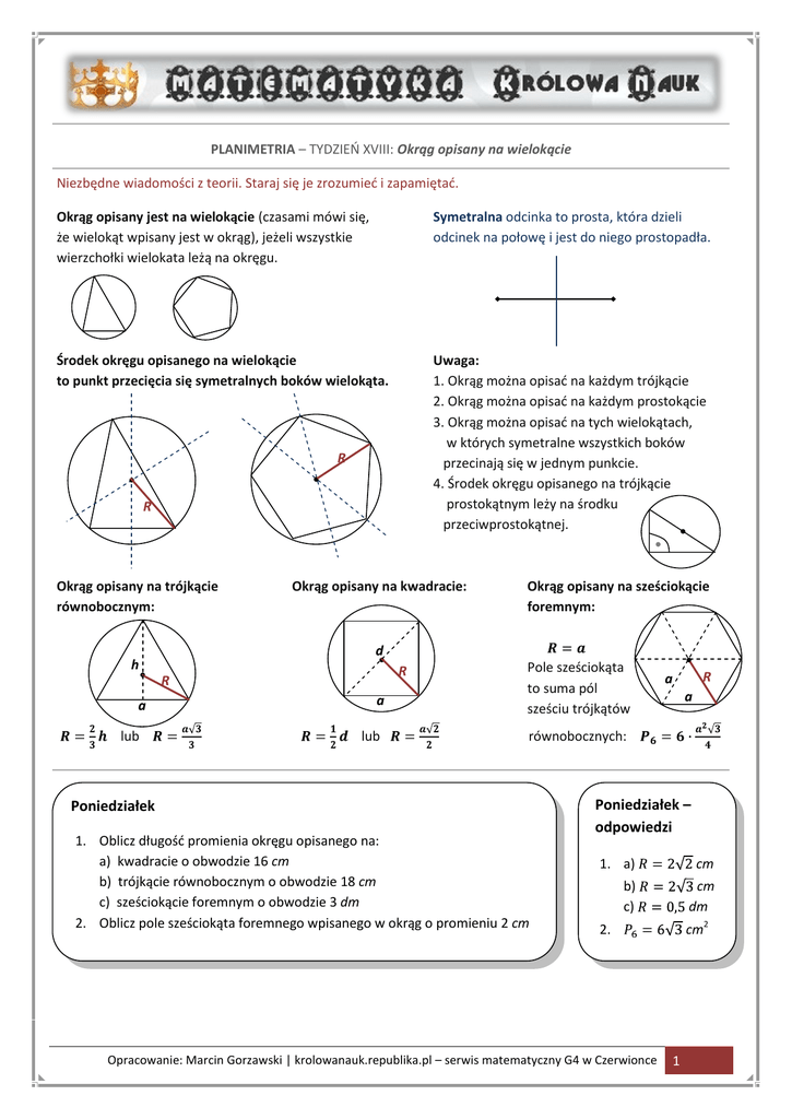 PLANIMETRIA – TYDZIEŃ XVIII: Okrąg opisany na wielokącie Niezbędne wiadomości z teorii. Staraj się je zrozumied i zapamiętad. Okrąg opisany jest na wielokącie (czasami mówi się, że wielokąt wpisany jest w okrąg), jeżeli wszystkie wierzchołki wielokata leżą na okręgu. Symetralna odcinka to prosta, która dzieli odcinek na połowę i jest do niego prostopadła. Środek okręgu opisanego na wielokącie to punkt przecięcia się symetralnych boków wielokąta. Uwaga: 1. Okrąg można opisad na każdym trójkącie 2. Okrąg można opisad na każdym prostokącie 3. Okrąg można opisad na tych wielokątach, w których symetralne wszystkich boków przecinają się w jednym punkcie. 4. Środek okręgu opisanego na trójkącie prostokątnym leży na środku przeciwprostokątnej. R R Okrąg opisany na trójkącie równobocznym: Okrąg opisany na kwadracie: d h R R a lub Okrąg opisany na sześciokącie foremnym: a lub Pole sześciokąta to suma pól sześciu trójkątów R a a równobocznych: Poniedziałek 1. Oblicz długośd promienia okręgu opisanego na: a) kwadracie o obwodzie 16 cm b) trójkącie równobocznym o obwodzie 18 cm c) sześciokącie foremnym o obwodzie 3 dm 2. Oblicz pole sześciokąta foremnego wpisanego w okrąg o promieniu 2 cm Poniedziałek – odpowiedzi 1. a) cm b) c) cm dm cm2 2. Opracowanie: Marcin Gorzawski | krolowanauk.republika.pl – serwis matematyczny G4 w Czerwionce 1 Wtorek 3. Oblicz długośd okręgu opisanego na kwadracie o polu 36 cm2 4. Oblicz pole trójkąta równobocznego wpisanego w okrąg o promieniu długości cm Wtorek – odpowiedzi 3. cm 4. cm2 Środa – odpowiedzi Środa 5. Oblicz pole zamalowanej figury, wiedząc, cm2 5. O że promieo koła ma długośd cm, a długośd jednej z przyprostokątnych wynosi 10 cm. Czwartek 6. Oblicz pole i obwód koła opisanego na prostokącie, w którym bok o długości cm tworzy z przekątną kąt o mierze 30 . Czwartek – odpowiedzi 6. cm2 cm Piątek – odpowiedzi Piątek β 7. Na ośmiokącie foremnym opisano okrąg (patrz rysunek). Wyznacz miarę kąta wewnętrznego α oraz miarę kąta β. α Sobota 8. Ustal, gdzie leży środek okręgu opisanego na trójkącie, w którym miary dwóch kątów wynoszą: a) 37 i 49 b) 56 i 69 c) 61 i 29 9. Oblicz miary kątów trójkąta ABC. a) b) A A 7. Sobota – odpowiedzi 9. a) 56 ; 56 ; 68 b) 50 ; 65 ; 65 40 112 112 C B 130 C B Opracowanie: Marcin Gorzawski | krolowanauk.republika.pl – serwis matematyczny G4 w Czerwionce 2