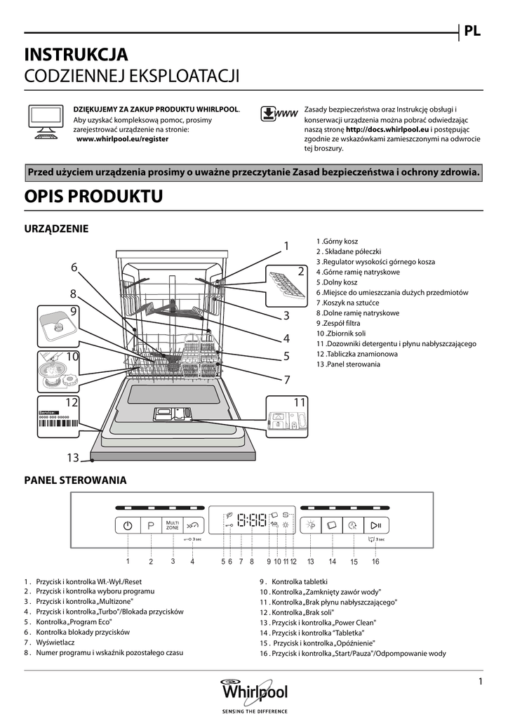 PL INSTRUKCJA CODZIENNEJ EKSPLOATACJI DZIĘKUJEMY ZA ZAKUP PRODUKTU WHIRLPOOL. Aby uzyskać kompleksową pomoc, prosimy zarejestrować urządzenie na stronie: www.whirlpool.eu/register Zasady bezpieczeństwa oraz Instrukcję obsługi i konserwacji urządzenia można pobrać odwiedzając naszą stronę http://docs.whirlpool.eu i postępując zgodnie ze wskazówkami zamieszczonymi na odwrocie tej broszury. Przed użyciem urządzenia prosimy o uważne przeczytanie Zasad bezpieczeństwa i ochrony zdrowia. OPIS PRODUKTU URZĄDZENIE 1 6 1 .Górny kosz 2 . Składane półeczki 3 .Regulator wysokości górnego kosza 4 .Górne ramię natryskowe 5 .Dolny kosz 6 .Miejsce do umieszczania dużych przedmiotów 7 .Koszyk na sztućce 8 .Dolne ramię natryskowe 9 .Zespół filtra 10 .Zbiornik soli 11 .Dozowniki detergentu i płynu nabłyszczającego 12 .Tabliczka znamionowa 13 .Panel sterowania 2 8 9 3 10 4 5 7 Service: 12 11 0000 000 00000 13 PANEL STEROWANIA 1 1. 2. 3. 4. 5. 6. 7. 8. 2 3 Przycisk i kontrolka Wł.-Wył./Reset Przycisk i kontrolka wyboru programu Przycisk i kontrolka „Multizone" Przycisk i kontrolka „Turbo"/Blokada przycisków Kontrolka „Program Eco" Kontrolka blokady przycisków Wyświetlacz Numer programu i wskaźnik pozostałego czasu 4 5 6 7 8 9 10 1112 13 14 15 16 9 . Kontrolka tabletki 10 . Kontrolka „Zamknięty zawór wody" 11 . Kontrolka „Brak płynu nabłyszczającego" 12 . Kontrolka „Brak soli" 13 . Przycisk i kontrolka „Power Clean" 14 . Przycisk i kontrolka “Tabletka” 15 . Przycisk i kontrolka „Opóźnienie" 16 . Przycisk i kontrolka „Start/Pauza"/Odpompowanie wody 1 PIERWSZE UŻYCIE SÓL DO ZMYWAREK, DODATKI DO PŁUKANIA I DETERGENT WSKAZÓWKI DOTYCZĄCE PIERWSZEGO UŻYCIA URZĄDZENIA Po zainstalowaniu urządzenia należy wyjąć ograniczniki z koszy oraz elastyczne elementy mocujące z górnego kosza. NAPEŁNIANIE DOZOWNIKA NABŁYSZCZACZA Płyn nabłyszczający ułatwia SUSZENIE naczyń. Dozownik płynu nabłyszczającego A powinien zostać napełniony, gdy kontrolka BRAK PŁYNU NABŁYSZCZAJĄCEGO świeci się na panelu sterowania. NAPEŁNIANIE ZBIORNIKA SOLI Zastosowanie soli zapobiega tworzeniu się KAMIENIA na naczyniach i funkcjonalnych podzespołach zmywarki. • Ważne jest, aby zbiornik soli nigdy nie był pusty • Ważne też jest odpowiednie ustawienie twardości wody. Zbiornik soli znajduje się w dolnej części zmywarki (patrz OPIS PROGRAMÓW), i powinien zostać napełniony, gdy na panelu sterowania świeci się kontrolka BRAK SOLI . 1 .Wyjąć dolny kosz i odkręcić korek zbiornika (w kierunku przeciwnym do ruchu wskazówek zegara). 2 .Umieścić lejek (patrz rys.) i wsypać sól aż do krawędzi zbiornika (około 1 kg); niewielki wyciek wody jest tu normalny. 3 .Wyjąć lejek i wytrzeć resztki soli wokół otworu. Upewnić się, czy korek jest mocno dokręcony, aby detergent nie mógł przedostać się do zbiornika podczas programu zmywania (mogłoby to spowodować nienaprawialne uszkodzenie zmiękczacza wody). Gdy trzeba dosypać soli, zalecamy przeprowadzenie tej czynności przed rozpoczęciem cyklu zmywania. USTAWIENIE TWARDOŚCI WODY Aby zmiękczacz wody działał idealnie, istotne jest ustawienie twardości wody na podstawie rzeczywistej twardości doprowadzanej wody. Tę informację można uzyskać od lokalnego dostawcy wody. Ustawienie fabryczne odnosi się do wody o średniej (3) twardości. 1 . Włączyć urządzenie, naciskając przycisk WŁ./WYŁ. 2 . Wyłączyć urządzenie, naciskając przycisk WŁ./WYŁ. 3 . Przytrzymać przycisk START/PAUZA przez 5 sekund, aż będzie słychać sygnał dźwiękowy. 4 . Włączyć urządzenie, naciskając przycisk WŁ./WYŁ. 5 . Wybrany aktualnie numer poziomu twardości oraz kontrolka „Brak soli" migają jednocześnie. 6 . Wcisnąć przycisk P, by wybrać żądany poziom twardości (patrz Tabela twardości wody). Tabela twardości wody °fH °dH Poziom St. niemieckie St. francuskie 1 Miękka 0-6 0 - 10 2 Średnia 7 - 11 11 - 20 3 Przeciętna 12 - 17 21 - 30 4 Twarda 17 - 34 31 - 60 5 Bardzo twarda 35 - 50 61 - 90 7 . Wyłączyć urządzenie, naciskając przycisk WŁ./WYŁ. Ustawienie zostało wykonane! Po zakończeniu tych czynności włączyć program bez wkładania naczyń. Należy stosować wyłącznie taką sól, która jest specjalnie przeznaczona do zmywarek. Po wsypaniu soli do zmywarki kontrolka BRAK SOLI gaśnie. Jeśli zbiornik soli nie zostanie napełniony, zmiękczacz wody i element grzejny mogą z tego powodu ulec uszkodzeniu. 2 35 25 MA X B A 1 . Otworzyć dozownik B, naciskając i podnosząc klapkę na pokrywce. 2 . Ostrożnie wlewać płyn nabłyszczający, aż do kreski oznaczającej maksymalny poziom napełnienia (110 ml) - unikać rozlania płynu. Jeśli tak się stanie, należy natychmiast wytrzeć rozlany płyn suchą szmatką. 3 . Zatrzasnąć pokrywkę. NIGDY nie wlewać płynu nabłyszczającego bezpośrednio do komory zmywarki. REGULACJA DOZOWANIA NABŁYSZCZACZA Jeśli rezultaty suszenia nie są w pełni zadowalające, można wyregulować dozowanie używanego płynu nabłyszczającego. • Włączyć zmywarkę za pomocą przycisku WŁ./WYŁ. • Wyłączyć urządzenie za pomocą przycisku WŁ./WYŁ. • Nacisnąć trzykrotnie przycisk P - będzie słychać sygnał dźwiękowy. • Włączyć ją za pomocą przycisku WŁ./WYŁ. • Miga wybrany aktualnie numer poziomu twardości oraz kontrolka „Brak nabłyszczacza”. • Nacisnąć przycisk P, aby wybrać poziom dozowania płynu nabłyszczającego. • Wyłączyć urządzenie za pomocą przycisku WŁ./WYŁ. Ustawienie zostało wykonane! Jeśli poziom dozowania płynu nabłyszczającego został ustawiony na 1(ECO), płyn nabłyszczający nie będzie dozowany. Kontrolka BRAK PŁYNU NABŁYSZCZAJĄCEGO nie będzie świecić, jeśli zabraknie płynu nabłyszczającego. Można ustawić maksymalnie 4 poziomy, zależnie od modelu zmywarki. Ustawienie fabryczne odnosi się do średniego poziomu dozowania. • Jeśli