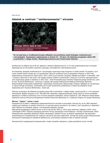 2011-07-21 Gdańsk w centrum ""zainteresowania"" wirusów Po raz pierwszy w środkowej Europie odbędzie się prestiżowy zjazd biologów molekularnych i wirusologów. Sympozjum zaplanowano w dniach 22 - 29 lipca. Do Gdańska przyjedzie około 500 uczestników z całego świata. Współorganizatorem jest Uniwersytet Gdański. Konferencja ta odbywa się od 35 lat, głównie w Stanach Zjednoczonych, co 3-4 lata organizowana jest w Europie. Spotykają się na niej wybitni naukowcy zajmujący się badaniami nad herpeswirusami. W środowisku biologów molekularnych i wirusologów organizacja tego kongresu to wielki prestiż. W związku z tym rożne ośrodki latami starają się o to wyróżnienie. Obecnie wybierany jest już gospodarz imprezy w 2015 roku. Organizatorzy wydarzenia w latach 2012, 2013, 2014 są już wybrani, kongresy odbędą sie kolejno: w Kanadzie, USA i w Japonii. Było więc to dla mnie i dla mojego zespołu wielkim wyróżnieniem, kiedy już 5 lat temu zaproponowano nam organizację zjazdu w Gdańsku w 2011 roku - mówi Przewodnicząca Komitetu Organizacyjnego konferencji, prof. dr hab. Krystyna Bieńkowska - Szewczyk z katedry Wirusologii Molekularnej Międzyuczelnianego Wydziału Biotechnologii Uniwersytetu Gdańskiego i Gdańskiego Uniwersytetu Medycznego. Kongres odbędzie po raz pierwszy w rejonie Europy Centralnej i traktowane jest to jako wydarzenie przełomowe w historii tej dziedziny nauki dopowiada prof. Krystyna Bieńkowska - Szewczyk. Podczas sympozjum do Gdańska przyjedzie około 500 uczestników z całego świata, zazwyczaj 60 % z nich stanowią Amerykanie. Budżet kongresu to ok. 450 000 USD. Naukowcy będą prezentować swoje wyniki w formie wykładów plenarnych i krótkich prezentacji oraz w formie posterów (plakatów), których będzie ok. 320. Miejscem obrad będzie Gdańskie Centrum Muzyczno-Kongresowe Polskiej Filharmonii Bałtyckiej im. Fryderyka Chopina na wyspie Ołowianka. Wirusy ""żyjące"" razem z nami Herpeswirusy to jedne z najbardziej rozpowszechnionych wirusów w przyrodzie. Szacuje się, że ok. 80% populacji ludzkiej jest zakażone w sposób chroniczny co najmniej dwoma wirusami z tej rodziny, choć najczęściej u większości ludzi infekcja ma charakter utajony i nie powoduje objawów choroby. Najczęściej występujące ludzkie wirusy to wirus opryszczki (HSV-1), wirus ospy wietrznej i półpaśca (VZV), wirus cytomegalii (CMV). Rzadziej występują pokrewne wirusy powodujące mononukleozę i choroby nowotworowe. Wiele herpeswirusów powoduje zakażenia układu nerwowego, niektóre wirusy są wielkim zagrożeniem dla pacjentów przechodzących transplantacje lub mających obniżoną naturalną odporność. Istnieje też wielka grupa herpeswirusów zwierzęcych powodujących zakażenia epidemiczne, przynoszące poważne straty w hodowli zwierząt. Powszechność występowania herpeswirusów, trwały charakter zakażenia, częste powikłania innych chorób 1 spowodowane przez aktywację zakażenia wirusowego w czasie obniżenia odporności powodują, że na całym świecie tysiące naukowców pracuje nad wyjaśnieniem mechanizmów funkcjonowania tych wirusów, przebiegu zakażenia, reakcji immunologicznej wywoływanej przez infekcję oraz nad poszukiwaniem leków i opracowywaniem szczepionek przeciw herpeswirusom. W ciągu ostatnich dziesięcioleci osiągnięto ogromny postęp w badaniach nad herpeswirusami, opracowano nowe leki (np. acyklovir przeciw wirusowi opryszczki), wprowadzono do powszechnego użytku szczepionkę przeciwko ospie wietrznej, a ostatnio przeciwko półpaścowi. Trwają też intensywne prace nad zastosowaniem zmodyfikowanych, nieaktywnych wirusów m.in. w terapii nowotworów mózgu. Autor MW 2