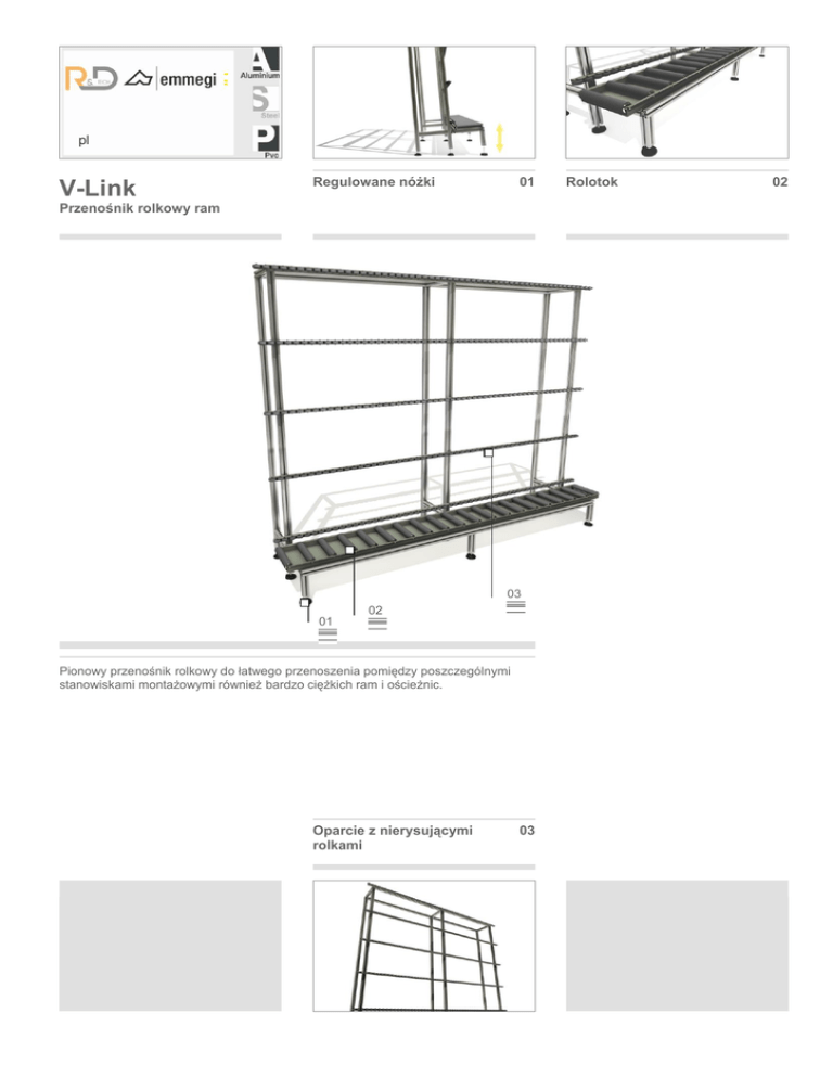 pl V-Link Regulowane nóżki 01 Przenośnik rolkowy ram 03 02 01 Pionowy przenośnik rolkowy do łatwego przenoszenia pomiędzy poszczególnymi stanowiskami montażowymi również bardzo ciężkich ram i ościeżnic. Oparcie z nierysującymi rolkami 03 Rolotok 02 V-Link Przenośnik rolkowy ram 01 02 03 Regulowane nóżki Rolotok Oparcie z nierysującymi rolkami Regulowane na wysokość nóżki zapewniają prawidłowe ustawienie żądanej wysokości stołu roboczego, a także wymagane nachylenie w zakresie od 85° do 90°. Umożliwiają dodatkowo zamocowanie maszyny do podłoża poprzez wykorzystanie specjalnych otworów. Dolny rolotok, który można ustawić na wysokości od 320 do 360 mm od ziemi podtrzymuje ościeżnicę i zapewnia jej łatwe przesuwanie. Pięć rzędów rolek zamontowanych na trzonie przytrzymuje ościeżnicę dosuniętą do nachylonego oparcia i umożliwia bezpieczne przenoszenie nawet bardzo ciężkich ościeżnic. DANE TECHNICZNE Wysokość stołu rolkowego (mm) 320 360 85 90 Powierzchnie kontaktu pokryte miękkim PVC Regulowane nachylenie oparcia z rolkami (°) ● Nośność (kg) 200 Długość (mm) 3000 Wysokość (mm) 2165 3015 Szerokość (mm) 870 Waga (kg) 100 2009/10/05 www.randdtech.pl