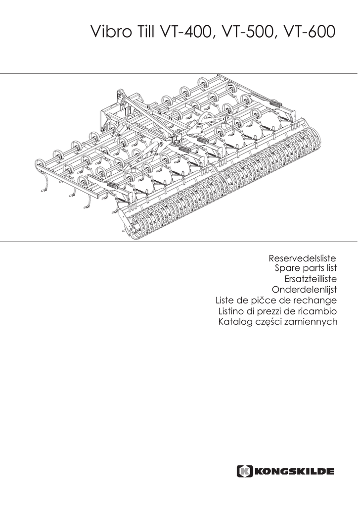 Vibro Master Vt3000 Vibro Till VT-400, VT-500, VT-600 Reservedelsliste Spare parts list Ersatzteilliste Onderdelenlijst Liste de pičce de rechange Listino di prezzi de ricambio Katalog części zamiennych Tab. 1 54 53 44 35 44 44 55 7 9 10 8 11 12 44 50 49 38 31 4 1 6 43 4 4 17 16 12 38 15 6 48 20 45 2 3 18 20 5 30 2 20 19 19 18 5 Spare parts list / Vibro Till Date: 2013.04 Fig. Serial no. Part no. Pieces Tab. 1 Notes 1 2 2 2 2 300163200 300163800 300164100 300164300 300210900 Centre frame Wing Wing Wing Wing Rama centralna Skrzydło VS400 lewe Skrzydło VS500 lewe Skrzydło VS600 lewe Skrzydło VS800 lewe VS-400 LH VS-500 LH VS-600 LH VS-800 LH 3 3 3 3 4 300163700 300163900 300164200 300211100 71208112006 Wing Wing Wing Wing Spring bolt Skrzydło VS400 prawe Skrzydło VS500 prawe Skrzydło VS600 prawe Skrzydło VS800 prawe Sworzeń smar. z nakr. VS-400 RH VS-500 RH VS-600 RH VS-800 RH 30x170 5 6 7 8 9 7203302031 300004063 300377100 300007733 200215446 Spring bolt Spring bolt Support Plate Bolt Sworzeń smar. z nakr. Sworzeń smar. z nakr. Wspornik kozła Płytka wspornika Śruba 30x150 30x180 10 11 12 13 14 300332009 300316023 300003694 100323031 300315011 Washer Lock nut Wing lock hook Hex bolt Nut Podkładka zw. Nakrętka sam. Hak blokady skrzydeł Śruba 6-kt Nakrętka zw. 15 16 17 18 19 7203307007 300189400 7202001001 300187700 300004147 U-bolt Pulley holder Pulley Wing lock holder Flatbar Jarzmo Trzymak rolek Krążek Trzymak blokady skrzydeł Nakładka 20 30 31 32 35 300316021 100414018 300003699 300003906 7201003058 Lock nut Plastic plug Lower pin cat.2-3 Upper pin cat.2-3 Bolt Cat. II d19 L120 Nakrętka sam. Zaślepka Sworzeń dolny kat.2-3 Sworzeń górny kat.2-3 Sworzeń Kat. II d 25 L120 37 38 43 44 45 300001990 300332037 300002074 300323046 300332008 Pin Washer String Linch pin Washer Sworzeń Podkładka zw. Linka Przetyczka z pier. zab. Podkładka zw. 48 49 50 53 54 300304239 300332027 300316020 71000186791 300004292 Cylinder screw Washer Lock nut Pin Pin Śruba imb. Podkładka Nakrętka sam. Sworzeń Sworzeń 55 300004293 Bushing Tulejka DIN 931 M16x150 DIN 126 DIN 985 M16 M16 DIN 933 DIN 934 M24x70 M24 M12x101x125 DIN 985 M12 100X50X6 DIN 126 25x144 M30 DIN 126 11x45 M12 DIN 912 DIN 126 DIN 985 M10x35 M10 M10 Cat. 3 Cat. 2 Cat. 2 3 Tab. 2 12 31 30 12 1 24 24 14 10 13 24 19 4 16 10 8 12 19 2 9 11 8 7 21 15 9 6 3 20 21 10 20 19 22 22 8 7 33 9 21 22 20 14 5 24 10 12 19 14 3 8 5 7 9 16 32 13 14 24 16 10 24 21 10 20 22 12 12 6 19 6 19 8 21 3 20 22 4 13 13 4 9 16 34 8 9 35 21 3 20 22 Spare parts list / Vibro Till Date: 2013.04 Fig. Serial no. Part no. Pieces Tab. 2 Notes 1 2 3 4 5 300172500 300172400 300171900 300171800 300169600 Centre wheel arm Centre wheel arm Wheel arm (front+rear) Front wheel support wld. Rear wheel support Ramię koła środk. lewe Ramię koła środk. prawe Ramię koła (przód+tył) Trzymak kół przednich boczn. Trzymak kół tylnych LH RH 6 6 7 7 8 300172200 300172200P 300174800 300174800P 300003918 Wheel Wheel Wheel Wheel Wheel depth indicator Koło (lewe) Koło (lewe) Koło (prawe) Koło (lewe) Wskaźnik głębok. kół 18x9.50-8 4ply LH 18x9.50-8 4ply LH 18x9.50-8 4ply RH 18x9.50-8 4ply RH 9 10 11 12 13 700TT30579 300169700 300172100 300004066 300004237 Decal with scale Wheel adj. pin compl. Wheel adjustment tool Tube plug Plate Skala do regul. głębok. Przetyczka kół kompl. Dźwignia regulacji kół Zaślepka rury Nakładka 14 15 16 19 20 300316023 300333067 300304078 100334015 300003917 Lock nut Cotter pin Hex bolt POP rivet Wheel scraper Nakrętka sam. Zawleczka Śruba 6-kt Nit, zrywalny Skrobak koła DIN 985 DIN 11024 DIN 931 M16 B48 M16x110 4,8x10 21 22 23 24 30 300304043 300316020 300332027 300333065 300171500 Hex bolt Lock nut Washer Cotter pin Front centre wheel LH Śruba 6-kt Nakrętka sam. Podkładka zw. Zawleczka Koło przednie środk. lewe kpl. DIN 931 DIN 985 DIN 126 DIN 11024 M10x90 M10 M10 A71 air - tyre 30 31 31 32 32 300353500 300171400 300353800 300171300 300353300 Front centre wheel LH Front centre wheel RH Front centre wheel RH Front side wheel LH Front side wheel LH Koło przednie środk. lewe kpl. Koło przednie środk. prawe kpl. Koło przednie środk. prawe kpl. Koło przednie boczne lewe kpl. Koło przednie boczne lewe kpl. polyurethane - tyre air - tyre polyurethane - tyre air - tyre polyurethane - tyre 33 33 34 34 35 300171200 300353400 300171700 300353600 300171600 Front side wheel RH Front side wheel RH Rear side wheel LH Rear side wheel LH Rear side wheel RH Koło przednie boczne prawe kpl. Koło przednie boczne prawe kpl. Koło tylne boczne lewe kpl. Koło tylne boczne lewe kpl. Koło tylne boczne prawe kpl. air - tyre polyurethane - tyre air - tyre polyurethane - tyre air - tyre 35 300353700 Rear side wheel RH Koło tylne boczne prawe kpl. polyurethane - tyre air - tyre polyurethane - tyre air - tyre polyurethane - tyre 70x70x6 5 Tab. 3 8 13 18 7 14 15 16 2 3 1 9 5 11 12 6 6 5 4 10 6 Spare parts list / Vibro Till Date: 2013.04 Fig. Serial no. Part no. Pieces Tab. 3 Notes 1 2 3 4 5 300332008 300316021 300004147 200215446 300332009 Washer Lock nut Flatbar Bolt Washer 6 7 8 9 10 300316023 373367200 373367300 373366700 373007598 Lock nut Arm holder Arm Bolt Depth limiter 11 12 13 14 15 373007606 300323045 300304078 373007604 300304067 Plate Linch pin Bolt Distance bushing Bolt 16 17 18 1-18 300304034 300332027 300316020 373367400 Bolt Washer Lock nut Depth adjustment arm compl. DIN126 DIN985 M12 M12 DIN931 DIN126 M16x150 M16 DIN985 M16 25x75 DIN931 4.2x27 M16x110 DIN931 M12x90 DIN933 DIN126 DIN985 M10x30 M10 M160 7 Tab. 4 26 6 10 9 7 25 5 8 6 30 13 14 15 11 8 3 1 17 28 16 8 10 12 23 9 10 9 18 2 7 10 27 20 8 9 27 7 29 4 21 24 17 25 22 27 8 Spare parts list / Vibro Till Date: 2013.04 Fig. Serial no. Part no. Pieces Tab. 4 Notes 1 2 3 4 5 300173900 300174100 300174200 300174300 300064233 Parallelogram upper arm Parallelogram lower arm Parallel. Holder Parallel. Holder Spring Rura górna równoległ. Rura dolna równoleg