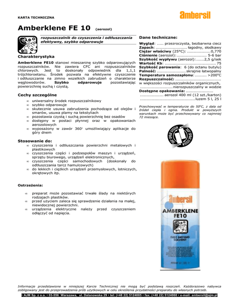 ambersil KARTA TECHNICZNA Amberklene FE 10 (aerozol) rozpuszczalnik do czyszczenia i odtłuszczania efektywny, szybko odparowuje Charakterystyka Amberklene FE10 stanowi mieszaninę szybko odparowujących rozpuszczalników. Nie zawiera CFC ani rozpuszczalników chlorowych. Jest to doskonały odpowiednik dla 1,1,1 trójchloroetanu. Środek pozwala na efektywne czyszczenie i odtłuszczanie na zimno wszelkich zabrudzeń o charakterze węglowodorów. Szybko odparowuje pozostawiając powierzchnię suchą i czystą. Cechy szczególne • • • • • • uniwersalny środek rozpuszczalnikowy szybko odparowuje skutecznie usuwa zabrudzenia pochodzące od olejów i smarów, usuwa plamy na tekstyliach pozostawia czystą i suchą powierzchnię bez osadów dostępny w postaci płynnej oraz w opakowaniach aerozolowych wyposażony w zawór 360° umożliwiający aplikacje do góry dnem Dane techniczne: Wygląd: ..... przezroczysta, bezbarwna ciecz Zapach: ........................ łagodny, słodkawy Ciężar właściwy (25°C): ..................0,770 Ciśnienie (aerozol):....................... 5-6 bar Szybkość wypływu (aerozol):......2,5 g/sek Wartość Kb: ....................................... 75 Szybkość parowania: 6 (do octanu butylu) Palność: ...................... skrajnie łatwopalny Temperatura samozapłonu: ......... >200oC Rozpuszczalność: ................................... w większości rozpuszczalników organicznych, ......................... nierozpuszczalny w wodzie Dostępne opakowania: ..................... .................. aerozol 400 ml (12 szt./karton) .......................................... luzem 5 l, 25 l Przechowywać w temperaturze do 50oC, z dala od źródeł ciepła i ognia. Produkt w powyższych warunkach może być przechowywany co najmniej 72 miesiące. Stosowanie do: • • • • czyszczenia i odtłuszczania powierzchni metalowych i plastikowych czyszczenia części i podzespołów maszyn i urządzeń, sprzętu biurowego, urządzeń elektronicznych, czyszczenia części samochodowych (doskonały do odtłuszczania tarcz hamulcowych) do lekkich i ciężkich urządzeń przemysłowych, lotniczych, okrętowych itp. Ostrzeżenia: • • • preparat może pozostawiać trwałe ślady na niektórych rodzajach plastików. przed użyciem zaleca się sprawdzenie działania na małej, niewidocznej powierzchni. urządzenia elektryczne należy przed czyszczeniem odłączyć od napięcia. Informacje przedstawione w niniejszej Karcie Technicznej nie mogą być podstawą roszczeń. Każdorazowo nabywca zobligowany jest do przeprowadzenia prób użytkowych w celu określenia przydatności preparatu do własnych potrzeb. • AJM Sp. z o.o. • 03-556 Warszawa, ul. Dalanowska 29 • tel: (+48 22) 5124085 • fax: (+48 22) 5124060 • e-mail: [email protected]