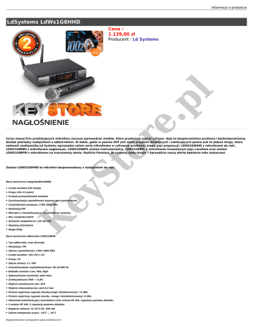 Informacje o produkcie LdSystems LdWs1G8HHD Cena : 1.139,00 zł or e. pl Producent : Ld Systems St Coraz więcej firm produkujących mikrofony zaczyna wprowadzać modele, które przekazują sygnał cyfrowo -daje to bezpieczeństwo przekazu i bezkompromisowy dźwięk pomiędzy nadajnikiem a odbiornikiem. W dobie, gdzie w pasmie UHF jest wiele urządzeń działających i zakłócających pasma jest to jedyna droga, która zadowoli użytkownika.Ld Systems wprowadza zatem serię mikrofonów w cyfrowym przekazie: mamy pięć propozycji: LDWS1G8HHD z mikrofonem do ręki, LDWS1G8BBH z mikrofonem nagłownym, LDWS1G8BPG zestaw instrumentalny, LDWS1G8BPL z mikrofonem krawatowym typu Lavaliere oraz zestaw LDWS1G8BPW z mikrofonem na instrumenty dente. Myślicie Państwo, że systemy będą drogie ? Sprawdźcie naszą ofertę będziecie mile zaskoczeni. Zestaw LDWS1G8HHD to mikrofon bezprzewodowy z nadajnikiem do ręki. Dane techniczne nadajnikaWS1G8MD. Liczba kanałów:192 kanały ● Grupy (16x 12 pasm) ● Funkcja przeszukiwania kanałów ● Synchronizacja częstotliwości poprzez port podczerwieni ● Częstotliwości przekazu: 1785-1800 MHz ● Modulacja:FM ● Mikrofon o charakterystyce :kardioidalnej /wokalny ● Moc nadajnika:10mV ● Zasilanie nadajnika:2x 1,5V AA LR6 ● Wymiary:252x52mm ● Waga:220g K ey ● Dane techniczne odbiornika LDWS1GR8R ● Typ odbiornika: true diversity ● Modulacja: FM ● Zakres częstotliwości: 1785–1800 MHz ● Liczba kanałów: 192 (16 x 12) ● Grupy: 16 ● Złącza anteny: 2 x TNC ● Charakterystyka częstotliwościowa: 50–16.000 Hz ● Blokada szumów: Low, Mid, High ● Optymalizacja transmisji: pilot tone ● Zniekształcenia THD: < 0,8% ● Wyjście symetryczne mix: XLR ● Wyjście niesymetryczne: jack 6,3 mm ● Poziom wyjściowy sygnału akustycznego (zbalansowany): +6 dBu ● Poziom wyjściowy sygnału akusty- cznego (niezbalansowany): 0 dBu ● Wskaźniki:wielofunkcyjny wyświetlacz LCD, antena HF A/B, regulacja poziomu dźwięku ● 2 anteny HF A/B, 2 regulacje poziomu dźwięku ● Napięcie robocze: 12–18 V DC, 500 mA ● Zakres temperatur pracy: -10°C … 45°C Wygenerowano w programie www.oscGold.com ● Wymiary : 212x45x163 mm ● Waga: 0,92 kg Wychodząc naprzeciw naszym klientom z przyjemnością informujemy, że do każdego zakupionego zestawu bezprzewodowego, nasza firma dodaje w prezencie kartę stałego klienta na wykorzystanie softu muzycznego, najlepszego producenta firmy Midi Net o wartości 200 zł Zapoznaj się z naszą propozycją, lepszej i tak nie znajdziesz. [email protected] K ey St or e. pl Zobacz film o produkcie:
