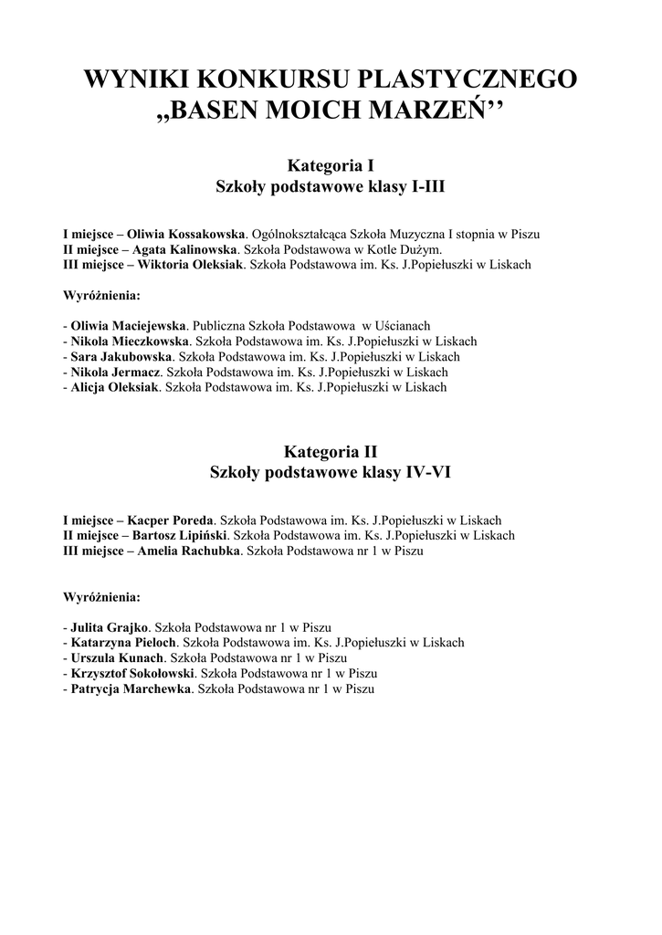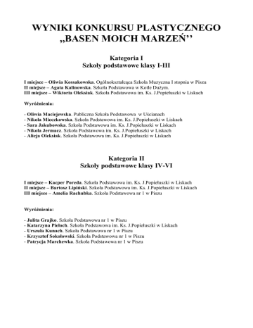 WYNIKI KONKURSU PLASTYCZNEGO ,,BASEN MOICH MARZEŃ’’ Kategoria I Szkoły podstawowe klasy I-III I miejsce – Oliwia Kossakowska. Ogólnokształcąca Szkoła Muzyczna I stopnia w Piszu II miejsce – Agata Kalinowska. Szkoła Podstawowa w Kotle Dużym. III miejsce – Wiktoria Oleksiak. Szkoła Podstawowa im. Ks. J.Popiełuszki w Liskach Wyróżnienia: - Oliwia Maciejewska. Publiczna Szkoła Podstawowa w Uścianach - Nikola Mieczkowska. Szkoła Podstawowa im. Ks. J.Popiełuszki w Liskach - Sara Jakubowska. Szkoła Podstawowa im. Ks. J.Popiełuszki w Liskach - Nikola Jermacz. Szkoła Podstawowa im. Ks. J.Popiełuszki w Liskach - Alicja Oleksiak. Szkoła Podstawowa im. Ks. J.Popiełuszki w Liskach Kategoria II Szkoły podstawowe klasy IV-VI I miejsce – Kacper Poreda. Szkoła Podstawowa im. Ks. J.Popiełuszki w Liskach II miejsce – Bartosz Lipiński. Szkoła Podstawowa im. Ks. J.Popiełuszki w Liskach III miejsce – Amelia Rachubka. Szkoła Podstawowa nr 1 w Piszu Wyróżnienia: - Julita Grajko. Szkoła Podstawowa nr 1 w Piszu - Katarzyna Pieloch. Szkoła Podstawowa im. Ks. J.Popiełuszki w Liskach - Urszula Kunach. Szkoła Podstawowa nr 1 w Piszu - Krzysztof Sokołowski. Szkoła Podstawowa nr 1 w Piszu - Patrycja Marchewka. Szkoła Podstawowa nr 1 w Piszu