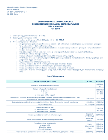 Chrześcijańska Służba Charytatywna Filia w Koninie ul. Zofii Urbanowskiej 4 62-500 Konin SPRAWOZDANIE Z DZIAŁALNOŚCI CHRZEŚCIJAŃSKIEJ SŁUŻBY CHARYTATYWNEJ Filia w Koninie rok 2004 1. Liczba pracujących wolontariuszy - 2 osoby. 2. Godziny poświęcone pracy w filii: o wartość godzin pracy w filii: 2 388 godz. × 5 zł = 11 940 zł Prowadzone projekty i działania: o Zorganizowanie spotkania pt.: Przemoc w rodzinie - jak sobie z tym poradzić i gdzie szukać pomocy - prelegent terapeuta rodzinny - Barbara Niemczewska, o Zorganizowanie spotkania pt.: Jak budować zdrowe poczucie własnej wartości? - prelegent - terapeuta rodzinny Barbara Niemczewska, o Prowadzenie poradnictwa w zakresie promocji zdrowego stylu życia wraz z wypożyczalnią literatury, o Dystrybucja odzieży dla najuboższych, o Bieżące zakupy dla najuboższych (żywność, leki, inne-gaz, bilety, węgiel), o Dystrybucja żywności w ramach programu PEAD (pomoc żywnościowa dla najuboższych z Unii Europejskiej)- tym programem objęto 169 rodzin o Wyprawki szkolne -102 komplety szkolne, o Remonty mieszkań dla dwóch samotnych matek (z 2 dzieci i z 3 dzieci), o Paczki żywnościowe w okresie Wielkanocnym - przekazano 91 paczek, o Paczki żywnościowe w okresie Bożego Narodzenia - przekazano 20 paczek, o Przekazanie darowizn potrzebującym: sprzęt AGD, mebli, foteli, wózków dziecięcych, środki chemiczne, pampersy i inne, 3. Część finansowa PROWADZONE DZIAŁANIA ILOŚĆ WARTOŚĆ Dystrybucja odzieży dla najuboższych 10735.00 zł Bieżące zakupy dla najuboższych: a) żywność b) leki c) inne (gaz, bilety, węgiel) 1039.90zł 691.01zł 246.65zł Dystrybucja żywności w ramach programu PEAD (pomoc żywnościowa dla najuboższych z Unii Europejskiej)- tym programem objęto 169 rodzin 1620.00kg 17425.00zł Dystrybucja żywności otrzymywanej z Konińskiego Banku Żywności w ramach współpracy 1848.28kg 4729.09zł Wyprawki szkolne 102 komplety 2760.90zł Remonty mieszkań dla: a) samotnej matki z 2 dzieci b) samotnej matki z 3 dzieci 750.74 zł 502.00zł Paczki żywnościowe w okresie Wielkanocnym 91 paczek (449.00kg) 1347.00zł Paczki żywnościowe w okresie Bożego Narodzenia 20 paczek (90kg) 270.00zł Pośredniczenie w przekazaniu: a) sprzęt AGD b) meble, fotele c) wózki dziecięce 2 szt. 1 kom.,2szt. 5 szt. 200.00 zł 500.00 zł 500.00 zł Współpraca ze sponsorem - sieć handlowa; (art. chemiczne, pampersy i inne) 301.50kg 2473.80zł Praca wolontariuszy; a) w filii b) przy remoncie mieszkań 2298godz.x5zł 11490.00zł 90godz.x5zł 450.00 zł W filii zarejestrowanych jest 325 rodzin, które systematycznie korzystają z pomocy. Z pomocy skorzystało łącznie ...osób. Łączna wartość udzielonej pomocy 56 111,09 zł "Nie wzbraniaj się czynić dobrze potrzebującemu, jeżeli to leży w twojej mocy."(Przypowieści Salomona 3,27) Dorota Skąpska Kierownik filii ChSCh w Koninie