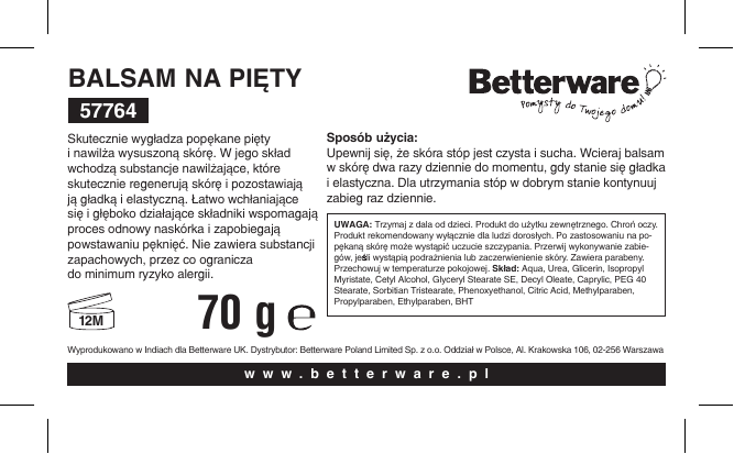 Balsam na pięty 57764 Skutecznie wygładza popękane pięty i nawilża wysuszoną skórę. W jego skład wchodzą substancje nawilżające, które skutecznie regenerują skórę i pozostawiają ją gładką i elastyczną. Łatwo wchłaniające się i głęboko działające składniki wspomagają proces odnowy naskórka i zapobiegają powstawaniu pęknięć. Nie zawiera substancji zapachowych, przez co ogranicza do minimum ryzyko alergii. 12M 70 g Sposób użycia: Upewnij się, że skóra stóp jest czysta i sucha. Wcieraj balsam w skórę dwa razy dziennie do momentu, gdy stanie się gładka i elastyczna. Dla utrzymania stóp w dobrym stanie kontynuuj zabieg raz dziennie. UWAGA: Trzymaj z dala od dzieci. Produkt do użytku zewnętrznego. Chroń oczy. Produkt rekomendowany wyłącznie dla ludzi dorosłych. Po zastosowaniu na popękaną skórę może wystąpić uczucie szczypania. Przerwij wykonywanie zabiegów, jeśli wystąpią podrażnienia lub zaczerwienienie skóry. Zawiera parabeny. Przechowuj w temperaturze pokojowej. Skład: Aqua, Urea, Glicerin, Isopropyl Myristate, Cetyl Alcohol, Glyceryl Stearate SE, Decyl Oleate, Caprylic, PEG 40 Stearate, Sorbitian Tristearate, Phenoxyethanol, Citric Acid, Methylparaben, Propylparaben, Ethylparaben, BHT Wyprodukowano w Indiach dla Betterware UK. Dystrybutor: Betterware Poland Limited Sp. z o.o. Oddział w Polsce, Al. Krakowska 106, 02-256 Warszawa w w w . b e t t e r w a r e . p l