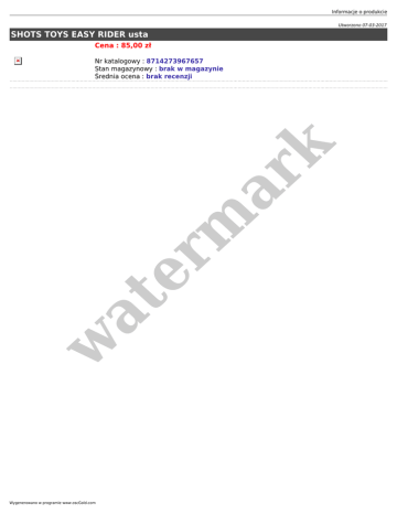 Informacje o produkcie Utworzono 07-03-2017 SHOTS TOYS EASY RIDER usta Cena : 85,00 zł w at er m ar k Nr katalogowy : 8714273967657 Stan magazynowy : brak w magazynie Średnia ocena : brak recenzji Wygenerowano w programie www.oscGold.com