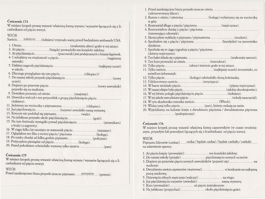 Ćwiczenie 174 W miejsce kropek proszę wstawić właściwą formę wyrazu / wyrazów łączących się z liczebnikami od pięciu wzwyż. WZÓR Sześciu ?9!1}.i.e.r?:y (żołnierz) trzymało wartę przed budynkiem ambasady USA. 1. Ośmiu (znakomity aktor) grało w tej sztuce. 2. Aż pięciu (ksiądz) prowadziło ten kondukt żałobny. 3. Aż pięćdziesięciu (pracownik) jest podejrzanych o branie łapówek. 4. Czekaliśmy na wiadomość o pięciu (zaginiony taternik). 5. Daliśmy nagrody pięćdziesięciu (najlepszy uczeń) w szkole. 6. Dlaczego przyglądasz się tym pięciu (chłopiec)? 7. Do naszej szkoły przyszło pięćdziesięciu (nowy uczeń). 8. Dopiero po przerwie pięciu (nowy zawodnik) pojawiło się na stadionie. 9. Dostałem prezenty od ośmiu (znajomy). 10. Dowódca walczył o ten przyczółek z grupą pięćdziesięciu pięciu . (żołnierz). 11. Jedziemy na wycieczkę z piętnastoma (chłopiec). 12. Już pięćdziesięciu (turysta) zwiedziło naszą wystawę. 13. Koncert nie podobał się piętnastu (widz). 14. Na jubileusz przyszło około pięćdziesięciu (gość). 15. Na tym festiwalu wystąpiło ponad pięćdziesięciu (piosenkarz) z kraju i z zagranicy. 16. W ciągu kilku lat usunięto ze stanowisk pięciu (minister). 17. Oglądałem ten film z moimi pięciu/ pięcioma (kolega). 18. Po rynku chodzi od kilku godzin piętnastu (policjant). 19. Pożyczyłem pieniądze od pięciu (kolega). 20. Przed południem odwiedziło wystawę tylko sześciu (pan). Ćwiczenie 175 W miejsce kropek proszę wstawić właściwą formę wyrazu / wyrazów łączących się z liczebnikami od pięciu wzwyż. WZÓR P rze d za mknieci . . ęClem b'lura przysz ło Jeszcze piętnastu . . .. petentów (petent ) . l. Przed zamknięciem biura przyszło jeszcze ośmiu . (zdenerwowany klient). 2. Razem z ośmiu/ ośmioma (kolega) wybieramy się na wycieczkę w góry. 3. Rozmawiał długo z pięciu / pięcioma (mężczyzna). 4. Rozmawiałem dzisiaj z pięciu / pięcioma . (interesujący człowiek). 5. Skończyłem wykłady z piętnastu / piętnastoma (student). 6. Spotkałem się z pięciu / pięcioma (kandydat) na stanowisko dyrektora. 7. Spotkała się w ciągu tygodnia z pięciu / pięcioma . (dziwny mężczyzna). 8. Ten balet składa się z piętnastu (znakomity tancerz). 9. Ten kurs prowadzi aż ośmiu (instruktor). 10. Tylko pięciu (aktor) świetnie grało w tej sztuce. 11. Tylko sześciu (najlepszy uczeń) zrozumiało, co mówił ten informatyk 12. Tylko pięciu (kolega) odwiedziło chorą koleżankę. 13. Udekorowano sześciu (zwycięzca). 14. W barze siedziało pięciu (pijany mężczyzna). 15. W naszej ekipie było pięciu (zdolny obcokrajowiec). 16. W tej bitwie poległo pięćdziesięciu pięciu (żołnierz). 17. W tej szkole zatrudniono pięciu (młody nauczyciel). 18. W tym akademiku mieszka sześciu (Włoch). 19. Widzę tutaj tylko pięciu (pan), którzy czekają na mnie. 20. Wyjeżdżamy na kolonie letnie z dwudziestu pięcioma / dwudziestoma pięcioma . (podopieczny). Ćwiczenie 176 W miejsce kropek proszę wstawić właściwą formę czasowników (w czasie teraźniejszym, przyszłym lub przeszłym) łączących się z liczebnikami od pięciu wzwyż. WZÓR Piętnastu klientów (czekać) .... ~~~~fl/ na załatwienie sprawy. ~ę~.* .c.z.e.~a.ć)~.ę.d.~i~czekało / czekało . . 1. Aż pięciu księży (prowadzić) ten kondukt żałobny. 2. Do naszej szkoły (przyjść) pięćdziesięciu nowych uczniów. 3. Dopiero po przerwie pięciu nowych zawodników (pojawić się) na stadionie. 4. Dwudziestu sześciu asystentów (startować) w konkursie na najlepszą pracę naukową. 5. Dziewięciu silnych mężczyzn (walczyć) na ringu. 6. Już pięćdziesięciu turystów (zwiedzić) naszą wystawę. 7. Kurs (prowadzić) aż pięciu instruktorów. 8. Na jubileusz (przyjechać) około pięćdziesięciu gości.