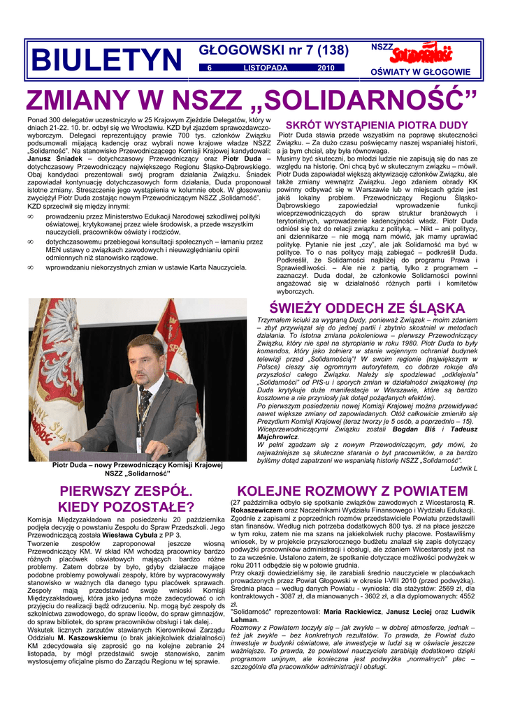 BIULETYN GŁOGOWSKI nr 7 (138) 6 LISTOPADA 2010 NSZZ OŚWIATY W GŁOGOWIE ZMIANY W NSZZ „SOLIDARNOŚĆ” Ponad 300 delegatów uczestniczyło w 25 Krajowym Zjeździe Delegatów, który w dniach 21-22. 10. br. odbył się we Wrocławiu. KZD był zjazdem sprawozdawczowyborczym. Delegaci reprezentujący prawie 700 tys. członków Związku podsumowali mijającą kadencję oraz wybrali nowe krajowe władze NSZZ „Solidarność”. Na stanowisko Przewodniczącego Komisji Krajowej kandydowali: Janusz Śniadek – dotychczasowy Przewodniczący oraz Piotr Duda – dotychczasowy Przewodniczący największego Regionu Śląsko-Dąbrowskiego. Obaj kandydaci prezentowali swój program działania Związku. Śniadek zapowiadał kontynuację dotychczasowych form działania, Duda proponował istotne zmiany. Streszczenie jego wystąpienia w kolumnie obok. W głosowaniu zwyciężył Piotr Duda zostając nowym Przewodniczącym NSZZ „Solidarność”. KZD sprzeciwił się między innymi: • prowadzeniu przez Ministerstwo Edukacji Narodowej szkodliwej polityki oświatowej, krytykowanej przez wiele środowisk, a przede wszystkim nauczycieli, pracowników oświaty i rodziców, • dotychczasowemu przebiegowi konsultacji społecznych – łamaniu przez MEN ustawy o związkach zawodowych i nieuwzględnianiu opinii odmiennych niż stanowisko rządowe. • wprowadzaniu niekorzystnych zmian w ustawie Karta Nauczyciela. SKRÓT WYSTĄPIENIA PIOTRA DUDY Piotr Duda stawia przede wszystkim na poprawę skuteczności Związku. – Za dużo czasu poświęcamy naszej wspaniałej historii, a ja bym chciał, aby była równowaga. Musimy być skuteczni, bo młodzi ludzie nie zapisują się do nas ze względu na historię. Oni chcą być w skutecznym związku – mówił. Piotr Duda zapowiadał większą aktywizację członków Związku, ale także zmiany wewnątrz Związku. Jego zdaniem obrady KK powinny odbywać się w Warszawie lub w miejscach gdzie jest jakiś lokalny problem. Przewodniczący Regionu ŚląskoDąbrowskiego zapowiedział wprowadzenie funkcji wiceprzewodniczących do spraw struktur branżowych i terytorialnych, wprowadzenie kadencyjności władz. Piotr Duda odniósł się też do relacji związku z polityką. – Nikt – ani politycy, ani dziennikarze – nie mogą nam mówić, jak mamy uprawiać politykę. Pytanie nie jest „czy”, ale jak Solidarność ma być w polityce. To o nas politycy mają zabiegać – podkreślił Duda. Podkreślił, że Solidarności najbliżej do programu Prawa i Sprawiedliwości. – Ale nie z partią, tylko z programem – zaznaczył. Duda dodał, że członkowie Solidarności powinni angażować się w działalność różnych partii i komitetów wyborczych. ŚWIEŻY ODDECH ZE ŚLĄSKA Piotr Duda – nowy Przewodniczący Komisji Krajowej NSZZ „Solidarność” PIERWSZY ZESPÓŁ. KIEDY POZOSTAŁE? Komisja Międzyzakładowa na posiedzeniu 20 października podjęła decyzję o powstaniu Zespołu do Spraw Przedszkoli. Jego Przewodniczącą została Wiesława Cybula z PP 3. Tworzenie zespołów zaproponował jeszcze wiosną Przewodniczący KM. W skład KM wchodzą pracownicy bardzo różnych placówek oświatowych mających bardzo różne problemy. Zatem dobrze by było, gdyby działacze mające podobne problemy powoływali zespoły, które by wypracowywały stanowisko w ważnych dla danego typu placówek sprawach. Zespoły mają przedstawiać swoje wnioski Komisji Międzyzakładowej, która jako jedyna może zadecydować o ich przyjęciu do realizacji bądź odrzuceniu. Np. mogą być zespoły ds szkolnictwa zawodowego, do spraw liceów, do spraw gimnazjów, do spraw bibliotek, do spraw pracowników obsługi i tak dalej.. Wskutek licznych zarzutów stawianych Kierownikowi Zarządu Oddziału M. Kaszowskiemu (o brak jakiejkolwiek działalności) KM zdecydowała się zaprosić go na kolejne zebranie 24 listopada, by mógł przedstawić swoje stanowisko, zanim wystosujemy oficjalne pismo do Zarządu Regionu w tej sprawie. Trzymałem kciuki za wygraną Dudy, ponieważ Związek – moim zdaniem – zbyt przywiązał się do jednej partii i zbytnio skostniał w metodach działania. To istotna zmiana pokoleniowa – pierwszy Przewodniczący Związku, który nie spał na styropianie w roku 1980. Piotr Duda to były komandos, który jako żołnierz w stanie wojennym ochraniał budynek telewizji przed „Solidarnością”! W swoim regionie (największym w Polsce) cieszy się ogromnym autorytetem, co dobrze rokuje dla przyszłości całego Związku. Należy się spodziewać „odklejenia” „Solidarności” od PIS-u i sporych zmian w działalności związkowej (np Duda krytykuje duże manifestacje w Warszawie, które są bardzo kosztowne a nie przyniosły jak dotąd pożądanych efektów). Po pierwszym posiedzeniu nowej Komisji Krajowej można przewidywać nawet większe zmiany od zapowiadanych. Otóż całkowicie zmieniło się Prezydium Komisji Krajowej (teraz tworzy je 5 osób, a poprzednio – 15). Wiceprzewodniczącymi Związku zostali Bogdan Biś i Tadeusz Majchrowicz. W pełni zgadzam się z nowym Przewodniczącym, gdy mówi, że najważniejsze są skuteczne starania o byt pracowników, a za bardzo byliśmy dotąd zapatrzeni we wspaniałą historię NSZZ „Solidarność”. Ludwik L KOLEJNE ROZMOWY Z POWIATEM (27 paździrnika odbyło się spotkanie związków zawodowych z Wicestarostą R. Rokaszewiczem oraz Naczelnikami Wydziału Finansowego i Wydziału Edukacji. Zgodnie z zapisami z poprzednich rozmów przedstawiciele Powiatu przedstawili stan finansów. Według nich potrzeba dodatkowych 800 tys. zł na płace jeszcze w tym roku, zatem nie ma szans na jakiekolwiek ruchy płacowe. Postawiliśmy wniosek, by w projekcie przyszłorocznego budżetu znalazł się zapis dotyczący podwyżki pracowników administracji i obsługi, ale zdaniem Wicestarosty jest na to za wcześnie. Ustalono zatem, że spotkanie dotyczące możliwości podwyżek w roku 2011 odbędzie się w połowie g