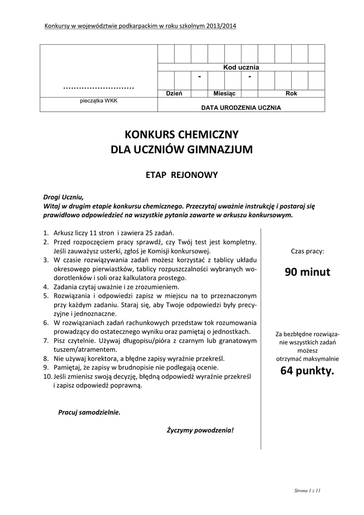 Konkursy w województwie podkarpackim w roku szkolnym 2013/2014 Kod ucznia ……………………… Dzień Miesiąc Rok pieczątka WKK DATA URODZENIA UCZNIA KONKURS CHEMICZNY DLA UCZNIÓW GIMNAZJUM ETAP REJONOWY Drogi Uczniu, Witaj w drugim etapie konkursu chemicznego. Przeczytaj uważnie instrukcję i postaraj się prawidłowo odpowiedzieć na wszystkie pytania zawarte w arkuszu konkursowym. 1. Arkusz liczy 11 stron i zawiera 25 zadań. 2. Przed rozpoczęciem pracy sprawdź, czy Twój test jest kompletny. Jeśli zauważysz usterki, zgłoś je Komisji konkursowej. 3. W czasie rozwiązywania zadań możesz korzystać z tablicy układu okresowego pierwiastków, tablicy rozpuszczalności wybranych wodorotlenków i soli oraz kalkulatora prostego. 4. Zadania czytaj uważnie i ze zrozumieniem. 5. Rozwiązania i odpowiedzi zapisz w miejscu na to przeznaczonym przy każdym zadaniu. Staraj się, aby Twoje odpowiedzi były precyzyjne i jednoznaczne. 6. W rozwiązaniach zadań rachunkowych przedstaw tok rozumowania prowadzący do ostatecznego wyniku oraz pamiętaj o jednostkach. 7. Pisz czytelnie. Używaj długopisu/pióra z czarnym lub granatowym tuszem/atramentem. 8. Nie używaj korektora, a błędne zapisy wyraźnie przekreśl. 9. Pamiętaj, że zapisy w brudnopisie nie podlegają ocenie. 10. Jeśli zmienisz swoją decyzję, błędną odpowiedź wyraźnie przekreśl i zapisz odpowiedź poprawną. Czas pracy: 90 minut Za bezbłędne rozwiązanie wszystkich zadań możesz otrzymać maksymalnie 64 punkty. Pracuj samodzielnie. Życzymy powodzenia! Strona 1 z 11 Konkursy w województwie podkarpackim w roku szkolnym 2013/2014 Zadanie 1 (0 - 10) Uzupełnij podane poniżej zdania wpisując odpowiednie liczby, wyrażenia, wzory lub nazwy: 1) Jon Zn2+ izotopu o liczbie masowej 68 zawiera ....................... elektronów oraz ...................... neutronów. 2) Przemiana fazowa polegająca na przejściu gazu bezpośrednio w ciało stałe to ……………………………………………….. 3) Węglowodory szeregu homologicznego ............................ i .................................... odbarwiają wodę bromową. 4) W cząsteczce azotu w tworzeniu wiązań bierze udział ..................................................................... elektronów. 5) Fosforan (V) wapnia można otrzymać roztwarzając w kwasie fosforowym(V) …………………………………………………… 6) Sól tę można również otrzymać w wyniku reakcji roztworu wodnego fosforanu(V) sodu z wodnym roztworem ………………………………………………………………………… Uwaga! Podaj wzór lub nazwę zaproponowanej substancji. 7) Podczas spalania całkowitego pewnego węglowodoru zachodzi reakcja ..................... + 5 O2 → 3CO2 + 4H2O 8) Węglowodór użyty w reakcji z podpunktu 7) należy do szeregu homologicznego ………………………………….......... 9) Masa molowa wodorotlenku potasu jest równa ……………………………………………………….………………………… g/mol. 10) W wyniku dysocjacji elektrolitycznej 3 moli siarczanu(VI) żelaza(III) powstaje ……………..…………… moli jonów. Zadanie 2 (0 - 2) Stosując zapis cząsteczkowy, napisz równania reakcji chemicznych, o których mowa w podpunktach 5) i 6) ……………………………………………………………………………………………………………….. ……………………………………………………………………………………………………………….. Informacja do zadań 3, 4, 5 Badano zawartość procentową węglanu wapnia w próbce skały wapiennej. W tym celu próbkę o masie 30g umieszczono w zamkniętym naczyniu i roztworzono w nadmiarze kwasu chlorowodorowego. Wydzielający się gaz wprowadzono do zlewki z wodą wapienną. Wytrącony osad odsączono, osuszono i zważono. Jego masa wyniosła 21g. Schemat przeprowadzonego doświadczenia przedstawiono na rysunku. Zadanie 3 (0 - 4) a) Napisz w formie cząsteczkowej i jonowej skróconej równania reakcji przebiegającej w kolbie okrągłodennej. …………………………………………………………………………………………………………………………………………………………………… ………………………………………………………………………………………………………………………………………………………………….. b) Napisz w formie cząsteczkowej i jonowej skróconej równania reakcji przebiegającej w zlewce. …………………………………………………………………………………………………………………………………………………………………… ………………………………………………………………………………………………………………………………………………………………….. Strona 2 z 11 Konkursy w województwie podkarpackim w roku szkolnym 2013/2014 Zadanie 4 (0 - 2) Oblicz procentową zawartość węglanu wapnia w próbce badanego wapienia. ………………………………………………………………………………………………………………………………………………………………………………… ………………………………………………………………………………………………………………………………………………………………………………… ………………………………………………………………………………………………………………………………………………………………………………… ………………………………………………………………………………………………………………………………………………………………………………… Odpowiedź: ……