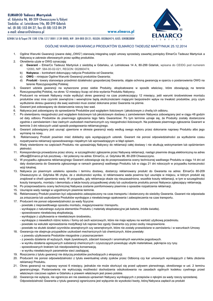 OGÓLNE WARUNKI GWARANCJI PRODUKTÓW ELMARCO TADEUSZ MARTYNIUK 25.12.2014 1. 2. 3. 4. 5. 6. 7. 8. 9. 10. 11. 12. 13. 14. 15. 16. 17. 18. 19. 20. 21. 22. Ogólne Warunki Gwarancji (zwane dalej „OWG”) stanowią integralną część umowy sprzedaży zawartej pomiędzy ElmarCo Tadeusz Martyniuk a Nabywcą w zakresie oferowanych przez spółkę produktów. Określenia użyte w OWG oznaczają: a) Gwarant – ElmarCo Tadeusz Martyniuk z siedzibą w Gdańsku, ul. Letniskowa 14 A, 80-299 Gdańsk, wpisana do CEIDG pod numerem 12093, NIP: 584-00-02-021, REGON: 002860474; b) Nabywca – kontrahent dokonujący nabycia Produktów od Gwaranta; c) OWG – niniejsze Ogólne Warunki Gwarancji produktów Gwaranta; d) Produkt - towary stanowiące przedmiot działalności gospodarczej Gwaranta, objęte ochroną gwarancją w oparciu o postanowienia OWG na terenie Rzeczypospolitej Polskiej; Gwarant udziela gwarancji na wytworzone przez siebie Produkty, eksploatowane w sposób właściwy, które obowiązują na terenie Rzeczypospolitej Polskiej, na okres 12 miesięcy licząc od dnia wydania Produktu Nabywcy. Producent na wniosek Nabywcy może wydłużyć okres gwarancji na czas przekraczający 12 miesięcy, jeśli warunki środowiskowe montażu produktów oraz inne czynniki zewnętrzne i wewnętrzne będą okolicznościami mającymi bezpośredni wpływ na trwałość produktów, przy czym wydłużenie okresu gwarancji dla swej ważności musi zostać dokonane przez Gwaranta na piśmie. Gwarant jest zobowiązany do dostarczenia rzeczy bez wad. Nabywca jest zobowiązany do sprawdzenia Produktów pod względem ilościowym i jakościowym z chwilą ich odbioru. Po stwierdzeniu niezgodności pod względem ilościowym lub jakościowym dostawy z zamówieniem Nabywca zobowiązany jest w ciągu 48 godzin od daty odbioru Produktów do pisemnego zgłoszenia tego faktu Gwarantowi. Po tym terminie uznaje się, że Produkty zostały dostarczone zgodnie z zamówieniem i bez żadnych uszkodzeń mechanicznych czy niezgodności ilościowych. Na podstawie pisemnego zgłoszenia Gwarant w terminie 3 dni roboczych ustali sposób postępowania reklamacyjnego. Gwarant zobowiązany jest usunąć ujawnione w okresie gwarancji wady według swego wyboru przez dokonanie naprawy Produktu albo jego wymianę na nowy. Reklamowany Produkt powinien mieć dokładny opis występujących usterek. Gwarant nie ponosi odpowiedzialności za wydłużenie czasu rozpatrywania reklamacji spowodowanego niepełnym lub wprowadzającym w błąd opisem. Wady stwierdzone na częściach Produktu nie upoważniają Nabywcy do reklamacji całej dostawy i nie skutkują wstrzymaniem lub opóźnieniem płatności. Korespondencja prowadzona przez strony, w szczególności zgłoszenie przez Nabywcę reklamacji, nastąpi pisemnie drogą elektroniczną na adres [email protected] lub pocztową – list polecony na adres: ElmarCo, ul. Gdyńska 96, 80-209 Chwaszczyno. W przypadku zgłoszenia reklamacyjnego Gwarant zobowiązuje się do przeprowadzenia oceny technicznej wadliwego Produktu w ciągu 14 dni od daty dostarczenia do Gwaranta zgłoszonego w ramach gwarancji wadliwego Produktu lub w ciągu 21 dni roboczych w przypadku konieczności wizji lokalnej. Nabywca po pisemnym ustaleniu sposobu i terminu dostawy, dostarczy reklamowany produkt do Gwaranta na adres: ElmarCo 80-209 Chwaszczyno ul. Gdyńska 96 chyba, że z okoliczności wynika, iż reklamowana wada powinna być usunięta w miejscu, w którym produkt się znajdował w chwili ujawnienia wady. W przypadku, gdy reklamacja okaże się nieuzasadniona, wszelkie koszty reklamacji, w tym w szczególności koszty transportu, montażu i demontażu a także koszty przypadkowej utraty lub uszkodzenia produktu ponosi Nabywca zgłaszający reklamację. Po przeprowadzeniu oceny technicznej Nabywca zostanie poinformowany pisemnie o sposobie rozpatrzenia reklamacji. Usunięcie wady nastąpi w uzgodnionym pisemnie terminie. Reklamowany Produkt powinien być odpowiednio zabezpieczony na czas transportu i dostarczony do siedziby Gwaranta. Gwarant nie odpowiada za zniszczenia lub uszkodzenia Produktów wynikające z niewłaściwego opakowania i zabezpieczenia na czas transportu. Producent nie ponosi odpowiedzialności za wady fizyczne: - powstałe z nieprawidłowego sposobu montażu, magazynowania i transportu. - wynikające z naturalnego zużycia elementów Produktu ( materiały eksploatacyjne jak baterie, źródła światła). - spowodowane niewłaściwą eksploatacją. - wynikające z użytkowania w niewłaściwym środowisku. - wynikające z niewielkich różnic koloru i formy od cech wzorcowych, które nie maja wpływu na wartość użytkową przedmiotu. - powstałe na wskutek wprowadzenia modyfikacji lub napraw bez zgody Gwaranta czy przez osoby nieuprawnione. - powstałe na skutek działań czynników zewnętrznych czy wewnętrznych, które nie zostały przewidziane w zamówieniu i w warunkach Umowy Gwarancja nie obejmuje przypadków uszkodzeń mechanicznych lub chemicznych, które powstały: - z powodu użytkowania Produktów niezgodnie z przeznaczeniem - z powodu działania sił wyższych, klęsk żywiołowych, zdarzeń losowych i anormalnych warunków pogodowych. - w wyniku działania agresywnych substancji chemicznych i czyszczących powodując ubytki materiałowe, pęknięcia czy rysy. - spowodowanych brakiem lub nieodpowiednią konserwacją. - w wyniku niewłaściwych parametrów sieci zasilającej. Roszczenia z tytułu gwarancji nie dotyczą produktów pochodzących z ekspozycji. Producent nie ponosi odpowiedzialności z tytułu ewentualnej utraty zysków przez Odbiorcę czy kar umownych wynikających z faktu złożenia reklamacji Produktu. Okres gwarancji na naprawy wynosi 6 miesięcy, jednakże nie może skończyć się przed upływem pierwotnego, określonego w ust. 2 terminu gwarancyjnego. Postanowienia nie wykluczają możliwości dochodzenia odszkodowania na zasadach ogólnych kodeksu cywilnego przed właściwym r