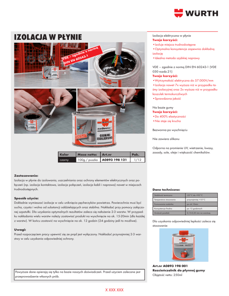 IZOLACJA W PŁYNIE Izolacja elektryczna w płynie Twoje korzyści: •Izoluje miejsca trudnodostępne •Optymalna konsystencja zapewnia dokładną izolację •Idealna metoda szybkiej naprawy rmą z no nie d o – zg 43-1 VDE N 602 E DIN VDE – zgodnie z normą DIN EN 60243-1 (VDE 030 rozdz.21) Twoje korzyści: •Wytrzymałość elektryczna do 57.000V/mm •Izolacja nawet 7x wyższa niż w przypadku taśmy izolacyjnej oraz 2x wyższa niż w przypadku koszulek termokurczliwych •Sprawdzona jakość Na bazie gumy Twoje korzyści: •Do 400% elastyczności •Nie staje się krucha Bezwonna po wyschnięciu Nie zawiera silikonu Kolor Masa netto: Art.nr czarny 100g / puszka A0893 198 121 Pak. 1/12 Zastosowanie: Izolacja w płynie do izolowania, uszczelniania oraz ochrony elementów elektrycznych oraz połączeń (np. izolacja kontaktowa, izolacja połączeń, izolacja kabli i naprawa) nawet w miejscach trudnodostępnych. Sposób użycia: Dokładnie wymieszać izolacje w celu uniknięcia pęcherzyków powietrza. Powierzchnia musi być sucha, czysta i wolna od substancji oddzielających oraz stabilna. Nakładać przy pomocy załączonej szpatułki. Dla uzyskania optymalnych rezultatów zaleca się nałożenie 2-3 warstw. W przypadku nakładania wielu warstw należy zostawiać produkt na wyschnięcie na ok. 15-20min (dla każdej z warstw). W końcu zostawić na wyschnięcie na ok. 12 godzin (24 godziny jeśli to możliwe). Uwagi: Przed rozpoczęciem pracy upewnić się ze prąd jest wyłączony. Nakładać przynajmniej 2-3 warstwy w celu uzyskania odpowiedniej ochrony. Powyższe dane opierają się tylko na bazie naszych doświadczeń. Przed użyciem zalecane jest przeprowadzenie własnych prób. X XXX XXX Odporna na promienie UV, wietrzenie, kwasy, zasady, sole, oleje i większość chemikaliów. Dane techniczne: Stabilność termiczna -35°C do +95°C Temperatura stosowania przynajmniej +10°C Formowanie naskórka po ok.10min Konsystencja finalna po 12 godzinach Grubość powłoki 0,15-0,20 mm na warstwę Dla uzyskania odpowiedniej lepkości zaleca się stosowanie: Art.nr A0893 198 001 Rozcieńczalnik do płynnej gumy Objętość netto: 250ml