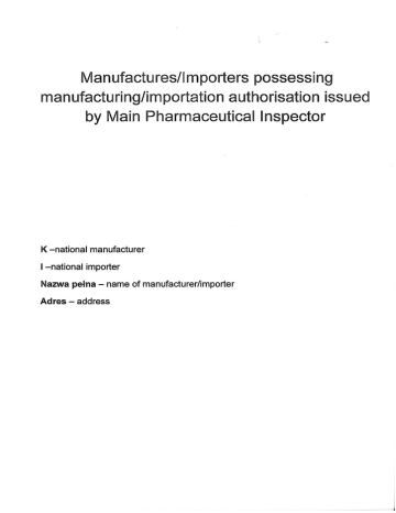 GIF System SITE GIF Wytwórcy Filtry: Nadzór: Bez podmiotów nadzoru Sortowanie: (brak) Znaczenie kolumn: W/I K - Wytwórca krajowy / I - Importer LP W/I Nazwa pełna Akademia Górniczo – Hutnicza im. Stanisława Staszica Przedsiębiorstwo Produkcyjno-Usługowo-Handlowe ”AUGMED” Przedsiębiorstwo AVICENNA-OIL Wiktor Podlaski Laboratorium Medycyny Naturalnej ”BONIMED” Centrum Badań Mikrobiologicznych i Autoszczepionek im. dr Jana Bobra Sp. z o.o. Ośrodek Badawczo-Rozwojowy Górnictwa Surowców Chemicznych „CHEMKOP” Sp z o.o. 1 K 2 K 3 K 4 K 5 K 6 K 7 K Dagomed Pharma Sp. z o.o. 8 9 K K 10 K DERMAPHYT Sp. z o.o. FARM-IMPEX Rusecki Spółka Jawna Przedsiębiorstwo Produkcyjno Handlowe GALFARM Sp. z o.o. 11 K 12 K 13 K 14 K 15 16 K K 17 K 18 KI 19 20 K K 21 K 22 23 KI K 24 K 25 26 KI KI 27 K 28 K Adres al. Mickiewicza 30 30-059 Kraków ul. Starzyńskiego 88 02-800 Warszawa, Dawidy Bankowe ul. Opolska 11-19 52-010 Wrocław ul. Stawowa 23 34-300 Żywiec ul. Sławkowska 17 31-016 Kraków ul. J. Wybickiego 7 31-261 Kraków ul. Czorsztyńska 6 01-410 Warszawa ul. Legionów 37 34-100 Wadowice ul. Skarbnika 12 44-103 Gliwice ul. Przemysłowa 12 30-701 Kraków ul. II Morskiego Pułku Strzelców 9 81-661 Gdynia INSTYTUT CHEMII I TECHNIKI JĄDROWEJ ul. Dorodna 16 03-195 Warszawa Instytut Medycyny Pracy Im. Prof. Dra med. ul. Świętej Teresy od Dzieciątka Jerzego Nofera Jezus nr 8 91-348 Łódź Laboratorium Farmaceutyczne Jarosław ul. Piłsudskiego 26 42-310 Żarki Szczepańczyk ”MAGA-HERBA” Marek Stępniak s.j. ul. Targowa 66 05-120 Legionowo Marinex International Sp. z o.o. ul. Placowa 4 93-446 Łódź Narodowy Instytut Leków Zakład Leków ul. Chełmska 30/34 00-725 Izotopowych Warszawa Pliva Kraków Zakłady Farmaceutyczne Spółka ul. Mogilska 80 31-546 Kraków Akcyjna POCH Spółka Akcyjna ul. Sowińskiego 11 44-101 Gliwice POLFARMEX S.A. ul. Józefów 9 99-300 Kutno Zakłady Farmaceutyczne ”UNIA” Spółdzielnia ul. Chłodna 56/60 00-872 Pracy Warszawa ADAMED Sp. z o.o. Pieńków 149 05-152 Czosnów ”AFLOFARM” Fabryka Leków Sp. z o.o. ul. Szkolna 31 95-054 Ksawerów ul. Aleje Jerozolimskie 146A NYCOMED PHARMA Sp. z o.o. 02-305 Warszawa BIOTON S.A. ul. Starościńska 5 02-516 Warszawa BIOVENA Pharma Sp. z o.o. ul. Odrowąża 13 03-310 Warszawa Samodzielny Publiczny Zakład Opieki ul. Czechosłowacka 8/10 92-216 Zdrowotnej Centralny Szpital Kliniczny Łódź Uniwersytetu Medycznego w Łodzi Chemiczno-Farmaceutyczna Spółdzielnia Pracy ul. Juliusza Lea 208 30-133 „ESPEFA” Kraków Wytwórnia Farmaceutyczna INFARM ID raportu: WYTW 0065 Data składu: 04.03.2011 08:48 str. 1 / 13 GIF LP System SITE W/I 29 K 30 KI 31 K 32 K 33 34 K K 35 KI 36 K 37 K 38 K 39 K 40 K 41 K 42 K 43 KI 44 K 45 K 46 K 47 K 48 K 49 K 50 K 51 K 52 K 53 K 54 K 55 K 56 K 57 K 58 K 59 KI GIF Nazwa pełna Adres Przedsiębiorstwo Produkcyjno-Handlowe „EWA” ul. Zamkowy Folwark 9 63-700 SA w Krotoszynie Krotoszyn ul. ks. J. Poniatowskiego 5 05-825 GEDEON RICHTER POLSKA Sp. z o.o. Grodzisk Mazowiecki Przedsiębiorstwo Produkcji Farmaceutycznej ul. Żmigrodzka 242 E 51-131 HASCO-LEK S.A. Wrocław Wrocławskie Zakłady Zielarskie ”HERBAPOL” ul. Św. Mikołaja 65/68 50-951 S.A. Wrocław Instytut Biotechnologii i Antybiotyków ul. Starościńska 5 02-516 Warszawa ”INCO-VERITAS” S.A. ul. Wspólna 25 00-519 Warszawa ul. Wincentego Pola 21 58-500 Przedsiębiorstwo Farmaceutyczne JELFA S.A. Jelenia Góra ul. Władysława Łokietka 10 98-200 Medana Pharma Spółka Akcyjna Sieradz OCEANIC Spółka Akcyjna ul. Łokietka 58 81-736 Sopot Pabianickie Zakłady Farmaceutyczne POLFA ul. Marsz. J. Piłsudskiego 5 95-200 S.A. Pabianice Biogened S.A. ul. Pojezierska 99 91-342 Łódź ul. Daniszewska 10 03-230 Solco Basel Przedsiębiorstwo Zagraniczne Warszawa Pracownia Mikrobiologii Samodzielny Publiczny ul. Węgrzynowicza 13 84-300 Specjalistyczny Zakład Opieki Zdrowotnej w Lębork Lęborku Magdalena Brzosko Przedsiębiorstwo ul. Willowa 8/10 m 14 00-790 Rolno-Produkcyjne „TYMOFARM Witold Warszawa Brzosko” ul. Przewoźników 11 03-691 VIPHARM S.A. Warszawa ul. Kruczkowskiego 8 00-380 Baxter Polska Sp. z o.o. Warszawa Instytut Biotechnologii Surowic i Szczepionek Al. Sosnowa 8 30-224 Kraków BIOMED S.A. Farmaceutyczna Spółdzielnia Pracy ”GALENA” ul. Krucza 62 50-984 Wrocław Al. Katowicka 117, Kajetany 3M Poland Sp. z o.o. 05-830 Nadarzyn Alba Thyment Sp. z o.o. ul. J. Kossaka 21 60-760 Poznań ul. M. Skłodowskiej-Curie 3a Akademia Medyczna w Gdańsku 80-210 Gdańsk Uniwersytet Medyczny w Lublinie Al. Racławickie 1 20-950 Lublin Uniwersytet Medyczny im. Karola ul. Fredry 10 61-701 Poznań Marcinkowskiego ”ANPHARM” Przedsiębiorstwo Farmaceutyczne ul. Annopol 6B 03-236 Warszawa S.A. Przedsiębiorstwo Pszczelarsko-Farmaceutyczne ul. Cegielskiego 2 32-400 Myślenice APIPOL-FARMA Sp. z o.o. Lek S.A. (d. ZF ARGON SA) ul. Sarnia 3/5 90-972 Łódź ul. Oświęcimska 11 48-100 ASA Sp. z o.o. Głubczyce Laboratorium Farmaceutyczne ”AVENA” spółka ul. Leśna 42 86-031 Osielsko jawna ul. Nowy Świat 7 m 14 00-496 BALTON Sp. z o.o. Warszawa ul. Chłodna 56/60 00-872 Bio-Chic Sp. z o.o. Warszawa Biofarm Sp. z o.o. ul. Wałbrzyska 13 60-198 Poznań ID raportu: WYTW 0065 Data składu: 04.03.2011 08:48 str. 2 / 13 GIF LP 60 System SITE Nazwa pełna W/I Air Products Sp. z o.o. K 61 KI CELON PHARMA Sp. z o.o. 62 K 63 K 64 K 65 66 K K 67 K 68 K 69 70 K K CHEMA-ELEKTROMET Spółdzielnia Pracy Dr Włodzimierz Zgoda – Chemical Research, Consulting & Production Laboratorium Homeopatyczne DECYMAL M.M. Kubisty DYS-PAK Sp. z o.o. EMO-FARM Sp. z o.o. EUROGAZ-BOMBI H.CHOROSZUCHA Z.CHOROSZUCHA SPÓŁKA JAWNA Zakład Produkcyjno-Usługowy FARKO s.c. A. Kuczyniecka, K. Frejgandt-Nicpoń, P. Kalinowski FARMA-PROJEKT Sp. z o.o. FARMJUG Sp. z o.o. 71 K Fresenius Kabi Polska Sp. z o.o. 72 K 73 K 74 K 75 K 76 K 77 K 78 79 K KI 80 K 81 K 82 K 83 K 84 K 85 K 86 K 87 K 88 K 89 K 90 KI GIF Adres ul. Pory 59 02-757 Warszaw
