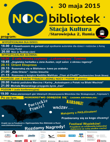 Stacja Kultura /Starowiejska 2, Rumia program: WYPOŻYCZALNIA DLA DZIECI: 18.00 Z Heweliuszem do gwiazd czyli spotkanie autorskie dla dzieci i rodziców z Anną Czerwińską-Rydel 20.00 Noc w Teatrze cieni WYPOŻYCZALNIA GŁÓWNA: 19.00 Z całą Polską czytamy „Lokomotywę” Tuwima 19.45 „Angielska herbatka u Jane Austen, czyli salon z okresu regencji” 20.15 Orient Ekspress 20.15 Rozsmakuj się w Bibliotece- kawa po arabsku 21.00 „Aida Oriens” - taniec brzucha 21.15 Rozmowa o książce Nadżiba Mahfuza „Chan al-Chalili”(wydawnictwo Smak Słowa) PODRÓŻE JAK Z BAŚNI TYSIĄCA I JEDNEJ NOCY / POZIOM -1 (piwnica) 20.00 21.00 Podróż poślubna Marcina i Kariny „Autostopem z Polski na Bliski Wschód” Michała Miziarskiego przygoda życia „Iran” POZIOM 1 (sala konferencyjna) 19.00 Pokaz planszowych gier bitewnych (Stowarzyszenie Miłośników Gier Strategicznych „Trójmiasto”) Po za tym... „Morderstwo odbędzie się” - zabawa kryminalna! e i k c y t e o P ! e i n a Pr KARAOKE ! WRÓŻBY.... ! m e t a n O J S Malujemy z PA Przebieramy się za kogo chcemy! www.bibliotekarumia.pl www.nocbibliotek.org ! y d o r g a N y Rozdam Festiwal Wypieków! Przyjdźcie ze smakowitą babeczką! Zabierzcie ze sobą słodkie ciacho!