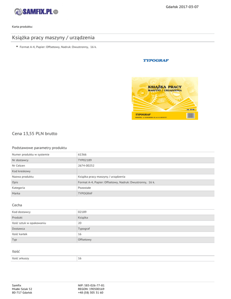 Gdańsk 2017-03-07 Karta produktu: Książka pracy maszyny / urządzenia Format A-4, Papier: Offsetowy, Nadruk: Dwustronny, 16 k. Cena 13,55 PLN brutto Podstawowe parametry produktu Numer produktu w systemie 61366 Nr dostawcy TYP02189 Nr Celcen 2674-00252 Kod kreskowy Nazwa produktu Książka pracy maszyny / urządzenia Opis Format A-4, Papier: Offsetowy, Nadruk: Dwustronny, 16 k. Kategoria Pozostałe Marka TYPOGRAF Cecha Kod dostawcy 02189 Produkt Książka Ilość sztuk w opakowaniu 20 Dostawca Typograf Ilość kartek 16 Typ Offsetowy Ilość Ilość arkuszy 16 Samfix Miałki Szlak 52 80-717 Gdańsk NIP: 583-026-77-81 REGON: 190500169 +48 (58) 305 31 60 Gdańsk 2017-03-07 Karta katalogowa produktu cd. Książka pracy maszyny / urządzenia Wymiary Format A4 Serdecznie zapraszamy do współpracy Zespół Samfix. Samfix Miałki Szlak 52 80-717 Gdańsk NIP: 583-026-77-81 REGON: 190500169 +48 (58) 305 31 60