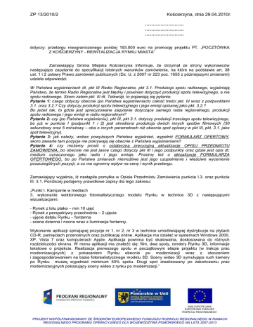 ZP 13/2010/2 Kościerzyna, dnia 29.04.2010r. ……………………. ……………………. ……………………. dotyczy: przetargu nieograniczonego poniŜej 193.000 euro na promocję projektu PT. „POCZTÓWKA Z KOŚCIERZYNY - REWITALIZACJA RYNKU MIASTA” Zamawiający Gmina Miejska Kościerzyna informuje, Ŝe otrzymał ze strony wykonawców następujące zapytanie do specyfikacji istotnych warunków zamówienia, na które na podstawie art. 38 ust. 1 i 2 ustawy Prawo zamówień publicznych (Dz. U. z 2007 nr 223 poz. 1655 z późniejszymi zmianami) udziela odpowiedzi: W Państwa wyjaśnieniach dt. pkt III Radio Regionalne, pkt 3.1. Produkcja spotu radiowego, wyjaśniają Państwo, Ŝe termin Radio Regionalne jest błędny i powinien dotyczyć produkcji spotu telewizyjnego, a nie spotu radiowego. Skoro zatem pkt. III dt. Telewizji, to pojawiają się pytania: Pytanie 1: czego dotyczy obecnie (po Państwa wyjaśnieniach) całość treści pkt. III wraz z podpunktami 3.1. oraz 3.2.? Czy dotyczy produkcji spotu telewizyjnego i jego emisji opisanej jako pkt. 3.2.? Bo jeŜeli tak, to gdzie jest sprecyzowane zapytanie dotyczące samego radia regionalnego, produkcji spotu radiowego i jego emisji w radiu regionalnym? Pytanie 2: czy (po Państwa wyjaśnieniu), pkt III, pkt 3.1. dotyczy produkcji trzeciego spotu telewizyjnego, bo juŜ w punkcie I (podpunkt 1 i 2) jest określona produkcja dwóch innych spotów filmowych (30 sekundowy oraz 5 minutowy – oba o innych parametrach niŜ obecnie spot opisany w pkt III, pkt. 3.1. jako spot telewizyjny). Pytanie 3: jak naleŜy, wobec powyŜszych Państwa wyjaśnień, wypełnić FORMULARZ OFERTOWY, skoro zawarte tam pozycje nie pokrywają się obecnie z Państwa wyjaśnieniami? Pytanie 4: czy moŜemy prosić o ostateczną precyzyjną aktualizację OPISU PRZEDMIOTU ZAMÓWIENIA, bo obecnie nie jest jasne czego dotyczy pkt III i jego podpunkty oraz gdzie jest opis dt. medium oznaczonego jako radio i jego emisje. Prosimy teŜ o aktualizację FORMULARZA OFERTOWEGO, bo po Państwa zmianach niemoŜliwe jest jego uzupełnienie i właściwe wycenienie poszczególnych pozycji, a co ma ogromny wpływ na cenę i wynik przetargu. Zamawiający wyjaśnia, iŜ nastąpiła pomyłka w Opisie Przedmiotu Zamówienia punkcie I.3. oraz punkcie III. 3.1. PoniŜszej podajemy prawidłowe zapisy dla tego zakresu: „Punkt I. Kampanie w mediach 3. wykonanie wektorowego fotorealistycznego modelu Rynku w technice 3D z następującymi wizualizacjami: - Rynek z lotu ptaka – min 10 ujęć - Rynek z perspektywy przechodnia – 2 ujęcia - ujęcie detalu Rynku – fontanna - scena dzienna i nocna wraz z iluminacja fontanny. Wykonanie aplikacji spinającej pozycje nr 1, nr 2, nr 3 w technice umoŜliwiającej dystrybucje na płytach CD-R, pamięciach przenośnych oraz publikację online. Aplikacja ma działać w systemach Windows 2000, XP, Vista 7 oraz komputerach Apple. Aplikacja powinna być skalowalna, dostosowana do róŜnych rozdzielczości ekranu. W menu aplikacji ma znaleźć się: film, dwa spoty, rendery Rynku 3D, informacje tekstowe o projekcie. Realizacja pierwszego spotu w początkowym etapie projektu (w trakcje prac modernizacyjnych) z pokazaniem Rynku obecnie po modernizacji wraz z otoczeniem i zagospodarowaniem na bazie fotorealistycznego modelu 3D. Sceny wideo 3D symulujące ruch kamery po Rynku muszą wypełniać minimum 50% spotu. Drugi spot zrealizowany po zakończeniu prac modernizacyjnych pokazujący sceny wideo z rynku po modernizacji.” PROJEKT WSPÓŁFINANSOWANY ZE ŚRODKÓW EUROPEJSKIEGO FUNDUSZU ROZWOJU REGIONALNEGO W RAMACH REGIONALNEGO PROGRAMU OPERACYJNEGO DLA WOJEWÓDZTWA POMORSKIEGO NA LATA 2007-2013 „Punkt III. Radio regionalne 3.1. Produkcja jednego spotu promocyjnego − 30 sekundowy spot zawierających informacje o projekcie, źródłach finansowania, najwaŜniejszych etapach, efektach realizacji – produktach i rezultatach, przebiegu modernizowanych ulic, beneficjentach, korzyściach związanych z realizacją projektów współfinansowanych ze środków Unii Europejskiej w ramach RPO WP 2007-2013. Treść spotu ostatecznie naleŜy uzgodnić z Zamawiającym i wykonać po uzyskaniu akceptacji Zamawiającego. 3.2. Emisja spotu promocyjnego. − 3-krotnie w ramach projektu Trzy emisje 30 sekundowego spotu (tego samego) w całym okresie realizacji projektu w dniach 00 00 poniedziałek - piątek w godzinach 8 – 16 .” Zamawiający prosi o niezwłoczne pisemne potwierdzenie faktu otrzymania niniejszego pisma fax-em na nr 58 680-23-66. Z powaŜaniem PROJEKT WSPÓŁFINANSOWANY ZE ŚRODKÓW EUROPEJSKIEGO FUNDUSZU ROZWOJU REGIONALNEGO W RAMACH REGIONALNEGO PROGRAMU OPERACYJNEGO DLA WOJEWÓDZTWA POMORSKIEGO NA LATA 2007-2013