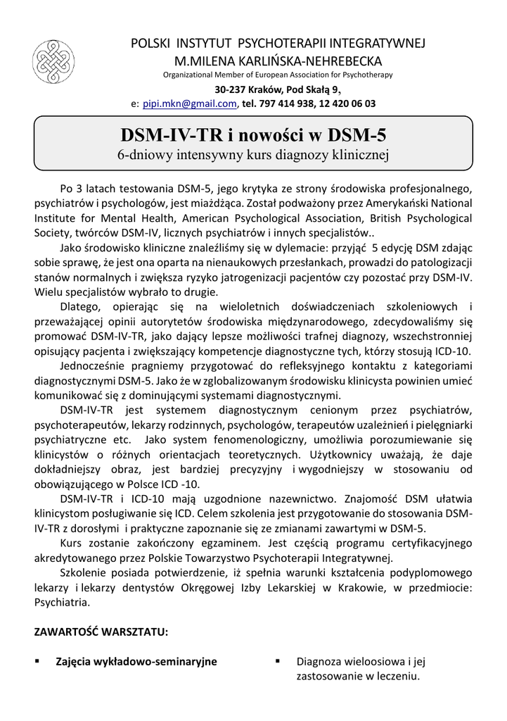 POLSKI INSTYTUT PSYCHOTERAPII INTEGRATYWNEJ M.MILENA KARLIŃSKA-NEHREBECKA Organizational Member of European Association for Psychotherapy 30-237 Kraków, Pod Skałą 9, e: [email protected], tel. 797 414 938, 12 420 06 03 DSM-IV-TR i nowości w DSM-5 6-dniowy intensywny kurs diagnozy klinicznej Po 3 latach testowania DSM-5, jego krytyka ze strony środowiska profesjonalnego, psychiatrów i psychologów, jest miażdżąca. Został podważony przez Amerykański National Institute for Mental Health, American Psychological Association, British Psychological Society, twórców DSM-IV, licznych psychiatrów i innych specjalistów.. Jako środowisko kliniczne znaleźliśmy się w dylemacie: przyjąć 5 edycję DSM zdając sobie sprawę, że jest ona oparta na nienaukowych przesłankach, prowadzi do patologizacji stanów normalnych i zwiększa ryzyko jatrogenizacji pacjentów czy pozostać przy DSM-IV. Wielu specjalistów wybrało to drugie. Dlatego, opierając się na wieloletnich doświadczeniach szkoleniowych i przeważającej opinii autorytetów środowiska międzynarodowego, zdecydowaliśmy się promować DSM-IV-TR, jako dający lepsze możliwości trafnej diagnozy, wszechstronniej opisujący pacjenta i zwiększający kompetencje diagnostyczne tych, którzy stosują ICD-10. Jednocześnie pragniemy przygotować do refleksyjnego kontaktu z kategoriami diagnostycznymi DSM-5. Jako że w zglobalizowanym środowisku klinicysta powinien umieć komunikować się z dominującymi systemami diagnostycznymi. DSM-IV-TR jest systemem diagnostycznym cenionym przez psychiatrów, psychoterapeutów, lekarzy rodzinnych, psychologów, terapeutów uzależnień i pielęgniarki psychiatryczne etc. Jako system fenomenologiczny, umożliwia porozumiewanie się klinicystów o różnych orientacjach teoretycznych. Użytkownicy uważają, że daje dokładniejszy obraz, jest bardziej precyzyjny i wygodniejszy w stosowaniu od obowiązującego w Polsce ICD -10. DSM-IV-TR i ICD-10 mają uzgodnione nazewnictwo. Znajomość DSM ułatwia klinicystom posługiwanie się ICD. Celem szkolenia jest przygotowanie do stosowania DSMIV-TR z dorosłymi i praktyczne zapoznanie się ze zmianami zawartymi w DSM-5. Kurs zostanie zakończony egzaminem. Jest częścią programu certyfikacyjnego akredytowanego przez Polskie Towarzystwo Psychoterapii Integratywnej. Szkolenie posiada potwierdzenie, iż spełnia warunki kształcenia podyplomowego lekarzy i lekarzy dentystów Okręgowej Izby Lekarskiej w Krakowie, w przedmiocie: Psychiatria. ZAWARTOŚĆ WARSZTATU: Zajęcia wykładowo-seminaryjne Diagnoza wieloosiowa i jej zastosowanie w leczeniu. Diagnoza zespołów zaburzeń i Egzamin pisemny. zaburzeń osobowości. Diagnoza różnicowa. Ćwiczenia. Analiza przypadków Co nowego w DSM-5 – krytyczna Ćwiczenia na materiale klinicznym, analiza doskonalące umiejętności Przesiewowe metody praktyczne, pod opieką neuropsychologiczne. doświadczonych diagnostów. MATERIAŁY SZKOLENIOWE: Każdy uczestnik otrzyma specjalnie przygotowany skrypt w języku polskim zawierający kryteria DSM-IV i nowe kategorie DSM-5 oraz inne materiały. Ich koszt wliczony jest w cenę zajęć. DYPLOM: Uczestnicy, którzy pomyślnie zdadzą egzamin, otrzymają dyplom Polskiego Instytutu Psychoterapii Integratywnej; pozostali otrzymają zaświadczenie o odbyciu szkolenia. KOGO ZAPRASZAMY: Zapraszamy profesjonalistów opieki zdrowotnej: psychoterapeutów, psychiatrów, lekarzy, psychologów, terapeutów uzależnień, pielęgniarki psychiatryczne etc., oraz studentów nauk społecznych i medycznych. 16-21 maja 2017 (wtorek - niedziela, 58 godzin akademickich) JAK SIĘ ZAPISAĆ: A. Telefonicznie 1. Wpłać zaliczkę. 2. Zadzwoń do Instytutu na numer: 797 414 938. Podaj swoje dane kontaktowe, wykształcenie oraz nazwę szkolenia. 3. Prześlemy potwierdzenie i inne informacje na Twój adres e-mail. B. Mailowo 1. Wpłać zaliczkę. 2. Napisz do Instytutu na adres [email protected] 3. Prześlemy potwierdzenie i inne informacje na Twój adres e-mail. KOSZT SZKOLENIA: • płatne w ratach, łącznie: 1 450 zł 500 zł - zaliczka do 07.05.2017 950 zł - do 16.05.2017 (można zapłacić na zajęciach) • lub wczesna wpłata ze zniżką: 1350 zł - płatne do 16.03.2017 Z uwagi na ograniczoną ilość miejsc decyduje kolejność wpłat. WPŁATY NA KONTO: Polski Instytut Psychoterapii Integratywnej M.Milena Karlińska-Nehrebecka (z dopiskiem: „DSM") Bank Millenium 76 1160 2202 0000 0003 1838 8259 INFORMACJE I ZGŁOSZENIA: TEL. 12 420 06 03, 797 414 938, e-mail: [email protected] PROWADZENIE ZAJĘĆ: mgr MILENA KARLIŃSKA-NEHREBECKA - certyfikowany psychoterapeuta i superwizor Polskiego Towarzystwa Psychoterapii Integratywnej i Polskiej Federacji Psychoterapii, certyfikowana przez European Association for Psychotherapy i SP PTP. Psycholog kliniczny. Prezes i współzałożyciel Polskiej Federacji Psychoterapii. Narodowy Delegat Polski w European Association for Psychotherapy. Członek Society for Psychotherapy Research. Członek zespołu redakcyjnego International Journal of Psychotherapy. Członek Scientific Commitee European Association for Psychotherapy. Współzałożyciel i inicjator Polskiego Instytutu Psychoterapii Integratywnej. Kieruje kształceniem podyplomowym w psychoterapii w Instytucie. mgr STANISŁAWA KUFEL - certyfikowany psychoterapeuta European Association for Psychotherapy i Polskiego Towarzystwa Psychoterapii Integratywnej. Certyfikowany Superwizor Polskiego Towarzystwa Psychoterapii Integratywnej i Polskiej Federacji Psychoterapii. Psycholog kliniczny. Ma rozległe doświadczenie w pracy z pacjentami uzależnionymi, wcześniej kierowała oddziałem detoksykacji w Szpitalu dla Nerwowo i Psychicznie Chorych w Rybniku. Specjalizuje się w diagnozie nozologicznej. Jest nauczycielem, superwizorem i opiekunem stażu 4-letniego Studium Psychoterapii Integratywnej. mgr KATARZYNA GÓRKA – certyfikowany Psychoterapeuta Polskiego Towarzystwa Psychoterapii Integratywn