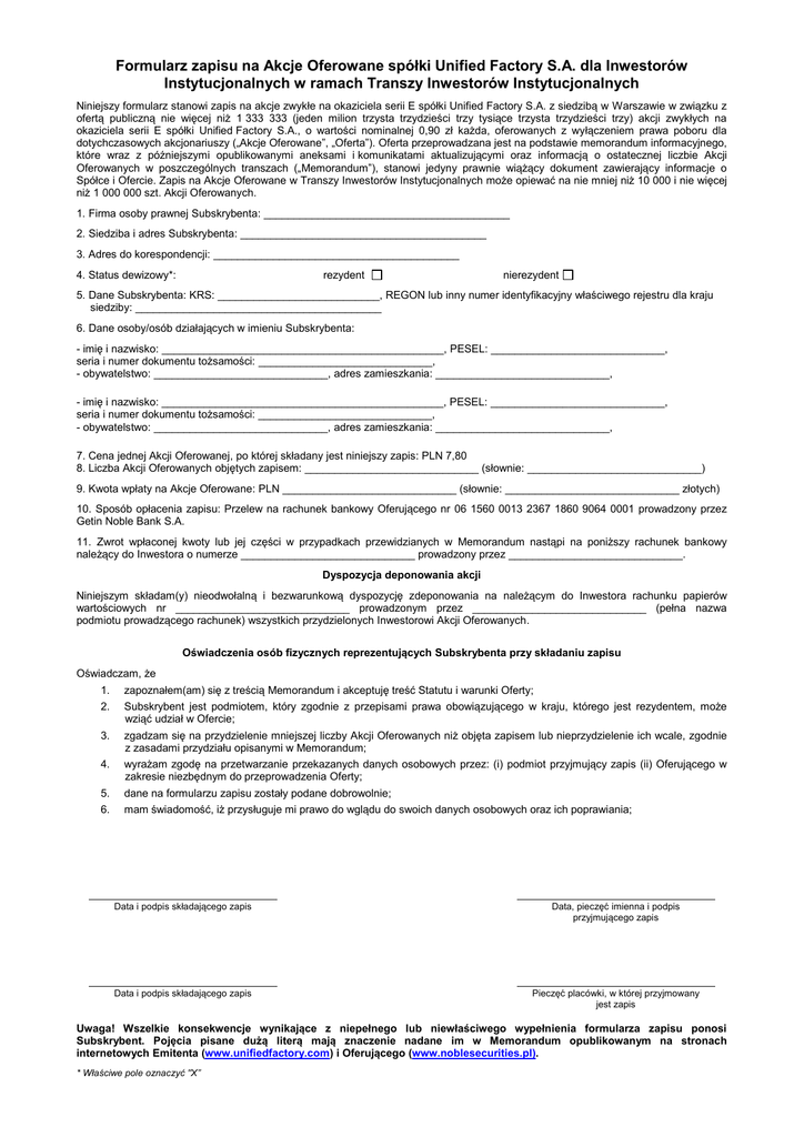 Formularz zapisu na Akcje Oferowane spółki Unified Factory S.A. dla Inwestorów Instytucjonalnych w ramach Transzy Inwestorów Instytucjonalnych Niniejszy formularz stanowi zapis na akcje zwykłe na okaziciela serii E spółki Unified Factory S.A. z siedzibą w Warszawie w związku z ofertą publiczną nie więcej niż 1 333 333 (jeden milion trzysta trzydzieści trzy tysiące trzysta trzydzieści trzy) akcji zwykłych na okaziciela serii E spółki Unified Factory S.A., o wartości nominalnej 0,90 zł każda, oferowanych z wyłączeniem prawa poboru dla dotychczasowych akcjonariuszy („Akcje Oferowane”, „Oferta”). Oferta przeprowadzana jest na podstawie memorandum informacyjnego, które wraz z późniejszymi opublikowanymi aneksami i komunikatami aktualizującymi oraz informacją o ostatecznej liczbie Akcji Oferowanych w poszczególnych transzach („Memorandum”), stanowi jedyny prawnie wiążący dokument zawierający informacje o Spółce i Ofercie. Zapis na Akcje Oferowane w Transzy Inwestorów Instytucjonalnych może opiewać na nie mniej niż 10 000 i nie więcej niż 1 000 000 szt. Akcji Oferowanych. 1. Firma osoby prawnej Subskrybenta: _________________________________________ 2. Siedziba i adres Subskrybenta: _________________________________________ 3. Adres do korespondencji: _________________________________________ 4. Status dewizowy*: rezydent nierezydent 5. Dane Subskrybenta: KRS: ___________________________, REGON lub inny numer identyfikacyjny właściwego rejestru dla kraju siedziby: _________________________________________ 6. Dane osoby/osób działających w imieniu Subskrybenta: - imię i nazwisko: _______________________________________________, PESEL: _____________________________, seria i numer dokumentu tożsamości: _____________________________, - obywatelstwo: _____________________________, adres zamieszkania: _____________________________, - imię i nazwisko: _______________________________________________, PESEL: _____________________________, seria i numer dokumentu tożsamości: _____________________________, - obywatelstwo: _____________________________, adres zamieszkania: _____________________________, 7. Cena jednej Akcji Oferowanej, po której składany jest niniejszy zapis: PLN 7,80 8. Liczba Akcji Oferowanych objętych zapisem: _____________________________ (słownie: _____________________________) 9. Kwota wpłaty na Akcje Oferowane: PLN _____________________________ (słownie: _____________________________ złotych) 10. Sposób opłacenia zapisu: Przelew na rachunek bankowy Oferującego nr 06 1560 0013 2367 1860 9064 0001 prowadzony przez Getin Noble Bank S.A. 11. Zwrot wpłaconej kwoty lub jej części w przypadkach przewidzianych w Memorandum nastąpi na poniższy rachunek bankowy należący do Inwestora o numerze _____________________________ prowadzony przez _____________________________. Dyspozycja deponowania akcji Niniejszym składam(y) nieodwołalną i bezwarunkową dyspozycję zdeponowania na należącym do Inwestora rachunku papierów wartościowych nr _____________________________ prowadzonym przez _____________________________ (pełna nazwa podmiotu prowadzącego rachunek) wszystkich przydzielonych Inwestorowi Akcji Oferowanych. Oświadczenia osób fizycznych reprezentujących Subskrybenta przy składaniu zapisu Oświadczam, że 1. zapoznałem(am) się z treścią Memorandum i akceptuję treść Statutu i warunki Oferty; 2. Subskrybent jest podmiotem, który zgodnie z przepisami prawa obowiązującego w kraju, którego jest rezydentem, może wziąć udział w Ofercie; 3. zgadzam się na przydzielenie mniejszej liczby Akcji Oferowanych niż objęta zapisem lub nieprzydzielenie ich wcale, zgodnie z zasadami przydziału opisanymi w Memorandum; 4. wyrażam zgodę na przetwarzanie przekazanych danych osobowych przez: (i) podmiot przyjmujący zapis (ii) Oferującego w zakresie niezbędnym do przeprowadzenia Oferty; 5. dane na formularzu zapisu zostały podane dobrowolnie; 6. mam świadomość, iż przysługuje mi prawo do wglądu do swoich danych osobowych oraz ich poprawiania; Data i podpis składającego zapis Data, pieczęć imienna i podpis przyjmującego zapis Data i podpis składającego zapis Pieczęć placówki, w której przyjmowany jest zapis Uwaga! Wszelkie konsekwencje wynikające z niepełnego lub niewłaściwego wypełnienia formularza zapisu ponosi Subskrybent. Pojęcia pisane dużą literą mają znaczenie nadane im w Memorandum opublikowanym na stronach internetowych Emitenta (www.unifiedfactory.com) i Oferującego (www.noblesecurities.pl). * Właściwe pole oznaczyć "X”