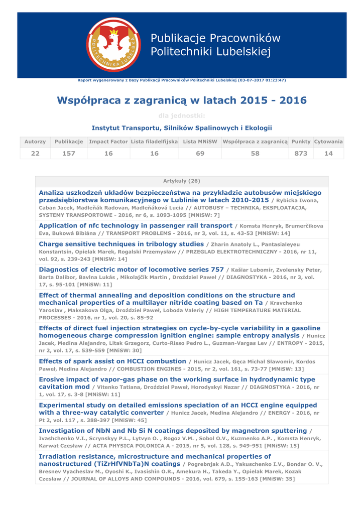 Raport wygenerowany z Bazy Publikacji Pracowników Politechniki Lubelskiej (03-07-2017 01:23:47) Współpraca z zagranicą w latach 2015 - 2016 dla jednostki: Instytut Transportu, Silników Spalinowych i Ekologii Autorzy Publikacje 22 157 Impact Factor Lista filadelfijska 16 Lista MNiSW 16 Współpraca z zagranicą Punkty Cytowania 69 58 873 14 Artykuły (26) Analiza uszkodzeń układów bezpieczeństwa na przykładzie autobusów miejskiego przedsiębiorstwa komunikacyjnego w Lublinie w latach 2010-2015 / Rybicka Iwona, Caban Jacek, Madleňák Radovan, Madleňáková Lucia // AUTOBUSY – TECHNIKA, EKSPLOATACJA, SYSTEMY TRANSPORTOWE - 2016, nr 6, s. 1093-1095 [MNiSW: 7] Application of nfc technology in passenger rail transport / Komsta Henryk, Brumerčikova Eva, Bukowá Bibiána // TRANSPORT PROBLEMS - 2016, nr 3, vol. 11, s. 43-53 [MNiSW: 14] Charge sensitive techniques in tribology studies / Zharin Anatoly L., Pantasialeyeu Konstantsin, Opielak Marek, Rogalski Przemysław // PRZEGLAD ELEKTROTECHNICZNY - 2016, nr 11, vol. 92, s. 239-243 [MNiSW: 14] Diagnostics of electric motor of locomotive series 757 / Kašiar Lubomír, Zvolensky Peter, Barta Dalibor, Bavlna Lukás , Mikolajčík Martin , Droździel Paweł // DIAGNOSTYKA - 2016, nr 3, vol. 17, s. 95-101 [MNiSW: 11] Effect of thermal annealing and deposition conditions on the structure and mechanical properties of a multilayer nitride coating based on Ta / Kravchenko Yaroslav , Maksakova Olga, Droździel Paweł, Loboda Valeriy // HIGH TEMPERATURE MATERIAL PROCESSES - 2016, nr 1, vol. 20, s. 85-92 Effects of direct fuel injection strategies on cycle-by-cycle variability in a gasoline homogeneous charge compression ignition engine: sample entropy analysis / Hunicz Jacek, Medina Alejandro, Litak Grzegorz, Curto-Risso Pedro L., Guzman-Vargas Lev // ENTROPY - 2015, nr 2, vol. 17, s. 539-559 [MNiSW: 30] Effects of spark assist on HCCI combustion / Hunicz Jacek, Gęca Michał Sławomir, Kordos Paweł, Medina Alejandro // COMBUSTION ENGINES - 2015, nr 2, vol. 161, s. 73-77 [MNiSW: 13] Erosive impact of vapor-gas phase on the working surface in hydrodynamic type cavitation mod / Vitenko Tatiana, Droździel Paweł, Horodyskyi Nazar // DIAGNOSTYKA - 2016, nr 1, vol. 17, s. 3-8 [MNiSW: 11] Experimental study on detailed emissions speciation of an HCCI engine equipped with a three-way catalytic converter / Hunicz Jacek, Medina Alejandro // ENERGY - 2016, nr Pt 2, vol. 117 , s. 388-397 [MNiSW: 45] Investigation of NbN and Nb Si N coatings deposited by magnetron sputtering / Ivashchenko V.I., Scrynskyy P.L., Lytvyn O. , Rogoz V.M. , Sobol O.V., Kuzmenko A.P. , Komsta Henryk, Karwat Czesław // ACTA PHYSICA POLONICA A - 2015, nr 5, vol. 128, s. 949-951 [MNiSW: 15] Irradiation resistance, microstructure and mechanical properties of nanostructured (TiZrHfVNbTa)N coatings / Pogrebnjak A.D., Yakuschenko I.V., Bondar O. V., Bresnev Vyacheslav M., Oyoshi K., Ivasishin O.R., Amekura H., Takeda Y., Opielak Marek, Kozak Czesław // JOURNAL OF ALLOYS AND COMPOUNDS - 2016, vol. 679, s. 155-163 [MNiSW: 35] Monitoring pozostałości herbicydów z grupy sufonylomoczników i ich metabolitów w glebach rolniczych / Ignatovets Olga, Leontiev Viktor, Achramovich Tatyana, Luhin Valery, Lazovskaya Olesya, Kierczyński Konrad, Gutten Miroslav , Sebok Milan, Opielak Marek // PRZEMYSL CHEMICZNY - 2015, nr 12, vol. 94, s. 2247-2250 [MNiSW: 15] Municipal transport - infrastructure / Rybicka Iwona, Droździel Paweł, Caban Jacek, Madleňák Radovan // TRANSPORT AND COMMUNICATIONS - 2016, nr 2, vol. 4, s. 18-22 Nanostructural TiN/Cu coatings deposited from the separated plasma flows / Latushkina Svetlana D., Kuis Dmitiy V. , Zhizhchenko Alexey G. , Posylkina Olga I. , Piskunova Olga Y. , Opielak Marek // PRZEGLAD ELEKTROTECHNICZNY - 2016, nr 8, s. 173-175 [MNiSW: 14] Ocena realizacji zamówień towarów do regionalnego centrum dystrybucyjnego wybranej sieci handlowej / Droździel Paweł, Rybicka Iwona, Boryga Paulina, Madleňák Radovan // TTS TECHNIKA TRANSPORTU SZYNOWEGO - 2015, nr 12, s. 435-438 [MNiSW: 5] Process of formation of spheroidal gold particles and of nanophases in AlN−TiB2−TiSi2 coatings after annealing with subsequent implantation / Demianenko Artem A., Smyrnova-Trybulska Eugenia, Zhollybekov Bahyt, Kupchishin A.I., Takeda Y., Amekura H., Komsta Henryk, Opielak Marek, Kierczyński Konrad // HIGH TEMPERATURE MATERIAL PROCESSES - 2015, nr 2, vol. 19, s. 189-200 Prospects of international freight transport in the eastwest direction / Droździel Paweł, Buková Bibiána, Brumerčikova Eva // TRANSPORT PROBLEMS - 2015, nr 4, vol. 10, s. 5-13 [MNiSW: 14] The reliability model for failure cause analysis of pressure vessel protective fittings with taking into account load-sharing effect between valves / Stefanovych Tetyana, Shcherbovskykh Serhiy, Droździel Paweł // DIAGNOSTYKA - 2015, nr 4, vol. 16, s. 17-24 [MNiSW: 11] The research on ageing of glycol-based brake fluids of vehicles in operation / Caban Jacek, Droździel Paweł, Vrábel Ján, Šarkan Branislav, Marczuk Andrzej, Krzywonos Leszek, Rybicka Iwona // ADVANCES IN SCIENCE AND TECHNOLOGY RESEARCH JOURNAL - 2016, nr 32, vol. 10, s. 9-16 [MNiSW: 10] Simulation of components mixing in order to determine working bodies rational parameters / Droździel Paweł, Stadnyk Igor, Vitenko Tatiana, Derkach Andrij // ADVANCES IN SCIENCE AND TECHNOLOGY RESEARCH JOURNAL - 2016, nr 31, vol. 10, s. 130-138 [MNiSW: 10] Simulation of Radiation Effects in SiO2/Si Structures / Komarov F.F., Zayats G.M., Komarov A.F., Miskiewicz S.A., Michailov V.V., Komsta Henryk // ACTA PHYSICA POLONICA A - 2015, nr 5, vol. 128, s. 857-860 [MNiSW: 15] Stan bezpieczeństwa ruchu drogowego w Polsce i na Słowacji w latach 2004-2014 / Sopoćko Mateusz, Porębska Ewelina, Caban Jacek, Turski Andrzej, Vrábel Ján, Rybicka Iwona, Marczuk Andrzej // AUTOBUSY – TECHNIKA, EKSPLOATACJA, SYSTEMY TRANSPORTOWE - 2016, nr 6, s. 420-424 [MNiSW: 7] Struct