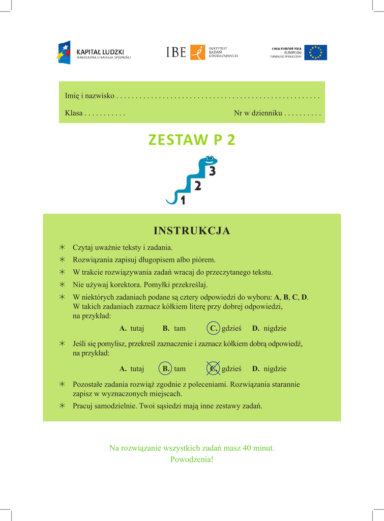 Imię i nazwisko . . . . . . . . . . . . . . . . . . . . . . . . . . . . . . . . . . . . . . . . . . . . . . . . . . . . . Klasa . . . . . . . . . . . Nr w dzienniku . . . . . . . . . . ZESTAW p 2 Instrukcja ¼¼ Czytaj uważnie teksty i zadania. ¼¼ Rozwiązania zapisuj długopisem albo piórem. ¼¼ W trakcie rozwiązywania zadań wracaj do przeczytanego tekstu. ¼¼ Nie używaj korektora. Pomyłki przekreślaj. ¼¼ W niektórych zadaniach podane są cztery odpowiedzi do wyboru: A, B, C, D. W takich zadaniach zaznacz kółkiem literę przy dobrej odpowiedzi, na przykład: A. tutaj B. tam C. gdzieś D. nigdzie ¼¼ Jeśli się pomylisz, przekreśl zaznaczenie i zaznacz kółkiem dobrą odpowiedź, na przykład: A. tutaj B. tam C. gdzieś D. nigdzie ¼¼ Pozostałe zadania rozwiąż zgodnie z poleceniami. Rozwiązania starannie zapisz w wyznaczonych miejscach. ¼¼ Pracuj samodzielnie. Twoi sąsiedzi mają inne zestawy zadań. Na rozwiązanie wszystkich zadań masz 40 minut. Powodzenia! Przeczytaj uważnie tekst. Przyjęcie w zamku Głos książęcego herolda, który odczytywał na placu ogłoszenie, obudził wieś położoną u podnóża zamku. „Nasz umiłowany pan zaprasza wszystkich swoich dobrych i wiernych poddanych do udziału w przyjęciu wydanym z okazji swoich urodzin. Każdy otrzyma miłą niespodziankę. Pan prosi jednak wszystkich o małą przysługę: osoby, które wezmą udział w przyjęciu, niech przyniosą ze sobą trochę wody, aby uzupełnić kończące się rezerwy zamkowe…” Herold powtórzył kilkakrotnie to ogłoszenie, potem odwrócił się i pod eskortą straży powrócił do zamku. Mieszkańcy wsi w różny sposób reagowali na zaproszenie. – Oh! To zawsze ten sam tyran! Ma wystarczająco wielu służących, by uzupełnić zbiornik… Ja zaniosę szklankę wody i to wystarczy! – Ależ nie! Był zawsze dobry i szczodry! Ja przyniosę baryłkę! – A ja… naparstek wody! – Ja beczkę! Rano, w dniu przyjęcia, można było zobaczyć dziwny orszak zdążający do zamku. Niektórzy pchali z wysiłkiem potężne beczki lub nieśli, sapiąc, wielkie wiadra pełne wody. Inni, wyśmiewając się z nich, nieśli małe karafki albo szklanki na tacy. Orszak ten wszedł na podwórzec zamkowy. Tam każdy wylewał do dużego zbiornika wodę ze swojego naczynia, ustawiał je w kącie i podążał do sali bankietowej. Świetne dania i napoje, tańce i śpiewy przeplatały się bez przerwy. Wreszcie pod wieczór pan zamku podziękował wszystkim w uprzejmych słowach za przybycie i powrócił do swych komnat. – A przyrzeczona niespodzianka? – szemrali niektórzy rozczarowani i niezadowoleni. Innych przepełniała radość: – Nasz pan zorganizował dla nas wspaniałą uroczystość! – mówili. Każdy przed powrotem do domu udał się po swój pojemnik. Dały się słyszeć krzyki, które gwałtownie się nasilały. Były to okrzyki radości i złości. Pojemniki zostały napełnione aż po brzegi złotymi monetami! Na podstawie: Bruno Ferrero, Przyjęcie na zamku, [w:] Śpiew polnego świerszcza, Warszawa 1998. 2 ZESTAW p 2 Na podstawie przeczytanego tekstu wykonaj zadania od 1. do 8. 1. Po co książę zorganizował przyjęcie? A. B. C. D. Chciał wypróbować poddanych. Chciał pochwalić się swoim bogactwem. Chciał napełnić wodą zamkowy zbiornik. Chciał dostać urodzinowe prezenty. 2. Co było w ogłoszeniu herolda? Zaznacz wszystkie poprawne odpowiedzi. Obietnica niespodzianki. Przypomnienie o obowiązkach. Groźba kary. Zaproszenie na przyjęcie. Prośba o przysługę. 3. Co zrobił herold, żeby ogłoszenie usłyszeli wszyscy mieszkańcy wioski? A. B. C. D. Czytał ogłoszenie ze wzgórza. Czytał ogłoszenie kilka razy. Czytał ogłoszenie przez specjalną tubę. Czytał ogłoszenie osobno każdemu poddanemu. 4. Dlaczego książę nie określił dokładnie, ile każdy poddany ma przynieść wody? ............................................................................................... 5. W drodze na przyjęcie niektórzy poddani wyśmiewali się z innych. Dlaczego? ............................................................................................... ............................................................................................... zestaw P 2 3 6. Po przyjęciu poddani poszli po swoje naczynia. Wkrótce rozległy się stamtąd okrzyki radości i złości. Kto krzyczał z radości, a kto ze złości? ............................................................................................... ............................................................................................... ............................................................................................... 7. Jaką niespodziankę książę zrobił swoim poddanym? A. B. C. D. Książę zaprosił na przyjęcie wszystkich mieszkańców. Książę sam przygotował świetne dania i napoje. Książę wyszedł z przyjęcia przed jego zakończeniem. Książę każdego sprawiedliwie obdarował złotem. 8. Co można powiedzieć o księciu na podstawie tej historii? Zaznacz wszystkie poprawne odpowiedzi. 4 Był mądry. Był waleczny. Był sprawiedliwy. Był chciwy. Był okrutny. ZESTAW p 2 Jeżeli rozwiązałeś zadania do tekstu Przyjęciewzamku, przewróć kartkę na drugą stronę. ZESTAW p 2 5 Przeczytaj uważnie tekst. Zaćmienie Słońca w Twoim domu Układ Słoneczny składa się ze Słońca i związanych z nim ciał niebieskich, do których należą Ziemia i Księżyc. Planety, w tym także Ziemia, krążą wokół Słońca, a wokół Ziemi krąży Księżyc. Zaćmienie Słońca powstaje, gdy Słońce, Księżyc i Ziemia ustawią się w jednej linii. Wtedy Księżyc przesłania nam Słońce. Zjawisko to występuje od dwóch do pięciu razy w roku, ale wcale nie jest tak łatwo je zaobserwować - trzeba być w odpowiednim miejscu kuli ziemskiej we właściwym czasie, musi być także dobra pogoda. Możesz jednak we własnym domu przeprowadzić pr