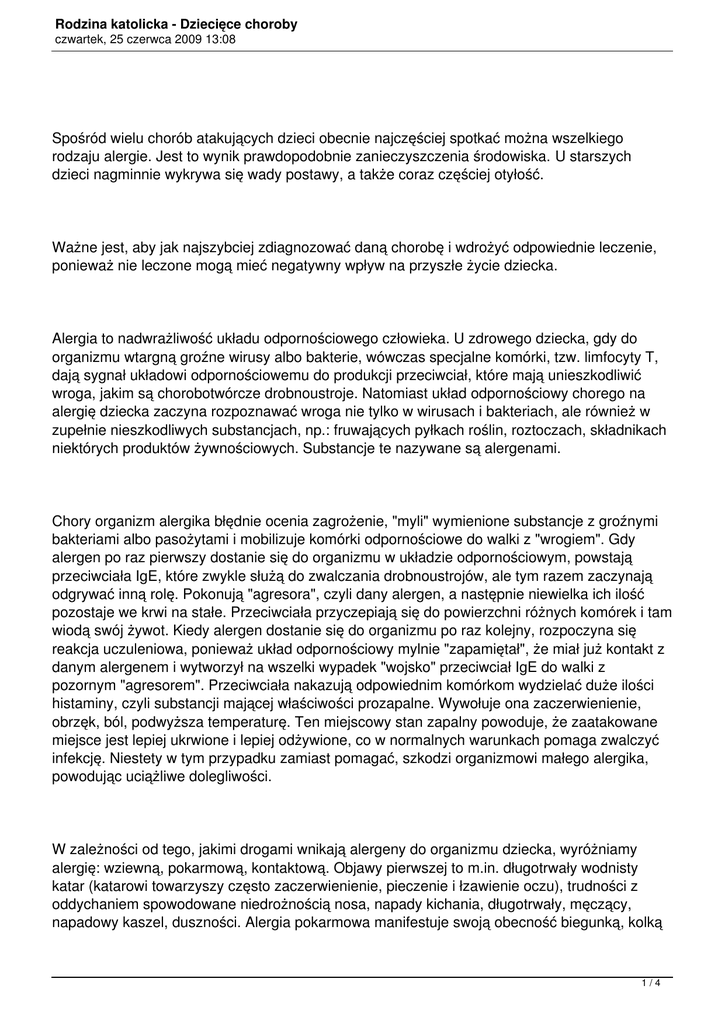 Rodzina katolicka - Dziecięce choroby czwartek, 25 czerwca 2009 13:08 Spośród wielu chorób atakujących dzieci obecnie najczęściej spotkać można wszelkiego rodzaju alergie. Jest to wynik prawdopodobnie zanieczyszczenia środowiska. U starszych dzieci nagminnie wykrywa się wady postawy, a także coraz częściej otyłość. Ważne jest, aby jak najszybciej zdiagnozować daną chorobę i wdrożyć odpowiednie leczenie, ponieważ nie leczone mogą mieć negatywny wpływ na przyszłe życie dziecka. Alergia to nadwrażliwość układu odpornościowego człowieka. U zdrowego dziecka, gdy do organizmu wtargną groźne wirusy albo bakterie, wówczas specjalne komórki, tzw. limfocyty T, dają sygnał układowi odpornościowemu do produkcji przeciwciał, które mają unieszkodliwić wroga, jakim są chorobotwórcze drobnoustroje. Natomiast układ odpornościowy chorego na alergię dziecka zaczyna rozpoznawać wroga nie tylko w wirusach i bakteriach, ale również w zupełnie nieszkodliwych substancjach, np.: fruwających pyłkach roślin, roztoczach, składnikach niektórych produktów żywnościowych. Substancje te nazywane są alergenami. Chory organizm alergika błędnie ocenia zagrożenie, "myli" wymienione substancje z groźnymi bakteriami albo pasożytami i mobilizuje komórki odpornościowe do walki z "wrogiem". Gdy alergen po raz pierwszy dostanie się do organizmu w układzie odpornościowym, powstają przeciwciała IgE, które zwykle służą do zwalczania drobnoustrojów, ale tym razem zaczynają odgrywać inną rolę. Pokonują "agresora", czyli dany alergen, a następnie niewielka ich ilość pozostaje we krwi na stałe. Przeciwciała przyczepiają się do powierzchni różnych komórek i tam wiodą swój żywot. Kiedy alergen dostanie się do organizmu po raz kolejny, rozpoczyna się reakcja uczuleniowa, ponieważ układ odpornościowy mylnie "zapamiętał", że miał już kontakt z danym alergenem i wytworzył na wszelki wypadek "wojsko" przeciwciał IgE do walki z pozornym "agresorem". Przeciwciała nakazują odpowiednim komórkom wydzielać duże ilości histaminy, czyli substancji mającej właściwości prozapalne. Wywołuje ona zaczerwienienie, obrzęk, ból, podwyższa temperaturę. Ten miejscowy stan zapalny powoduje, że zaatakowane miejsce jest lepiej ukrwione i lepiej odżywione, co w normalnych warunkach pomaga zwalczyć infekcję. Niestety w tym przypadku zamiast pomagać, szkodzi organizmowi małego alergika, powodując uciążliwe dolegliwości. W zależności od tego, jakimi drogami wnikają alergeny do organizmu dziecka, wyróżniamy alergię: wziewną, pokarmową, kontaktową. Objawy pierwszej to m.in. długotrwały wodnisty katar (katarowi towarzyszy często zaczerwienienie, pieczenie i łzawienie oczu), trudności z oddychaniem spowodowane niedrożnością nosa, napady kichania, długotrwały, męczący, napadowy kaszel, duszności. Alergia pokarmowa manifestuje swoją obecność biegunką, kolką 1/4 Rodzina katolicka - Dziecięce choroby czwartek, 25 czerwca 2009 13:08 u niemowląt czy mdłościami bądź wymiotami. Objawy, które obserwujemy na skórze w przypadku tych alergii, a także alergii kontaktowej, to m.in.: wysypka, rumień, pokrzywka. Pierwsze objawy alergii mogą wystąpić w każdym wieku dziecka, zarówno u niemowlęcia, jak i starszego malucha. Geneza alergii nie jest na razie poznana, choć są przypuszczenia, że alergię można dziedziczyć. Wzrost liczby zachorowań tłumaczy się również większym zanieczyszczeniem środowiska. Jeżeli podejrzewamy, że dziecko ma alergię, warto poinformować o tym pediatrę. Jeżeli rzeczywiście będą przesłanki świadczące o alergii, pediatra skieruje dziecko do specjalisty alergologa, który zadecyduje o przeprowadzeniu testów, oznaczeniu przeciwciał IgE w surowicy krwi lub o innych niezbędnych badaniach diagnostycznych. Im szybciej dziecko znajdzie się u specjalisty, który zdiagnozuje dziecko, tym choroba będzie miała łagodniejszy przebieg. Nieleczona alergia wziewna może doprowadzić do poważnych powikłań, m.in. do powstania astmy, przewlekłej choroby zapalnej oskrzeli. Poza tym alergia często mylona jest z chorobami dróg oddechowych, a dziecku przepisywane są niepotrzebnie antybiotyki. Jeśli okaże się, że dziecko jest alergikiem, alergolog pomoże dziecku w chorobie. Dziecko będzie zapewne musiało unikać kontaktu z uczulającymi alergenami, a czasami będzie przyjmować stosowne leki. Alergolog może również zaproponować kurację odczulającą. Polega ona na podawaniu m.in. podskórnych zastrzyków czy szczepionek odczulających: doustnie, podjęzykowo, które zawierają minimalne ilości danego alergenu. Chodzi o to, żeby organizm powoli przyzwyczajał się do alergenu i uczył się tolerować substancję, którą dotychczas zwalczał. Cała kuracja może trwać 4-5 lat. Później trzeba przyjmować jeszcze tak zwane dawki przypominające. "Krzywe" plecy Obecnie coraz częściej dzieci i młodzież ma różnorakie wady postawy. Przyczyny takiego stanu rzeczy to m.in. siedzący tryb życia, zbyt mała aktywność ruchowa dziecka i wykonywanie przez nie czynności dnia codziennego w niewłaściwych pozycjach, pochopne decyzje o zwolnieniu 2/4 Rodzina katolicka - Dziecięce choroby czwartek, 25 czerwca 2009 13:08 dziecka z lekcji WF, nieuczestniczenie w zajęciach z gimnastyki korekcyjnej mimo wskazań lekarza lub nauczyciela WF, niezdrowy tryb życia, tzn. niewłaściwa ilość snu, złe odżywianie powodujące nadwagę i otyłość, brak ruchu na świeżym powietrzu. Przyczyną może być również nieprawidłowa opieka i pielęgnacja dziecka w okresie wczesnodziecięcym, np.: noszenie dziecka przez matkę ciągle na tym samym ręku, chodzenie na spacer, trzymając je ciągle za tę samą rączkę, używanie chodzików, niewłaściwe obuwie, bagatelizowanie wczesnych symptomów nieprawidłowości w postawie ciała. Oczywiście wady postawy mogą wynikać ró