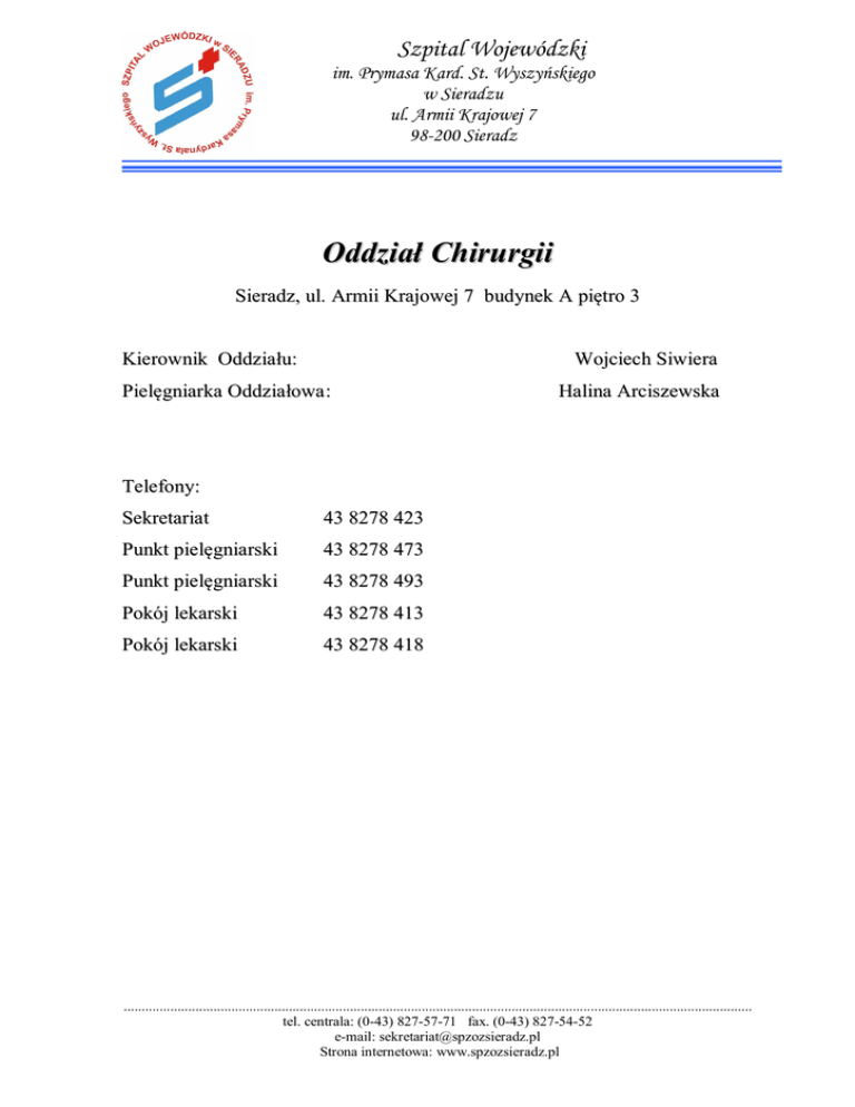 Szpital Wojewódzki im. Prymasa Kard. St. Wyszyńskiego w Sieradzu ul. Armii Krajowej 7 98-200 Sieradz Oddział Chirurgii Sieradz, ul. Armii Krajowej 7 budynek A piętro 3 Kierownik Oddziału: Wojciech Siwiera Pielęgniarka Oddziałowa : Halina Arciszewska Telefony: Sekretariat 43 8278 423 Punkt pielęgniarski 43 8278 473 Punkt pielęgniarski 43 8278 493 Pokój lekarski 43 8278 413 Pokój lekarski 43 8278 418 ............................................................................................................................................................................... tel. centrala: (0-43) 827-57-71 fax. (0-43) 827-54-52 e-mail: [email protected] Strona internetowa: www.spzozsieradz.pl
