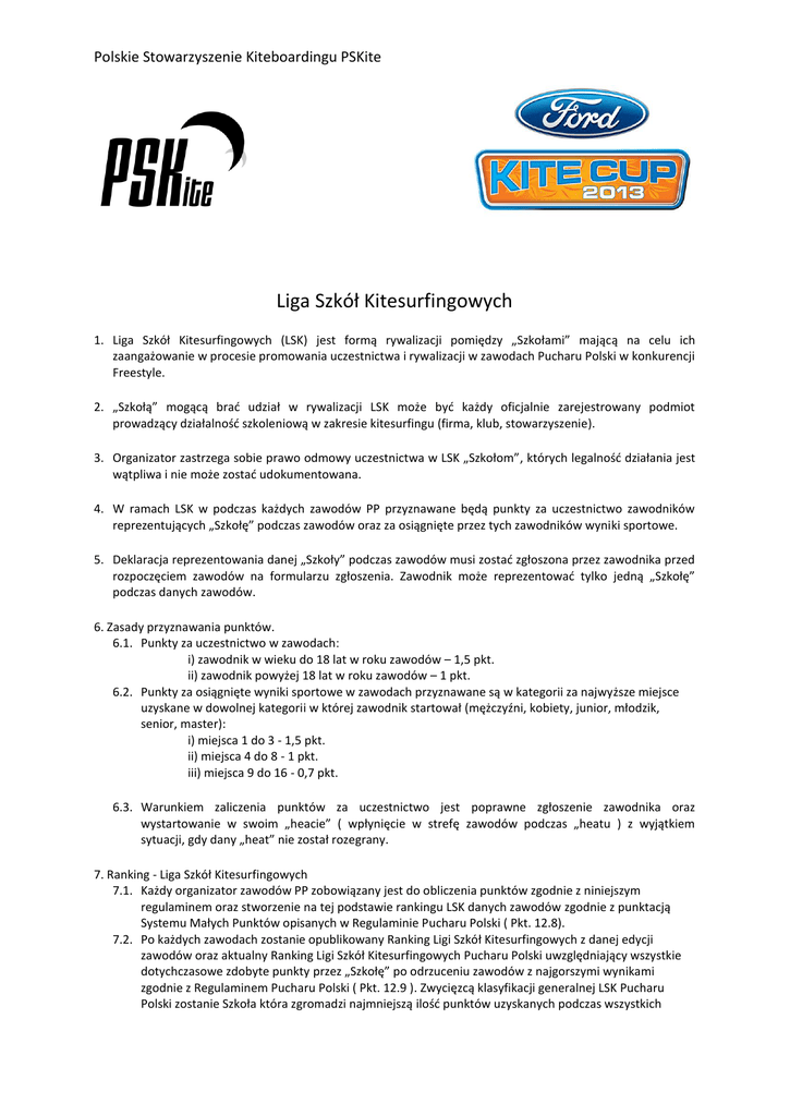 Polskie Stowarzyszenie Kiteboardingu PSKite Liga Szkół Kitesurfingowych 1. Liga Szkół Kitesurfingowych (LSK) jest formą rywalizacji pomiędzy „Szkołami” mającą na celu ich zaangażowanie w procesie promowania uczestnictwa i rywalizacji w zawodach Pucharu Polski w konkurencji Freestyle. 2. „Szkołą” mogącą brad udział w rywalizacji LSK może byd każdy oficjalnie zarejestrowany podmiot prowadzący działalnośd szkoleniową w zakresie kitesurfingu (firma, klub, stowarzyszenie). 3. Organizator zastrzega sobie prawo odmowy uczestnictwa w LSK „Szkołom”, których legalnośd działania jest wątpliwa i nie może zostad udokumentowana. 4. W ramach LSK w podczas każdych zawodów PP przyznawane będą punkty za uczestnictwo zawodników reprezentujących „Szkołę” podczas zawodów oraz za osiągnięte przez tych zawodników wyniki sportowe. 5. Deklaracja reprezentowania danej „Szkoły” podczas zawodów musi zostad zgłoszona przez zawodnika przed rozpoczęciem zawodów na formularzu zgłoszenia. Zawodnik może reprezentowad tylko jedną „Szkołę” podczas danych zawodów. 6. Zasady przyznawania punktów. 6.1. Punkty za uczestnictwo w zawodach: i) zawodnik w wieku do 18 lat w roku zawodów – 1,5 pkt. ii) zawodnik powyżej 18 lat w roku zawodów – 1 pkt. 6.2. Punkty za osiągnięte wyniki sportowe w zawodach przyznawane są w kategorii za najwyższe miejsce uzyskane w dowolnej kategorii w której zawodnik startował (mężczyźni, kobiety, junior, młodzik, senior, master): i) miejsca 1 do 3 - 1,5 pkt. ii) miejsca 4 do 8 - 1 pkt. iii) miejsca 9 do 16 - 0,7 pkt. 6.3. Warunkiem zaliczenia punktów za uczestnictwo jest poprawne zgłoszenie zawodnika oraz wystartowanie w swoim „heacie” ( wpłynięcie w strefę zawodów podczas „heatu ) z wyjątkiem sytuacji, gdy dany „heat” nie został rozegrany. 7. Ranking - Liga Szkół Kitesurfingowych 7.1. Każdy organizator zawodów PP zobowiązany jest do obliczenia punktów zgodnie z niniejszym regulaminem oraz stworzenie na tej podstawie rankingu LSK danych zawodów zgodnie z punktacją Systemu Małych Punktów opisanych w Regulaminie Pucharu Polski ( Pkt. 12.8). 7.2. Po każdych zawodach zostanie opublikowany Ranking Ligi Szkół Kitesurfingowych z danej edycji zawodów oraz aktualny Ranking Ligi Szkół Kitesurfingowych Pucharu Polski uwzględniający wszystkie dotychczasowe zdobyte punkty przez „Szkołę” po odrzuceniu zawodów z najgorszymi wynikami zgodnie z Regulaminem Pucharu Polski ( Pkt. 12.9 ). Zwycięzcą klasyfikacji generalnej LSK Pucharu Polski zostanie Szkoła która zgromadzi najmniejszą ilośd punktów uzyskanych podczas wszystkich Polskie Stowarzyszenie Kiteboardingu PSKite zawodów Pucharu Polski. Rankingi publikowane będą na oficjalnej stronie PP www.fordcup.pl, na oficjalnym profilu Facebook Ford Kite Cup oraz na stronie pskite.pl. 8. Nagrody w Lidze Szkół Kitesurfingowych 8.1. Po każdych zawodach pierwsze 3 miejsca uzyskane przez „Szkoły” nagrodzone zostaną dyplomami. 8.2. Po ostatnich zawodach Pucharu Polski pierwsze 3 miejsca uzyskane przez „Szkoły” nagrodzone zostaną dyplomami, a „Szkoła” która uzyska 1 miejsce otrzyma Puchar Polski Ligi Szkół Kitesurfingowych.