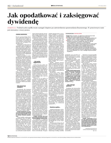 H2 / Rachunkowość 25 marca 2013 Jak opodatkować i zaksięgować dywidendę EWIDENCJA | Podział zysku spółki może nastąpić dopiero po zatwierdzeniu sprawozdania finansowego. W przeciwnym razie jest nieważny z mocy prawa. Joanna Sadowska Roczne sprawozdanie finansowe jednostki podlega zatwierdzeniu przez organ zatwierdzający, nie później niż sześć miesięcy od dnia bilansowego (art. 53 ustawy o rachunkowości). Następnie, po dokonaniu tej czynności, może nastąpić podział lub pokrycie wyniku finansowego netto spółki. Przygotowując klasyfikację zatwierdzonego zysku netto należy również przestrzegać postanowień umowy spółki, zapisanych w jej statucie oraz w regulacjach zawartych w k.s.h. Dopiero prawidłowo ustaloną wartość wypłaty nazywamy dywidendą. Jej odbiorcami mogą być zarówno osoby fizyczne, jak i prawne. Dokonując dalszej analizy adresatów dywidendy będziemy mieli do czynienia z rezydentami, czyli krajowymi osobami fizycznymi bądź prawnymi lub nierezydentami – odpowiednio zagranicznymi osobami fizycznymi lub prawnymi. W zależności od tego, z którym z wyżej wymienionych podmiotów będziemy mieli do czynienia, zostaną podjęte odpowiednie kroki. Płatnik, jakim jest spółka wypłacająca dywidendę, dokona stosownych wyliczeń podatku, przeprowadzi odpowiednie operacje księgowe i udokumentuje je właściwymi deklaracjami. Gdy otrzymuje rezydent... Dywidenda dla krajowej osoby fizycznej jest przychodem z kapitałów pieniężnych, a moment obowiązku podatkowego powstaje w dacie wypłaty dywidendy lub postawienia jej do dyspozycji udziałowca/akcjonariusza (art. 17 ust. 1 pkt 4 ustawy o PIT). Wartość podatku liczona jest w sposób ryczałtowy, czyli bez uwzględniania kosztów uzyskania przychodu, z zastosowaniem stawki 19 proc. (art. 30a ust. 1 pkt 4 i ust. 6 ustawy o PIT). Dochodów z tytułu wypłaty dywidendy nie łączy się z dochodami opodatkowanymi na zasadach ogólnych (art. 30a ust. 1 ustawy o PIT). Uwaga! Udziałowiec nie wykazuje ani otrzymanej dywidendy, ani zapłaconego podatku w swoim rocznym zeznaniu podatkowym. Z kolei spółka wypłacająca dywidendę staje się płatnikiem i zobligowana jest do pobrania zryczałtowanego podatku dochodowego oraz do odprowadzenia go w imieniu podatnika do urzędu skarbowego (art. 41 ust. 4 ustawy o PIT). Dokonuje tego w terminie do 20 dnia miesiąca następującego po miesiącu, w którym pobrano podatek, na rachunek urzędu skarbo- wego, którym kieruje naczelnik urzędu skarbowego właściwy według miejsca zamieszkania podatnika – osoby fizycznej (art. 42 ustawy o PIT). Jako potwierdzenie dokonanej czynności płatnik, w terminie do końca stycznia roku następującego po roku podatkowym, a w przypadku zaprzestania działalności przez płatnika do dnia zaprzestania tej działalności, składa, do odpowiedniego urzędu skarbowego, deklarację o zryczałtowanym podatku dochodowym – PIT-8AR(2). Jeżeli dywidenda zostanie wypłacona w 2013 r., np. w wyniku podziału zysku za rok 2012, to w styczniu 2014 r. spółka będzie musiała przesłać do urzędu odpowiednie formularze. ...lub osoba zagraniczna Osoby fizyczne, które nie mają na terytorium Rzeczypospolitej Polskiej miejsca zamieszkania (osoby zagraniczne), podlegają obowiązkowi podatkowemu tylko od dochodów (przychodów) osiąganych na terytorium Rzeczypospolitej Polskiej. Jest to tak zwany ograniczony obowiązek podatkowy (art. 3 ust. 2a ustawy o PIT). Oznacza to, że osoba ta również od dochodów uzyskanych z tytułu dywidendy będzie musiała się opodatkować na terenie Polski. Jako podstawowe regulacje rozliczeń podatkowych z tytułu wypłaty dywidendy będą miały zastosowane, i jak dla osoby krajowej, przepisy art. 30a ustawy o PIT. Oznacza to obowiązek zastosowania podatku zryczałtowanego w wysokości 19 proc. Zmiana stawki możliwa jest na mocy art. 30a ust. 2 ustawy o PIT, w przypadku gdy Polska ma podpisaną umowę z innym państwem, którego obywatelem jest podatnik. Wówczas, dla celów rozliczeń, stosuje się stawki wynikające ze stosownych umów o unikaniu podwójnego opodatkowania. Dodatkowym warunkiem jest konieczność udokumentowania, dla celów podatkowych, miejsca zamieszkania podatnika. Uzyskać to można poprzez otrzymanie od niego certyfikatu rezydencji. Wydawany jest on przez właściwy dla podatnika organ administracji podatkowej. Uwaga! Certyfikat taki musi być przetłumaczony przez tłumacza przysięgłego na język polski. W umowach o unikaniu podwójnego opodatkowania uchwalono zasadę, że dywidendy podlegają opodatkowaniu zarówno w państwie, w którym znajduje się siedziba spółki, która wypłaca dywidendę, jak i w państwie, w którym ma miejsce zamieszkania lub siedzibę odbiorca dywidendy. Przyjęto jednak ograniczenia w wysokości podatku w państwie źródła, czyli w naszym przypadku w Polsce. W zależności od umowy stawki mogą wynosić 5 proc., 10 proc. lub 15 proc., przy czym przy wypłacie dywidendy dla osób fizycznych zastosowanie ma z reguły najwyższa stawka. Podobnie jak dla krajowego udziałowca, również i dla zagranicznego, spółka – płatnik kwotę zryczałtowanego podatku dochodowego wpłaca w terminie do 20 dnia miesiąca następującego po miesiącu, w którym pobrała podatek, na rachunek urzędu skarbowego, którym kieruje naczelnik urzędu skarbowego właściwy według siedziby bądź miejsca prowadzenia działalności płatnika, jeśli płatnik nie posiada siedziby (art. 42 ust. 1 ustawy o PIT). Spółka – płatnik również będzie zobligowana do przesłania do tego urzędu skarbowego w terminie do końca stycznia roku następującego po roku podatkowym deklaracji rocznej o zryczałtowanym podatku dochodowym – PIT-8AR(2). Rozliczanie osoby zagranicznej wymaga od spółki – płatnika przesłania w terminie do końca lutego roku następującego po roku podatkowym podatnikowi oraz urzędowi skarbowemu, właściwemu w sprawach opodatk
