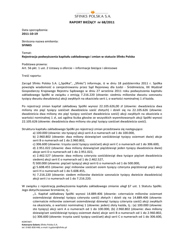 RAPORT BIEŻĄCY nr 68/2011 Data sporządzenia: 2011-10-19 Skrócona nazwa emitenta: SFINKS Temat: Rejestracja podwyższenia kapitału zakładowego i zmian w statucie Sfinks Polska Podstawa prawna: Art. 56 pkt. 1 ust. 2 Ustawy o ofercie – informacje bieżące i okresowe Treść raportu: Zarząd Sfinks Polska S.A. („Spółka”, „Sfinks”) informuje, iż w dniu 18 października 2011 r. Spółka powzięła wiadomość o zarejestrowaniu przez Sąd Rejonowy dla Łodzi - Śródmieścia, XX Wydział Gospodarczy Krajowego Rejestru Sądowego w dniu 27 września 2011 roku podwyższenia kapitału zakładowego Spółki w związku z emisją 7.216.220 (słownie: siedmiu milionów dwustu szesnastu tysięcy dwustu dwudziestu) akcji zwykłych na okaziciela serii J, o wartości nominalnej 1 zł każda. Po rejestracji zmian kapitał zakładowy Spółki wynosi 22.105.626,00 zł (słownie: dwadzieścia dwa miliony sto pięć tysięcy sześćset dwadzieścia sześć złotych) i dzieli się na 22.105.626 (słownie: dwadzieścia dwa miliony sto pięć tysięcy sześćset dwadzieścia sześć) akcji zwykłych na okaziciela o wartości nominalnej 1 zł, zaś ogólna liczba głosów ze wszystkich wyemitowanych akcji Spółki wynosi 22.105.626 (słownie: dwadzieścia dwa miliony sto pięć tysięcy sześćset dwadzieścia sześć). Struktura kapitału zakładowego Spółki po rejestracji zmian przedstawia się następująco: a) 100.000 (słownie: sto tysięcy) akcji serii A o numerach od 1 do 100.000, b) 2.960.802 (słownie: dwa miliony dziewięćset sześćdziesiąt tysięcy osiemset dwie) akcje serii B o numerach od 1 do 2.960.802, c) 306.600 (słownie: trzysta sześć tysięcy sześćset) akcji serii C o numerach od 1 do 306.600, d) 2.951.022 (słownie: dwa miliony dziewięćset pięćdziesiąt jeden tysięcy dwadzieścia dwie) akcje serii D o numerach od 1 do 2.951.022, e) 2.462.527 (słownie: dwa miliony czterysta sześćdziesiąt dwa tysiące pięćset dwadzieścia siedem) akcji serii E o numerach od 1 do 2.462.527, f) 500.000 (słownie: pięćset tysięcy) akcji serii G o numerach od 1 do 500.000, g) 5.608.455 (słownie: pięć milionów sześćset osiem tysięcy czterysta pięćdziesiąt pięć) akcji serii H o numerach od 1 do 5.608.455, h) 7.216.220 (słownie: siedem milionów dwieście szesnaście tysięcy dwieście dwadzieścia) akcji serii J o numerach od 1 do 7.216.220. W związku z rejestracją podwyższenia kapitału zakładowego zmianie uległ §7 ust. 1 Statutu Spółki. Jego dotychczasowe brzmienie, tj.: „1. Kapitał zakładowy Spółki wynosi 14.889.406 (słownie: czternaście milionów osiemset osiemdziesiąt dziewięć tysięcy czterysta sześć) złotych i dzieli się na 14.889.406 (słownie: czternaście milionów osiemset osiemdziesiąt dziewięć tysięcy czterysta sześć) akcji zwykłych na okaziciela, o wartości nominalnej 1 (słownie: jeden) złoty każda, tj.: (a) 100.000 (słownie: sto tysięcy) akcji serii A o numerach od 1 do 100.000, (b) 2.960.802 (słownie: dwa miliony dziewięćset sześćdziesiąt tysięcy osiemset dwie) akcje serii B o numerach od 1 do 2.960.802, (c) 306.600 (słownie: trzysta sześć tysięcy sześćset) akcji serii C o numerach od 1 do 306.600, KONTAKT: Katarzyna Galant; Sfinks Polska S.A. tel. 0 665 858 446; e-mail: [email protected] (d) 2.951.022 (słownie: dwa miliony dziewięćset pięćdziesiąt jeden tysięcy dwadzieścia dwie) akcje serii D o numerach od 1 do 2.951.022, (e) 2.462.527 (słownie: dwa miliony czterysta sześćdziesiąt dwa tysiące pięćset dwadzieścia siedem) akcji serii E o numerach od 1 do 2.462.527, (f) 500.000 (słownie: pięćset tysięcy) akcji serii G o numerach od 1 do 500.000, (g) 5.608.455 (słownie: pięć milionów sześćset osiem tysięcy czterysta pięćdziesiąt pięć) akcji serii H o numerach od 1 do 5.608.455.” zostało zastąpione nowym następującym brzmieniem: „1. Kapitał zakładowy Spółki wynosi 22.105.626 (dwadzieścia dwa miliony sto pięć tysięcy sześćset dwadzieścia sześć) złotych i dzieli się na 22.105.626 (dwadzieścia dwa miliony sto pięć tysięcy sześćset dwadzieścia sześć) akcji zwykłych na okaziciela, o wartości nominalnej 1 zł (jeden złoty) każda, tj.: (a) 100.000 (sto tysięcy) akcji serii A o numerach od 1 do 100.000, (b) 2.960.802 (dwa miliony dziewięćset sześćdziesiąt tysięcy osiemset dwie) akcje serii B o numerach od 1 do 2.960.802, (c) 306.600 (trzysta sześć tysięcy sześćset) akcji serii C o numerach od 1 do 306.600, (d) 2.951.022 (dwa miliony dziewięćset pięćdziesiąt jeden tysięcy dwadzieścia dwie) akcje serii D o numerach od 1 do 2.951.022, (e) 2.462.527 (dwa miliony czterysta sześćdziesiąt dwa tysiące pięćset dwadzieścia siedem) akcji serii E o numerach od 1 do 2.462.527, (f) 500.000 (pięćset tysięcy) akcji serii G o numerach od 1 do 500.000, (g) 5.608.455 (słownie: pięć milionów sześćset osiem tysięcy czterysta pięćdziesiąt pięć) akcji serii H o numerach od 1 do 5.608.455. (h) 7.216.220 (słownie: siedem milionów dwieście szesnaście tysięcy dwieście dwadzieścia) akcji serii J o numerach od 1 do 7.216.220.” W związku z dokonanymi zmianami Statutu (zmiana §7 ust.1) Spółka sporządziła tekst jednolity Statutu, który stanowi załącznik do niniejszego raportu bieżącego. Podpisy osób reprezentujących Spółkę: Sylwester Cacek Jacek Woźniewicz Prezes Zarządu Wiceprezes Zarządu Otrzymują: 1. Giełda Papierów Wartościowych w Warszawie 2. Komisja Nadzoru Finansowego 3. Polska Agencja Prasowa S.A. KONTAKT: Katarzyna Galant; Sfinks Polska S.A. tel. 0 665 858 446; e-mail: [email protected]