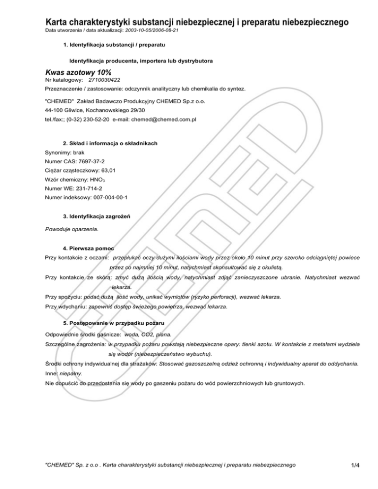 Karta charakterystyki substancji niebezpiecznej i preparatu niebezpiecznego Data utworzenia / data aktualizacji: 2003-10-05/2006-08-21 1. Identyfikacja substancji / preparatu Identyfikacja producenta, importera lub dystrybutora Kwas azotowy 10% Nr katalogowy: 2710030422 Przeznaczenie / zastosowanie: odczynnik analityczny lub chemikalia do syntez. "CHEMED" Zakład Badawczo Produkcyjny CHEMED Sp.z o.o. 44-100 Gliwice, Kochanowskiego 29/30 tel./fax:; (0-32) 230-52-20 e-mail: [email protected] 2. Skład i informacja o składnikach Synonimy: brak Numer CAS: 7697-37-2 Ciężar cząsteczkowy: 63,01 Wzór chemiczny: HNO3 Numer WE: 231-714-2 Numer indeksowy: 007-004-00-1 3. Identyfikacja zagrożeń Powoduje oparzenia. 4. Pierwsza pomoc Przy kontakcie z oczami: przepłukać oczy dużymi ilościami wody przez około 10 minut przy szeroko odciągniętej powiece przez co najmniej 10 minut, natychmiast skonsultować się z okulistą. Przy kontakcie ze skórą: zmyć dużą ilością wody, natychmiast zdjąć zanieczyszczone ubranie. Natychmiast wezwać lekarza. Przy spożyciu: podać dużą ilość wody, unikać wymiotów (ryzyko perforacji), wezwać lekarza. Przy wdychaniu: zapewnić dostęp świeżego powietrza, wezwać lekarza. 5. Postępowanie w przypadku pożaru Odpowiednie środki gaśnicze: woda, CO2, piana. Szczególne zagrożenia: w przypadku pożaru powstają niebezpieczne opary: tlenki azotu. W kontakcie z metalami wydziela się wodór (niebezpieczeństwo wybuchu). Środki ochrony indywidualnej dla strażaków: Stosować gazoszczelną odzież ochronną i indywidualny aparat do oddychania. Inne: niepalny. Nie dopuścić do przedostania się wody po gaszeniu pożaru do wód powierzchniowych lub gruntowych. "CHEMED" Sp. z o.o . Karta charakterystyki substancji niebezpiecznej i preparatu niebezpiecznego 1/4 Kwas azotowy 10% 6. Postępowanie w przypadku niezamierzonego uwolnienia do środowiska Nie wdychać par/aerozoli. Unikać zanieczyszczenia substancją. Zabrać przy pomocy substancji absorbującej ciecze. Przekazać do likwidacji. Oczyścić zanieczyszczony teren. Aby zmniejszyć szkodliwość i pochłonąć rozlaną ciecz, zobojętnić rozcieńczonym roztworem wodorotlenku sodu, wapnem lub węglanem sodu. Nie dopuścić do dostania się do wód, ścieków i gleby . 7. Postępowanie z substancją / preparatem i jej / jego magazynowanie Obchodzenie się z substancją: Zapewnić skuteczną wymianę powietrza (wentylacja). Postępować zgodnie z zasadami dobrej praktyki przemysłowej oraz ogólnymi zasadami bezpieczeństwa i higieny pracy z substancjami chemicznymi. Stosować środki ochrony osobistej zgodnie z pkt.8. Nie opróżniać do kanalizacji. Postępować zgodnie z zasadami obchodzenia się z substancjami żrącymi. Magazynowanie: szczelne opakowania, dobrze wentylowane pomieszczenie. Temperatura pokojowa (wskazane od+15 do +25 °C). 8. Kontrola narażenia i środki ochrony indywidualnej Parametry kontroli (NDS, NDSCh, NDSP): NDS: 5 mg/m3, NDSCh: 10 mg/m3 Stosować odpowiednią wentylację wywiewną, miejscową i ogólną zapewniającą utrzymanie stężenia produktu w powietrzu poniżej określonych limitów (minimum 10-krotna wymiana powietrza na godzinę). Zaleca się wyposażenie miejsca pracy w wodny natrysk do płukania oczu oraz prysznic. Środki ochrony indywidualnej powinny być tak zaprojektowane i wykonane aby wykluczały zagrożenie i inne niedogodności w przewidywanych warunkach użytkowania, chroniące przed chemikaliami. Dz. U. nr 217, Rozporządzenie z dnia 29 listopada 2002 (poz. 1833); Dz. U. nr 80, Rozporządzenie z dnia 31 marca 2003 (poz. 725), Dz. U. nr212(poz. 1769), Rozporządzenie Ministra Gospodarki i Pracy z dnia 10 października 2005 Środki ochrony indywidualnej: ochrona dróg oddechowych: konieczna gdy tworzą się pary/aerozole – maska przeciwgazowa ochrona oczu: konieczna - okulary ochronne typu gogle ochrona rąk: konieczna – rękawice ochronne, chroniące przed chemikaliami (znak CE) ochrona ciała: konieczna – ubranie kwasoodporne środki ochronne i higieny: natychmiast zmienić zanieczyszczone ubranie. Stosować krem barierowo-ochronny do skóry. Wymyć ręce i twarz po pracy z tą substancją. "CHEMED" Sp. z o.o . Karta charakterystyki substancji niebezpiecznej i preparatu niebezpiecznego 2/4 Kwas azotowy 10% 9. Własności fizykochemiczne Forma: ciecz lepkość dynamiczna: Kolor: bezbarwna lub lekko żółta lepkość kinematyczna: Zapach: ostry Ciśnienie par: brak dnych pH: <1 (20 °C) Gęstość: 1,05 g/cm3 (20°C) Temperatura topnienia: około -3°C Ciężar nasypowy: nie dotyczy Temperatura wrzenia: około 101°C Rozpuszczalność: Temperatura samozapłonu: nie dotyczy w wodzie: rozpuszczalny Temperatura zapłonu: nie dotyczy w rozpuszczalnikach organicznych: brak danych Granice wybuchowości: nie dotyczy log P(w/o): -2,3 (substancja bezwodna) górna: dolna: 10. Stabilność i reaktywność Warunki których należy unikać: brak. Materiały których należy unikać: palne substancje organiczne, proszki metali, siarczek sodu, silne zasady, terpentyna. Niebezpieczne produkty rozkładu: tlenki azotu. Następne dane: nieodpowiednie materiały do współpracy – metale (wydziela się wodór). 11. Informacje toksykologiczne Informacje toksykologiczne: brak danych ilościowych. Pozostałe dane: przy spożyciu: może powodować natychmiastowy ból i oparzenia ust, gardła, przełyku i dróg pokarmowych; przy wdychaniu: może powodować podrażnienie nosa, gardła, dróg oddechowych; przy kontakcie ze skórą: zaczerwienienie, ból, oparzenie; przy kontakcie z oczami: powoduje uszkodzenie gałki ocznej; długotrwałe narażenie: uszkodzenie zębów. 12. Informacje ekologiczne Log P(w/o): -2,3. Nie należy oczekiwać zdolności do bioakumulacji. Toksyczny dla organizmów żywych. Może powodować eutrofizację ujęć wodnych. Żrący nawet w rozcieńczeniu. Nie dopuścić do dostania się do wód, ścieków i gleby. Ryby: LC50 > 500 mg/l. 13. Po