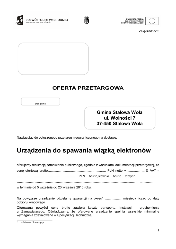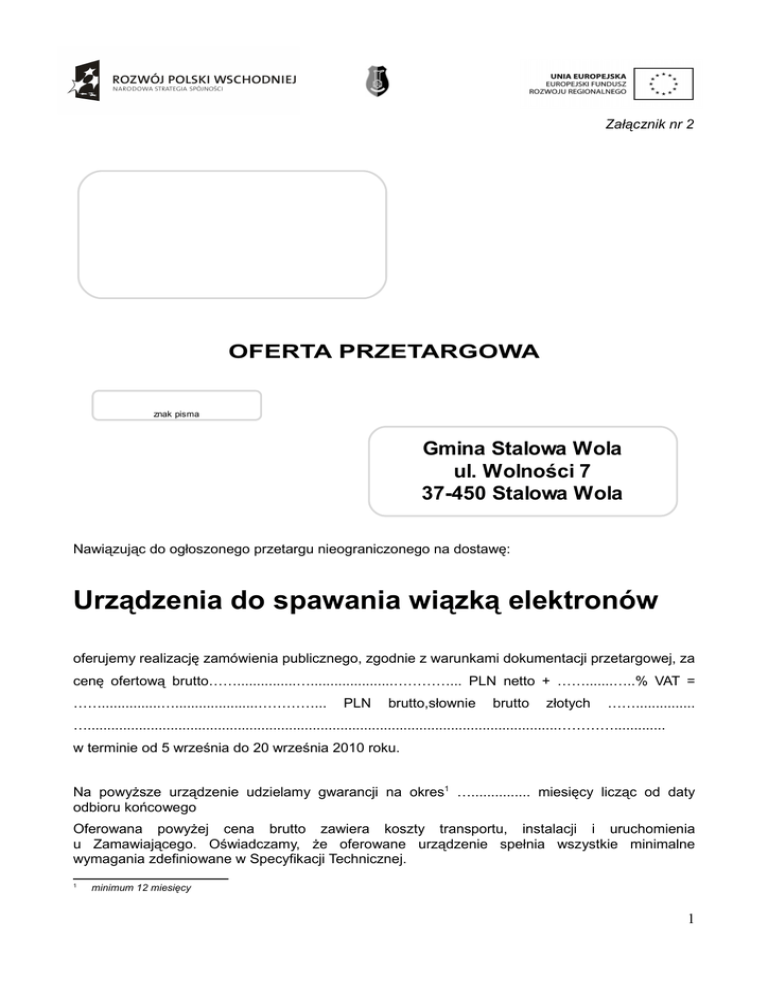 Załącznik nr 2 OFERTA PRZETARGOWA znak pisma Gmina Stalowa Wola ul. Wolności 7 37-450 Stalowa Wola Nawiązując do ogłoszonego przetargu nieograniczonego na dostawę: Urządzenia do spawania wiązką elektronów oferujemy realizację zamówienia publicznego, zgodnie z warunkami dokumentacji przetargowej, za cenę ofertową brutto……...............….....................…………... PLN netto + …….......…..% VAT = ……...............….....................…………... PLN brutto,słownie brutto złotych ……............... ….......................................................................................................................…………............. w terminie od 5 września do 20 września 2010 roku. Na powyższe urządzenie udzielamy gwarancji na okres1 …............... miesięcy licząc od daty odbioru końcowego Oferowana powyżej cena brutto zawiera koszty transportu, instalacji i uruchomienia u Zamawiającego. Oświadczamy, że oferowane urządzenie spełnia wszystkie minimalne wymagania zdefiniowane w Specyfikacji Technicznej. 1 minimum 12 miesięcy 1 Do dostawy oferujemy urządzenie2 ............................................................................. ...........................................................................posiadające poniższe parametry techniczne: PODSTAWOWE WYMAGANIA TECHNICZNE Lp. Nazwa parametru Wielkość parametru żądana Wielkość parametru oferowanego3 1. 2. 3. 4. Komora robocza 1. Wymiary wewnętrzne komory 2. Wysokość wewnętrzna komory 3. Wyposażenie komory min. 1.600 × 710 mm min. 850 mm stół krzyżowy X-Y, obrotnik do wykonywania spoin obwodowych Kolumna elektrono-optyczna 4. Katoda tantalowa, bezpośrednio żarzona 5. Maksymalny prąd wiązki min. 125 mA 6. Regulacja prądu żarzenia płynna, automatyczna lub ręczna 7. Ogniskowanie wiązki elektronów soczewka magnetyczna, regulacja płynna 8. Ruchy wykonywane przez wiązkę elektronów w czasie spawania zaprojektowane przez operatora urządzenia 9. Napięcie przyśpieszające min. 60 kV 10. Maksymalna moc urządzenia min. 10 kW 11. Zespół zasilaczy wysokiego napięcia zintegrowany z komorą wyrzutni elektronowej System próżniowy 12. Próżnia robocza w komorze roboczej max 8×10-4 hPa 13. Próżnia robocza w komorze wyrzutni max 3×10-5 hPa 14. Czas uzyskania próżni w komorze roboczej (przy rozgrzanych 2 3 max 8 minut Należy podać nazwę, typ, model urządzenia Dostawca ma obowiązek wypełnić wszystkie pola kolumny. Brak spełnienia któregokolwiek z wymaganych parametrów lub brak wpisu informującego o oferowanych parametrach powoduje odrzucenie oferty. 2 pompach dyfuzyjnych) 15. System próżniowy komory roboczej System próżniowy 16. kolumny elektronooptycznej pompa dyfuzyjna pompa Root’a pompa obrotowa pompa turbomolekularna pompa obrotowa Obserwacja procesu 17. Obserwacja bezpośrednia 18. Obserwacja pośrednia wziernik optyczny monitor LCD możliwość zastosowania powiększenia obrazu min. ×10 Parametry spawania wszystkie materiały dopuszczone do spawania za pomocą wiązki elektronów 19. Rodzaj spawanego materiału 20. Maksymalna głębokość spoiny min. 25 mm Dopuszczalna pozostałość 21. magnetyczna spawanych elementów max 0,5 Gs 22. Maksymalne wymiary spawanych elementów min. 400×700×800 mm 23. Maksymalna masa spawanych elementów min. 80 kg System sterowania Podsystem sterowania 24. procesem technologicznym prowadzenie procesu technologicznego, komunikacja z operatorem urządzenia, rejestracja parametrów procesu technologicznego Podsystemu sterowanie i kontrola procesu 25. sterowania pompowym uzyskania próżni w spawarce, analiza układem próżniowym stanu urządzenia Oprócz powyższych parametrów, oferowane urządzenie spełnia poniższe wymagania dodatkowe: 3 WYMAGANIA DODATKOWE Lp. Nazwa Opis wymagania żądany Opis wymagania oferowany4 1. 2. 3. 4. 1. Możliwość zabudowy przyrządów mocujących różnych Tak Urządzenie do rozmagnesowywania spawanych 2. elementów do poziomu magnetyzmu szczątkowego ±0,5 Gs Tak Szkolenie personelu w zakresie 3. programowania oraz obsługi maszyny (dla min 2 osób) Tak 4. Instrukcja obsługi i dokumentacja techniczna w języku polskim Tak 5. Czas reakcji serwisu nie dłuższy niż 48 godziny5 Tak Możliwość zainstalowania urządzenia w pomieszczeniu 6. posiadającym otwór drzwiowy 400×450 cm Tak Oświadczamy, że zapoznaliśmy się ze Specyfikacją Istotnych Warunków Zamówienia, nie wnosimy żadnych zastrzeżeń oraz uzyskaliśmy informacje niezbędne do przygotowania oferty. Oświadczamy, że akceptujemy sposób odbioru urządzenia w oparciu o wykonanie spawania detalu odbiorowego wskazanego przez Zamawiającego, zgodnie z rysunkami, które zostaną nam przekazane w terminie 60 dni przed datą uruchomienia urządzenia. Oświadczamy, że załączone do SIWZ wymagania stawiane Wykonawcy oraz postanowienia umowy zostały przez nas zaakceptowane bez zastrzeżeń i zobowiązujemy się, w przypadku wyboru naszej oferty, do zawarcia umowy w miejscu i terminie wyznaczonym przez Zamawiającego. Załączniki: 1. ……………………..................................................................................................................... ...............……………………… 2. ……………………..................................................................................................................... ...............……………………… 2. ……………………..................................................................................................................... ...............……………………… 4 Dostawca ma obowiązek wypełnić wszystkie pola kolumny 4. Brak spełnienia któregokolwiek z wymaganych parameyrów lub brak wpisu informującego o oferowanych parametrach powoduje odrzucenie oferty 5 Czas reakcji serwisu jest to okres czasu jaki upływa od chwili zgłoszenia awarii do momentu 
