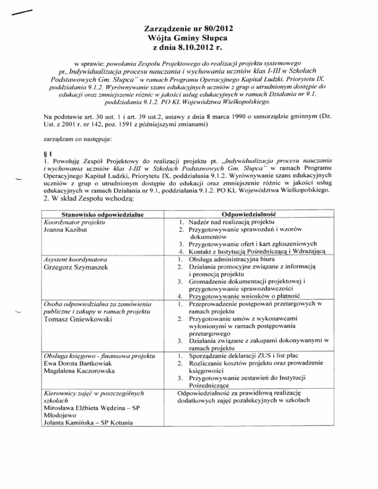 -.ł Zarządzenie nr 8012012 WÓjta Gminy Słupca z dnia 8.10.2012r. w sprawie..powołania ZespołuProjektowego do realizacji projehu systemowego pt,,Indywidualizacja procesu naucząnia i wychowania uczniÓw klas I-III w Szkołąch Podstawowych Gm. Słupca', w ramach Programu operacyjnego Kapitał Ludzki, Priorytetu IX, poddziałania 9.].2. WyrÓwnyłanie szans edukacyjnych uczniow Z grup o utrudnionym dostępie do edukacji oraz zmniejszenie roznic w jakości usługedukacyjnych w ramach Działania nr 9.], poddziatania 9.].2. Po KL WojewÓdztwa Wielkopolskiego, Na podstawieart.30 ust. 1 i art. 39 ust,2,ustawy zdnia 8 marca 1990 o Samorządziegminnym (Dz. zmianami) Ust. z 200| r. nr 142, poz. |59| z poźniejszymi zarządzam co następuje : s1 l. Powołuję Zespoł Projektowy do rea|izacji projektu pt. ,,Indywidualizacja procesu nauczania i wychowania uczniÓw klas I-III w Szkołach Podstcn,vowych Gm. Słupca,, w ramach Programu operacyjnego Kapitał Ludzki, Priorytetu lX, poddziałania9.|.2.WyrÓwnywanie SZanSedukacyjnych uczniÓw z grup o utrudnionym dostępie do edukacji oraz zmniejszenie roŻnic w jakości ustug edukacyjnychw ramachDziałanianr9.1,poddziałania9.|.2.Po KL WojewodztwaWielkopolskiego. 2. w składZespołuwchodzą: Stanowisko odpowiedzialne Koordynator projektu JoannaKazibut Asystent koordynatora Grzegorz Szymaszek osoba odpowiedzialna za zamÓwienia publiczne i zakupy w ramach projektu Tomasz Gniewkowski obsługa księgowo . finansowa projektu Ewa Dorota Bartkowiak Masdalena Kaczorowska Kierownicy zajęć w poszczegÓlnych szkotach Mirostawa Elzbieta Wedzina - SP Młodojewo JolantaKamiriska- SP Kotunia Odpowiedzialność 1 Nadzor nad rea|izacjąprojektu 2 Przygotowywanie sprawozdarii wzorÓw dokumentÓw -J Przygotowywanie ofęrt i kart zgłoszeniowych i Wdrazającą 4 Kontakt z InstłtuciąPośredniczącą 1. obsługaadministracyjnabiura 2. Działaniapromocyjne związanęz informacją i promocjąprojektu 3. Gromadzeniedokumentacjiprojektoweji i przygotowywani e sprawozdawczośc 4. PrzygotowywaniewnioskÓw o płatność l . Przeprowadzeniepostępowanprzetargowychw ramach projektu 2. Przygotowanieumow z wykonawcami wytonionymi w ramachpostępowania przetargowego 3. Działania związane z zakupami dokonywanymi w ramach proiektu 1. SporządzaniedeklaracjiZUs i list płac f . Rozliczanie kosztow projektuoraz prowadzenie księgowości 3. Przygotowywaniezestawie do Instytucji Pośredniczace odpowiedzi a|noścza prawidłowąrea|izację dodatkowychzajęćpozalekcyjnychw szkotach Aldona Dranikowska- SP Koszuty Ewa Rutkowska- SP Cienin Kościelny Zofia Janicka - SP Cienin Zaborny osoba zajmująca się księgowością urzędową Cezary Fajkowski l. NadzÓr nad obsługąksięgowo- finansową projektu 2 obsługarachunkubankowego 3 Arch iwizacja wyciągow bankowych wydatkowania 4 NadzÓr nad prawidłowością środkÓwfinansowych 5 Dokonywanie przelewÓw i wydrukow z kont 6 Przygotowanieplanu kont i obiegu dokumentÓw finansowych $2 Wszelkię umowy i porozumienia dotyczące rea|izacji projektu ,,Indywidualizacjaprocesu nauczania i wychowania uczniÓw klas I-III w SzkołachPodstctwowychGm. Słupca,' sąwyłączonez konieczności rejestrowania w centralnym rejestrze umÓw Urzędu Gminy w Słupcy. Wszelka dokumentacja wytworzonaw trakcie trwania projektubędzie przechowywanaprzęzokręs lat l0. obieg dokumentÓw i archiwizacja odbywać się będą na podstawieinstrukcji kancelaryjnejdla organÓw gmin i związkow międzygminnych(RozporządzeniePrezesaRady Ministrow z dnia l8 stycznia20l 1 r.). s3 a f0|2 r. Zarządzeniewchodzi w Życiez dniem podpisania z mocąobowiązującąod 1 wrześni worT,RtlNY craffi(łrrrtt tl