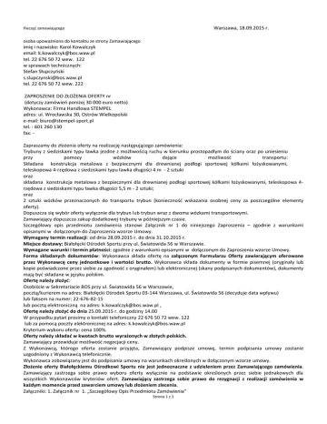 Warszawa, 18.09.2015 r. Pieczęd zamawiającego osoba upoważniona do kontaktu ze strony Zamawiającego imię i nazwisko: Karol Kowalczyk email: [email protected] tel. 22 676 50 72 wew. 122 w sprawach technicznych: Stefan Słupczyoski [email protected] tel. 22 676 50 72 wew. 222 ZAPROSZENIE DO ZŁOŻENIA OFERTY nr (dotyczy zamówieo poniżej 30 000 euro netto) Wykonawca: Firma Handlowa STEMPEL adres: ul. Wrocławska 30, Ostrów Wielkopolski e-mail: [email protected] tel. : 601 260 130 fax: Zapraszamy do złożenia oferty na realizację następującego zamówienia: Trybuny z siedziskami typu ławka jezdne z możliwością ruchu w kierunku prostopadłym do ściany oraz po uniesieniu przy pomocy wózków dające możliwośd transportu: Składana konstrukcja metalowa z bezpiecznymi dla drewnianej podłogi sportowej kółkami łożyskowanymi, teleskopowa 4-rzędowa z siedziskami typu ławka długości 4 m - 2 sztuki oraz składana konstrukcja metalowa z bezpiecznymi dla drewnianej podłogi sportowej kółkami łożyskowanymi, teleskopowa 4rzędowa z siedziskami typu ławka długości 5,5 m - 2 sztuki; oraz 2 sztuki wózków przeznaczonych do transportu trybun (koniecznośd wskazania osobnej ceny za poszczególne elementy oferty). Dopuszcza się wybór oferty wyłącznie dla trybun lub trybun wraz z dwoma wózkami transportowymi. Zamawiający dopuszcza zakup dodatkowej trybuny w późniejszym czasie. Szczegółowy opis przedmiotu zamówienia stanowi Załącznik nr 1 do niniejszego Zaproszenia – zgodnie z warunkami opisanymi w dołączonym do Zaproszenia wzorze Umowy. Wymagany termin realizacji: od dnia 28.09.2015 r. do dnia 31.10.2015 r. Miejsce dostawy: Białołęcki Ośrodek Sportu przy ul. Światowida 56 w Warszawie. Wymagane warunki i termin płatności: zgodnie z warunkami opisanymi w dołączonym do Zaproszenia wzorze Umowy. Forma składanych dokumentów: Wykonawca składa ofertę na załączonym Formularzu Oferty zawierającym oferowane przez Wykonawcę ceny jednostkowe i wartości brutto. Wykonawca składa dokumenty w formie pisemnej (oryginały lub kopie poświadczone przez siebie za zgodnośd z oryginałem) lub elektronicznej (skany podpisanych dokumentów), dokumenty mają byd składane w języku polskim. Ofertę należy złożyd: Osobiście w Sekretariacie BOS przy ul. Światowida 56 w Warszawie, pocztą/kurierem na adres: Białołęcki Ośrodek Sportu 03-144 Warszawa, ul. Światowida 56 (decyduje data wpływu) lub faksem na numer: 22-676-82-15 lub pocztą elektroniczną na adres: [email protected] , Ofertę należy złożyd do dnia 25.09.2015 r. do godziny 14.00 W przypadku pytao prosimy o kontakt telefoniczny 22 676 50 72 wew. 122 lub za pomocą poczty elektronicznej na adres: [email protected] Kryterium wyboru oferty: cena 100%. Oferty należy składad w kwotach brutto wyrażonych w złotych polskich. Zamawiający przewiduje możliwośd negocjacji ceny. Z Wykonawcą, którego oferta zostanie przyjęta, Zamawiający podpisze umowę, termin podpisania umowy zostanie uzgodniony z Wykonawcą telefonicznie. Wykonawca zobowiązany jest do podpisania umowy na warunkach określonych w dołączonym wzorze umowy. Złożenie oferty Białołęckiemu Ośrodkowi Sportu nie jest jednoznaczne z udzieleniem przez Zamawiającego zamówienia. Zamawiający zastrzega sobie prawo wyboru oferty wyłącznie na podstawie określonych przez siebie jednakowych dla wszystkich Wykonawców kryteriów ofert. Zamawiający zastrzega sobie prawo do rezygnacji z realizacji zamówienia w każdym momencie przed zawarciem umowy lub złożeniem zlecenia. Załączniki: 1. Załącznik nr 1. „Szczegółowy Opis Przedmiotu Zamówienia” Strona 1 z 1