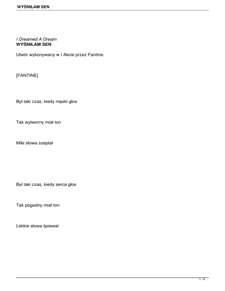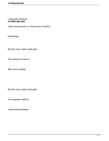 WYŚNIŁAM SEN I Dreamed A Dream WYŚNIŁAM SEN Utwór wykonywany w I Akcie przez Fantine. [FANTINE] Był taki czas, kiedy męski głos Tak wytworny miał ton Miłe słowa szeptał Był taki czas, kiedy serca głos Tak pogodny miał ton Lekkie słowa śpiewał 1/4 WYŚNIŁAM SEN Był taki czas, lecz ten sen już zgasł... Wyśniłam sen, pogodny sen Był czas nadziei, czas miłości Lecz miłość we śnie wieczna jest I Bóg wybacza nam słabości Za młodych lat nie bałam się Że sny radosne się rozpłyną Bo ceny jeszcze nie znał nikt Śpiewano pieśni, lano wino 2/4 WYŚNIŁAM SEN Ale wilki szczerzą kły W oczach mają błyskawice Beznadzieja drzemie w nich Rozrywają dobry sen On całe lato ze mną śnił Wypełniał noc cudownym drżeniem Dzieciństwo słodkie z ust mych spił A na jesieni nagle znikł I wraca sen – znów ze mną jest 3/4 WYŚNIŁAM SEN Razem spędzamy długie lata Lecz to trucizna jest nie sen A burza każdą tęczę zmiata Ja los wyśniłam, który jest Tak inny niż to piekło wkoło Tak inny niż ten nędzny świat Życie zdeptało Dobry sen 4/4