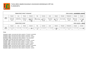 Terminy odbioru odpadów komunalnych z nieruchomości wielolokalowych w 2017 roku PL.OFIAR GETTA Odbiór odpadów: poniedziałek, czwartek Odpady frakcji 'mokrej' i 'zmieszanej' Data odbioru Styczeń Luty Marzec Kwiecień Maj Czerwiec Lipiec Sierpień Wrzesień Październik Listopad Grudzień 2, 5, 9, 12, 16, 19, 23, 26, 30 2, 6, 9, 13, 16, 20, 23, 27 2, 6, 9, 13, 16, 20, 23, 27, 30 3, 6, 10, 13, 5, 8, 11, 15, 18, 22, 25, 29 1, 5, 8, 12, 3, 6, 10, 13, 17, 20, 24, 27, 31 3, 7, 10, 14, 4, 7, 11, 14, 18, 21, 25, 28 2, 5, 9, 12, 16, 19, 23, 26, 30 3, 6, 9, 13, 4, 7, 11, 14, 16, 19, 22, 16, 20, 23, 27, 30 29 18, 21, 24, 27, 29 26, 29 18, 21, 24, 28, 31 Odbiór odpadów: wtorek Odpady frakcji 'suchej' Data odbioru 18, 21, 23, Styczeń Luty Marzec Kwiecień Maj Czerwiec 3, 10, 17, 24, 31 7, 14, 21, 28 7, 14, 21, 28 4, 11, 19, 25 2, 9, 16, 23, 30 6, 13, 20, 27 Uwaga: 18 kwiecień - wtorek - przesunięty dzień odbioru odpadów z 17 kwiecień - poniedziałek 19 kwiecień - środa - przesunięty dzień odbioru odpadów z 18 kwiecień - wtorek 21 kwiecień - piątek - przesunięty dzień odbioru odpadów z 20 kwiecień - czwartek 29 kwiecień - sobota - przesunięty dzień odbioru odpadów z 1 maj - poniedziałek 5 maj - piątek - przesunięty dzień odbioru odpadów z 4 maj - czwartek 16 czerwiec - piątek - przesunięty dzień odbioru odpadów z 15 czerwiec - czwartek 16 sierpień - środa - przesunięty dzień odbioru odpadów z 15 sierpień - wtorek 18 sierpień - piątek - przesunięty dzień odbioru odpadów z 17 sierpień - czwartek 3 listopad - piątek - przesunięty dzień odbioru odpadów z 2 listopad - czwartek 23 grudzień - sobota - przesunięty dzień odbioru odpadów z 25 grudzień - poniedziałek 27 grudzień - środa - przesunięty dzień odbioru odpadów z 26 grudzień - wtorek 29 grudzień - piątek - przesunięty dzień odbioru odpadów z 28 grudzień - czwartek Lipiec 4, 11, 18, 25 Sierpień Wrzesień Październik Listopad Grudzień 1, 8, 16, 22, 29 5, 12, 19, 26 3, 10, 17, 24, 31 7, 14, 21, 28 5, 12, 19, 27