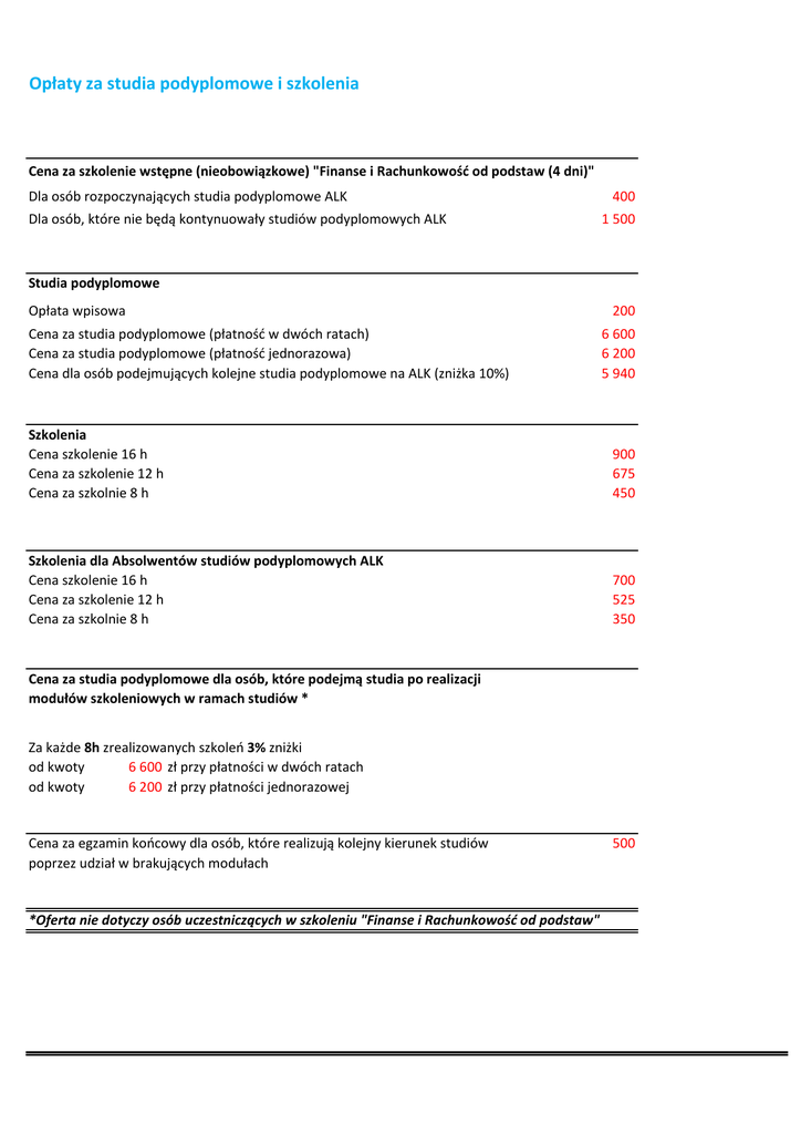 Opłaty za studia podyplomowe i szkolenia Cena za szkolenie wstępne (nieobowiązkowe) "Finanse i Rachunkowość od podstaw (4 dni)" Dla osób rozpoczynających studia podyplomowe ALK Dla osób, które nie będą kontynuowały studiów podyplomowych ALK 400 1 500 Studia podyplomowe Opłata wpisowa Cena za studia podyplomowe (płatność w dwóch ratach) Cena za studia podyplomowe (płatność jednorazowa) Cena dla osób podejmujących kolejne studia podyplomowe na ALK (zniżka 10%) 200 6 600 6 200 5 940 Szkolenia Cena szkolenie 16 h Cena za szkolenie 12 h Cena za szkolnie 8 h 900 675 450 Szkolenia dla Absolwentów studiów podyplomowych ALK Cena szkolenie 16 h Cena za szkolenie 12 h Cena za szkolnie 8 h 700 525 350 Cena za studia podyplomowe dla osób, które podejmą studia po realizacji modułów szkoleniowych w ramach studiów * Za każde 8h zrealizowanych szkoleń 3% zniżki od kwoty 6 600 zł przy płatności w dwóch ratach od kwoty 6 200 zł przy płatności jednorazowej Cena za egzamin końcowy dla osób, które realizują kolejny kierunek studiów poprzez udział w brakujących modułach *Oferta nie dotyczy osób uczestniczących w szkoleniu "Finanse i Rachunkowość od podstaw" 500 Przykładowe schematy opłat dla osób rozpoczynających kolejne studia w zintegrowanym systemie nauczania Absolwent Podyplomowych Studiów dla Kontrolerów Finansowych (KF) rozpatruje możliwość realizacji w zintegrowanym systemie nauczania Podyplomowych Studiów Zarządzania Finansami Przedsiębiorstw (ZFP) Liczba ośmiogodzinnych bloków zajęciowych realizowanych na studiach ZFP i jednocześnie nieobjętych programem KF Cena za szkolenie 8h dla Absolwentów studiów podyplomowych ALK Płatność za szkolenia Opłata za egzamin końcowy Cena całkowita realizacji kierunku ZFP dla Absolwentów KF 7 350 2 450 500 2 950 Absolwent Podyplomowych Studiów Zarządzania Finansami Przedsiębiorstw rozpatruje możliwość realizacji w zintegrowanym systemie nauczania Podyplomowych Analityk Finansowy Rynków i Papierów wartościowych (AFRiPW) Liczba ośmiogodzinnych bloków zajęciowych realizowanych na studiach AFRiPW i jednocześnie nieobjętych programem ZFP Cena za szkolenie 8h dla Absolwentów studiów podyplomowych ALK Płatność za szkolenia Opłata za egzamin końcowy Cena całkowita realizacji kierunku AFRiPW dla Absolwentów ZFP 10 350 3 500 500 4 000