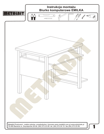 METALBIT Instrukcja monta¿u Biurko komputerowe EMILKA Metalbit Producent - meble szkolne, przedszkolne i biurowe www.metalbit.com.pl www.szkolniak.pl 78-460 Barwice ul. Zwyciêzców 26 tel. (94) 373 23 95 tel. (94) 372 24 10 fax (94) 373 23 95 1 Instrukcja monta¿u Biurko komputerowe EMILKA METALBIT 1 2 13 3 4 4 5 6 11 7 9 10 8 12 Nr A B C D E F G H I K L Il.szt Wkrêt 4x16 16 Wkrêt 4x30 4 Œruba WKI M8x60 4 Œruba M6x35 2 Nakrêtka M6 2 Klucz imbus Zacisk mimoœrodu Ko³ek mimoœrodu Zaœlepka mimoœrodu Eurowkrêt 6,5x9 Wkrêt 3x13 1 12 12 12 6 1 - bok obudowy klawiatury lewy - 402 x 95 2 - bok obudowy klawiatury prawy - 402 x 95 3 - ty³ obudowy klawiatury - 554 x 95 4 - blenda boczna x 2 - 450 x 548 5 - blenda tylna - 450 x 612 - 700 x 650 6 - blat 7 - pó³ka klawiatury - 529 x 350 8 - pó³ka boczna - 602 x 227 9 - noga tylna 10 - noga przednia 11 - ³¹czyna x 2 12 - wspornik pó³ki 13 - prowadnik klawiatury - 350 6 Metalbit Producent - meble szkolne, przedszkolne i biurowe www.metalbit.com.pl www.szkolniak.pl 78-460 Barwice ul. Zwyciêzców 26 tel. (94) 373 23 95 tel. (94) 372 24 10 fax (94) 373 23 95 2 Instrukcja monta¿u Biurko komputerowe EMILKA METALBIT H 2 1 K H Titus 1 UWAGA! Strza³kê na zacisku skierowaæ w stronê ko³ka mimoœrodu C L A Metalbit Producent - meble szkolne, przedszkolne i biurowe www.metalbit.com.pl www.szkolniak.pl 78-460 Barwice ul. Zwyciêzców 26 tel. (94) 373 23 95 tel. (94) 372 24 10 fax (94) 373 23 95 3 METALBIT Instrukcja monta¿u Biurko komputerowe EMILKA B DE A Po zakoñczonym monta¿u za³o¿yæ pó³kê klawiatury na prowadnice Wiêcej instrukcji i filmy monta¿owe dostêpne na stronie www. metalbit.com.pl/instrukcje_montazu Metalbit Producent - meble szkolne, przedszkolne i biurowe www.metalbit.com.pl www.szkolniak.pl 78-460 Barwice ul. Zwyciêzców 26 tel. (94) 373 23 95 tel. (94) 372 24 10 fax (94) 373 23 95 4