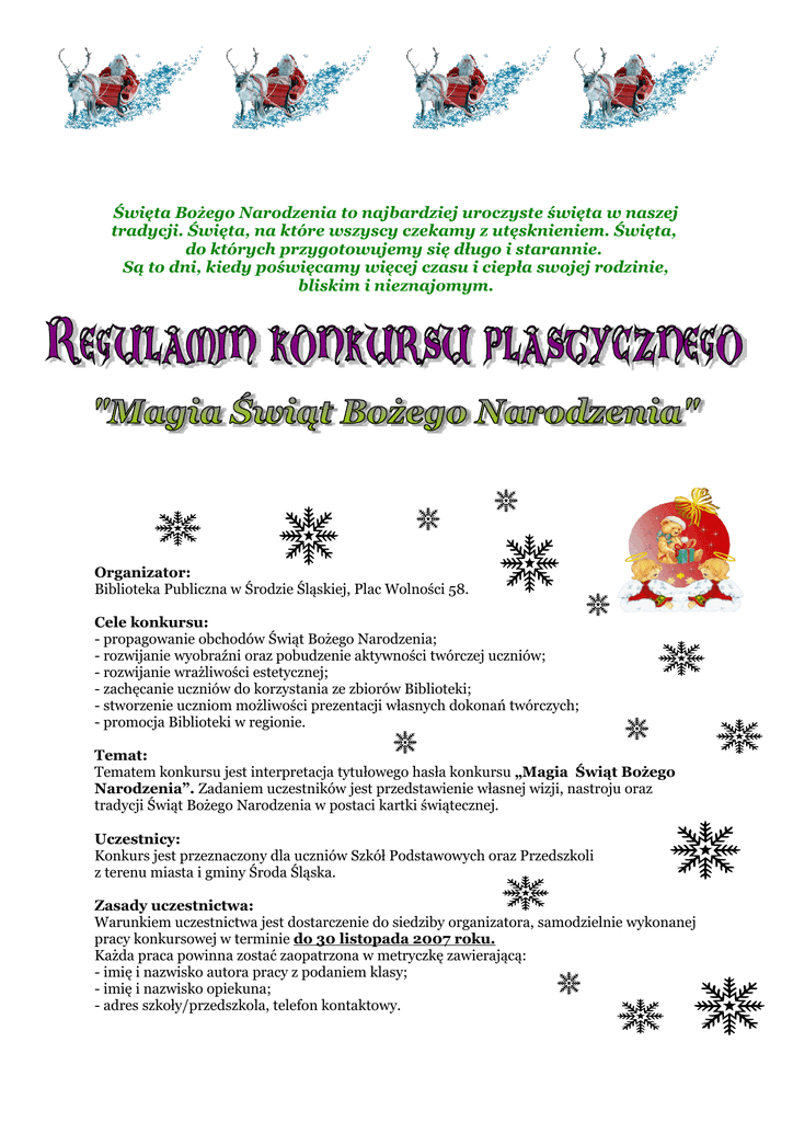 Święta Bożego Narodzenia to najbardziej uroczyste święta w naszej tradycji. Święta, na które wszyscy czekamy z utęsknieniem. Święta, do których przygotowujemy się długo i starannie. Są to dni, kiedy poświęcamy więcej czasu i ciepła swojej rodzinie, bliskim i nieznajomym. Organizator: Biblioteka Publiczna w Środzie Śląskiej, Plac Wolności 58. Cele konkursu: - propagowanie obchodów Świąt Bożego Narodzenia; - rozwijanie wyobraźni oraz pobudzenie aktywności twórczej uczniów; - rozwijanie wrażliwości estetycznej; - zachęcanie uczniów do korzystania ze zbiorów Biblioteki; - stworzenie uczniom możliwości prezentacji własnych dokonań twórczych; - promocja Biblioteki w regionie. Temat: Tematem konkursu jest interpretacja tytułowego hasła konkursu „Magia Świąt Bożego Narodzenia”. Zadaniem uczestników jest przedstawienie własnej wizji, nastroju oraz tradycji Świąt Bożego Narodzenia w postaci kartki świątecznej. Uczestnicy: Konkurs jest przeznaczony dla uczniów Szkół Podstawowych oraz Przedszkoli z terenu miasta i gminy Środa Śląska. Zasady uczestnictwa: Warunkiem uczestnictwa jest dostarczenie do siedziby organizatora, samodzielnie wykonanej pracy konkursowej w terminie do 30 listopada 2007 roku. Każda praca powinna zostać zaopatrzona w metryczkę zawierającą: - imię i nazwisko autora pracy z podaniem klasy; - imię i nazwisko opiekuna; - adres szkoły/przedszkola, telefon kontaktowy. Technika i wielkość kartki świątecznej: Forma: technika dowolna (farby, kredki, techniki mieszane, tempera, kolorowe tusze, collage i in.); Format: kartka świąteczna o dowolnym i kształcie. Kryteria oceny prac: Komisja oceni prace według następujących kryteriów: - zgodność z tematem; - pomysłowość i oryginalność formy; - estetyka wykonania; - ocena w trzech kategoriach wiekowych: * od 4 do 6 lat; * od 7 do 9 lat; * od 10 do 12/13 lat. Oceny prac dokona komisja konkursowa powołana przez organizatora. Prawa autorskie: Prace przechodzą na własność Biblioteki Publicznej w Środzie Śląskiej nie będą odsyłane. Poprzez zgłoszenie pracy na konkurs, autorzy prac bezpłatnie przenoszą na organizatora prawa autorskie, art. 50 ustawy z dnia 4 lutego 1994 r. (Dz. U. 1994 nr 24 poz. 83) oraz jednocześnie akceptują warunki regulaminu konkursu, wyrażają zgodę na bezpłatne eksponowanie, publikowanie, powielanie nadesłanych prac. Rozstrzygnięcie konkursu: Szkoły oraz przedszkola, których reprezentanci zostaną nagrodzeni zostaną poinformowane telefonicznie o wynikach konkursu. Wręczenie nagród i wyróżnień nastąpi 6 grudnia 2007 roku w Dziale Dziecięcym Biblioteki Publicznej w Środzie Śląskiej. Laureaci zostaną powiadomieni pisemnie za pośrednictwem instytucji zgłaszającej: szkoły, przedszkola lub na adres domowy w przypadku zgłoszeń indywidualnych. Informacje o wynikach konkursu zamieszczone zostaną na stronie internetowej www.srodaslaska.pl/biblioteka oraz na łamach „Expresu Średzkiego” i w „Rolandzie”. Najciekawsze prace zostaną wyeksponowane na świątecznej wystawie pokonkursowej, w bibliotece. Uwagi końcowe: Nadesłanie pracy jest równoznaczne z akceptacją warunków regulaminu. Organizatorzy konkursu zastrzegają sobie prawo do wprowadzenia zmian w regulaminie wynikających z powodów organizacyjnych od nich niezależnych. Dodatkowych informacji o konkursie udziela Pani Karolina Załęska – Dział Dziecięcy Biblioteki Publicznej w Środzie Śląskiej: W poniedziałki, wtorki, czwartki, piątki w godz. 11.00 – 18.00, w środy w godz. 8.00 – 12.00. Kontakt: tel.071/317 22 28.
