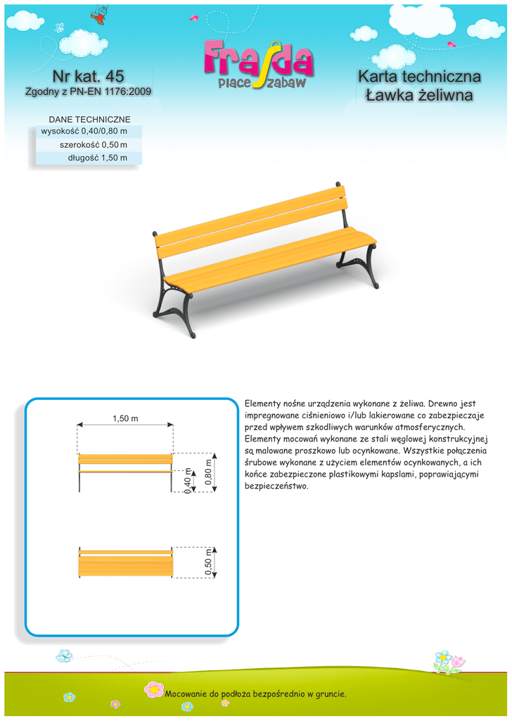 Karta techniczna Ławka żeliwna Nr kat. 45 Zgodny z PN-EN 1176:2009 DANE TECHNICZNE wysokość 0,40/0,80 m szerokość 0,50 m długość 1,50 m 0,80 m 0,50 m 0,40 m 1,50 m Elementy nośne urządzenia wykonane z żeliwa. Drewno jest impregnowane ciśnieniowo i/lub lakierowane co zabezpieczaje przed wpływem szkodliwych warunków atmosferycznych. Elementy mocowań wykonane ze stali węglowej konstrukcyjnej są malowane proszkowo lub ocynkowane. Wszystkie połączenia śrubowe wykonane z użyciem elementów ocynkowanych, a ich końce zabezpieczone plastikowymi kapslami, poprawiającymi bezpieczeństwo. Mocowanie do podłoża bezpośrednio w gruncie.