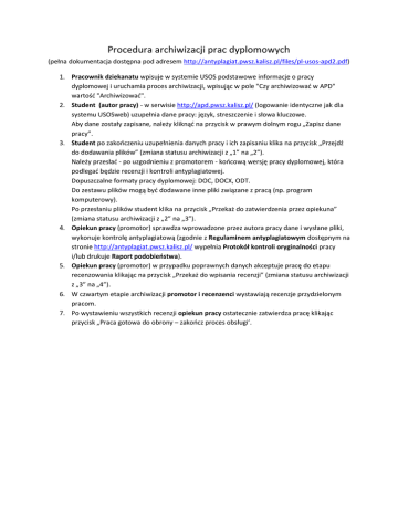 Procedura archiwizacji prac dyplomowych (pełna dokumentacja dostępna pod adresem http://antyplagiat.pwsz.kalisz.pl/files/pl-usos-apd2.pdf) 1. Pracownik dziekanatu wpisuje w systemie USOS podstawowe informacje o pracy dyplomowej i uruchamia proces archiwizacji, wpisując w pole "Czy archiwizować w APD" wartość "Archiwizować". 2. Student (autor pracy) - w serwisie http://apd.pwsz.kalisz.pl/ (logowanie identyczne jak dla systemu USOSweb) uzupełnia dane pracy: język, streszczenie i słowa kluczowe. Aby dane zostały zapisane, należy kliknąć na przycisk w prawym dolnym rogu „Zapisz dane pracy”. 3. Student po zakończeniu uzupełnienia danych pracy i ich zapisaniu klika na przycisk „Przejdź do dodawania plików” (zmiana statusu archiwizacji z „1” na „2”). Należy przesłać - po uzgodnieniu z promotorem - końcową wersję pracy dyplomowej, która podlegać będzie recenzji i kontroli antyplagiatowej. Dopuszczalne formaty pracy dyplomowej: DOC, DOCX, ODT. Do zestawu plików mogą być dodawane inne pliki związane z pracą (np. program komputerowy). Po przesłaniu plików student klika na przycisk „Przekaż do zatwierdzenia przez opiekuna” (zmiana statusu archiwizacji z „2” na „3”). 4. Opiekun pracy (promotor) sprawdza wprowadzone przez autora pracy dane i wysłane pliki, wykonuje kontrolę antyplagiatową (zgodnie z Regulaminem antyplagiatowym dostępnym na stronie http://antyplagiat.pwsz.kalisz.pl/ wypełnia Protokół kontroli oryginalności pracy i/lub drukuje Raport podobieństwa). 5. Opiekun pracy (promotor) w przypadku poprawnych danych akceptuje pracę do etapu recenzowania klikając na przycisk „Przekaż do wpisania recenzji” (zmiana statusu archiwizacji z „3” na „4”). 6. W czwartym etapie archiwizacji promotor i recenzenci wystawiają recenzje przydzielonym pracom. 7. Po wystawieniu wszystkich recenzji opiekun pracy ostatecznie zatwierdza pracę klikając przycisk „Praca gotowa do obrony – zakończ proces obsługi’. Podstawy prawne Art. 167a. 1. Warunkiem przystąpienia do egzaminu dyplomowego jest pozytywna ocena pracy dyplomowej. 2. Praca dyplomowa jest samodzielnym opracowaniem określonego zagadnienia naukowego lub artystycznego lub dokonaniem artystycznym prezentującym ogólną wiedzę i umiejętności studenta związane z danym kierunkiem studiów, poziomem i profilem kształcenia oraz umiejętności samodzielnego analizowania i wnioskowania. 3. Pracę dyplomową może stanowić w szczególności praca pisemna, opublikowany artykuł, praca projektowa, w tym projekt i wykonanie programu lub systemu komputerowego, oraz praca konstrukcyjna, technologiczna lub artystyczna. 4. Uczelnia jest obowiązana do sprawdzania pisemnych prac dyplomowych przed egzaminem dyplomowym z wykorzystaniem programów antyplagiatowych współpracujących z ogólnopolskim repozytorium pisemnych prac dyplomowych. Art. 167b. 1. Minister właściwy do spraw szkolnictwa wyższego prowadzi ogólnopolskie repozytorium pisemnych prac dyplomowych. 2. W repozytorium zamieszcza się: 1) tytuł pracy dyplomowej; 2) imiona i nazwisko autora pracy dyplomowej; 3) imiona i nazwisko promotora pracy dyplomowej; 4) imiona i nazwiska recenzentów pracy dyplomowej; 5) nazwę podstawowej jednostki organizacyjnej; 6) nazwę uczelni; 7) datę zdania egzaminu dyplomowego; 8) nazwę kierunku studiów; 9) treść pracy dyplomowej. 3. W repozytorium nie zamieszcza się prac zawierających informacje podlegające ochronie na podstawie przepisów o ochronie informacji niejawnych. 4. Dane, o których mowa w ust. 2, wprowadzają do Systemu POL-on rektorzy uczelni. Dostęp do danych przysługuje promotorowi pracy dyplomowej oraz Komisji. 5. Rektor uczelni jest obowiązany do wprowadzenia pracy dyplomowej do repozytorium niezwłocznie po zdaniu egzaminu dyplomowego.