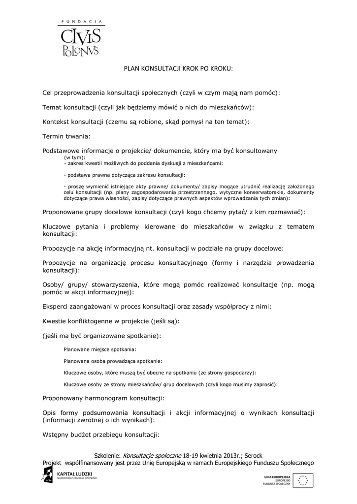 PLAN KONSULTACJI KROK PO KROKU: Cel przeprowadzenia konsultacji społecznych (czyli w czym mają nam pomóc): Temat konsultacji (czyli jak będziemy mówić o nich do mieszkańców): Kontekst konsultacji (czemu są robione, skąd pomysł na ten temat): Termin trwania: Podstawowe informacje o projekcie/ dokumencie, który ma być konsultowany (w tym): - zakres kwestii możliwych do poddania dyskusji z mieszkańcami: - podstawa prawna dotycząca zakresu konsultacji: - proszę wymienić istniejące akty prawne/ dokumenty/ zapisy mogące utrudnić realizację założonego celu konsultacji (np. plany zagospodarowania przestrzennego, wytyczne konserwatorskie, dokumenty dotyczące prawa własności, zapisy dotyczące prawnych aspektów wprowadzania tych zmian): Proponowane grupy docelowe konsultacji (czyli kogo chcemy pytać/ z kim rozmawiać): Kluczowe pytania i problemy kierowane do mieszkańców w związku z tematem konsultacji: Propozycje na akcję informacyjną nt. konsultacji w podziale na grupy docelowe: Propozycje na organizację procesu konsultacyjnego (formy i narzędzia prowadzenia konsultacji): Osoby/ grupy/ stowarzyszenia, które mogą pomóc realizować konsultacje (np. mogą pomóc w akcji informacyjnej): Eksperci zaangażowani w proces konsultacji oraz zasady współpracy z nimi: Kwestie konfliktogenne w projekcie (jeśli są): (jeśli ma być organizowane spotkanie): Planowane miejsce spotkania: Planowana osoba prowadząca spotkanie: Kluczowe osoby, które muszą być obecne na spotkaniu (ze strony gospodarzy): Kluczowe osoby ze strony mieszkańców/ grup docelowych (czyli kogo musimy zaprosić): Proponowany harmonogram konsultacji: Opis formy podsumowania konsultacji i akcji informacyjnej o wynikach konsultacji (informacji zwrotnej o ich wynikach): Wstępny budżet przebiegu konsultacji: Szkolenie: Konsultacje społeczne 18-19 kwietnia 2013r.; Serock Projekt współfinansowany jest przez Unię Europejską w ramach Europejskiego Funduszu Społecznego