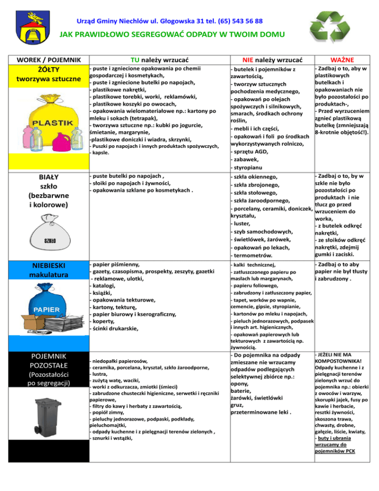 Urząd Gminy Niechlów ul. Głogowska 31 tel. (65) 543 56 88 JAK PRAWIDŁOWO SEGREGOWAĆ ODPADY W TWOIM DOMU WOREK / POJEMNIK ŻÓŁTY tworzywa sztuczne TU należy wrzucać - puste i zgniecione opakowania po chemii gospodarczej i kosmetykach, - puste i zgniecione butelki po napojach, - plastikowe nakrętki, - plastikowe torebki, worki, reklamówki, - plastikowe koszyki po owocach, - opakowania wielomateriałowe np.: kartony po mleku i sokach (tetrapak), - tworzywa sztuczne np.: kubki po jogurcie, śmietanie, margarynie, -plastikowe doniczki i wiadra, skrzynki, - Puszki po napojach i innych produktach spożywczych, - kapsle. NIE należy wrzucać WAŻNE - butelek i pojemników z zawartością, - tworzyw sztucznych pochodzenia medycznego, - opakowań po olejach spożywczych i silnikowych, smarach, środkach ochrony roślin, - mebli i ich części, - opakowań i foli po środkach wykorzystywanych rolniczo, - sprzętu AGD, - zabawek, - styropianu - Zadbaj o to, aby w plastikowych butelkach i opakowaniach nie było pozostałości po produktach-, - Przed wyrzuceniem zgnieć plastikową butelkę (zmniejszają 8-krotnie objętość!). - Zadbaj o to, by w szkle nie było pozostałości po produktach i nie tłucz go przed wrzuceniem do worka, - z butelek odkręć nakrętki, - ze słoików odkręć nakrętki, zdejmij gumki i zaciski. BIAŁY szkło (bezbarwne i kolorowe) - puste butelki po napojach , - słoiki po napojach i żywności, - opakowania szklane po kosmetykach . - szkła okiennego, - szkła zbrojonego, - szkła stołowego, - szkła żaroodpornego, - porcelany, ceramiki, doniczek, kryształu, - luster, - szyb samochodowych, - świetlówek, żarówek, - opakowań po lekach, - termometrów. NIEBIESKI makulatura - papier piśmienny, - gazety, czasopisma, prospekty, zeszyty, gazetki - reklamowe, ulotki, - katalogi, - książki, - opakowania tekturowe, - kartony, tekturę, - papier biurowy i kserograficzny, - koperty, - ścinki drukarskie, - Zadbaj o to aby - kalki technicznej, papier nie był tłusty - zatłuszczonego papieru po masłach lub margarynach, i zabrudzony . - papieru foliowego, - zabrudzony i zatłuszczony papier, - tapet, worków po wapnie, cemencie, gipsie, styropianie, - kartonów po mleku i napojach, - pieluch jednorazowych, podpasek i innych art. higienicznych, - opakowań papierowych lub tekturowych z zawartością np. żywnością. - JEŻELI NIE MA - Do pojemnika na odpady KOMPOSTOWNIKA! zmieszane nie wrzucamy Odpady kuchenne i z odpadów podlegających pielęgnacji terenów selektywnej zbiórce np.: zielonych wrzuć do opony, pojemnika np.: obierki baterie, z owoców i warzyw, żarówki, świetlówki skorupki jajek, fusy po gruz, kawie i herbacie, przeterminowane leki . resztki żywności, skoszona trawa, chwasty, drobne, gałęzie, liście, kwiaty, - buty i ubrania wrzucamy do pojemników PCK POJEMNIK POZOSTAŁE (Pozostałości po segregacji) - niedopałki papierosów, - ceramika, porcelana, kryształ, szkło żaroodporne, - lustra, - zużytą watę, waciki, - worki z odkurzacza, zmiotki (śmieci) - zabrudzone chusteczki higieniczne, serwetki i ręczniki papierowe, - filtry do kawy i herbaty z zawartością, - popiół zimny, - pieluchy jednorazowe, podpaski, podkłady, pieluchomajtki, - odpady kuchenne i z pielęgnacji terenów zielonych , - sznurki i wstążki, Urząd Gminy Niechlów ul. Głogowska 31 tel. (65) 543 56 88 POZOSTAŁE ODPADY ZBIERANE SELEKTYWNIE Pozostałe odpady: Np.: Gdzie oddać: Meble i odpady wielkogabarytowe - meble Chemikalia Zużyte baterie Zużyty sprzęt elektryczny i elektroniczny Leki Opony - zbierane będą w systemie akcyjnym w - dywany terminie podanym przez gminę, - duże opakowania, w tym opakowania - Punkty Selektywnego Zbierania, ze styropianu itp. których adresy będą na bieżąco - okna podawane do publicznej wiadomości mieszkańcom. - resztki farb, lakierów, - zbierane będą w systemie akcyjnym w rozpuszczalników, środki ochrony terminie podanym przez gminę, roślin i nawozów, pojemniki po - Punkty Selektywnego Zbierania, aerozolach, olejach mineralnych i których adresy będą na bieżąco syntetycznych, tłuszczach, benzynie, podawane do publicznej wiadomości środkach chemicznych, stare mieszkańcom. kosmetyki. - Baterie - Urząd Gminy Niechlów - Punkt Selektywnego Zbierania - sklepy RTV i AGD, - szkoły i placówki oświatowe, - instytucje i palcówki handlowe. - RTV i AGD - tusze do drukarek - żarówki, świetlówki - Sklepy RTV i AGD, - zbierane będą w systemie akcyjnym w terminie podanym przez gminę, - Punkty Selektywnego Zbierania, których adresy będą na bieżąco podawane do publicznej wiadomości mieszkańcom. - przeterminowane leki - niewykorzystane leki - Urząd Gminy Niechlów, - apteki - opony Punkty Selektywnego Zbierania, których adresy będą na bieżąco podawane do publicznej wiadomości mieszkańcom. Budowlanych i rozbiórkowych - gruz - cegły - dachówka - tynki - tapety - deski - Na indywidualne zgłoszenia mieszkańców podstawiony zostanie kontener (odpłatnie).