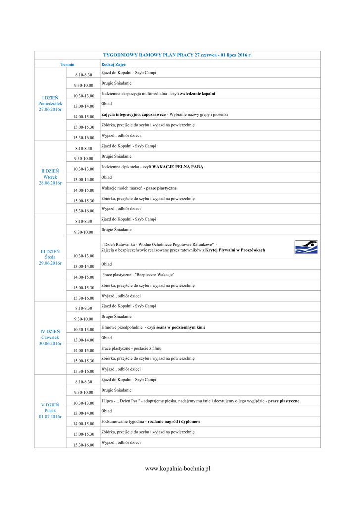 TYGODNIOWY RAMOWY PLAN PRACY 27 czerwca - 01 lipca 2016 r. Rodzaj Zajęć Termin 8.10-8.30 9.30-10.00 I DZIEŃ Poniedziałek 27.06.2016r 10.30-13.00 13.00-14.00 14.00-15.00 15.00-15.30 15.30-16.00 8.10-8.30 9.30-10.00 II DZIEŃ Wtorek 28.06.2016r 10.30-13.00 13.00-14.00 14.00-15.00 15.00-15.30 15.30-16.00 8.10-8.30 9.30-10.00 III DZIEŃ Środa 29.06.2016r Podziemna ekspozycja multimedialna - czyli zwiedzanie kopalni Obiad Zajęcia integracyjno, zapoznawcze - Wybranie nazwy grupy i piosenki Zbiórka, przejście do szybu i wyjazd na powierzchnię Wyjazd , odbiór dzieci Zjazd do Kopalni - Szyb Campi Drugie Śniadanie Podziemna dyskoteka - czyli WAKACJE PEŁNĄ PARĄ Obiad Wakacje moich marzeń - prace plastyczne Zbiórka, przejście do szybu i wyjazd na powierzchnię Wyjazd , odbiór dzieci Zjazd do Kopalni - Szyb Campi Drugie Śniadanie 10.30-13.00 13.00-14.00 15.00-15.30 15.30-16.00 8.10-8.30 9.30-10.00 10.30-13.00 13.00-14.00 14.00-15.00 15.00-15.30 15.30-16.00 8.10-8.30 9.30-10.00 V DZIEŃ Piątek 01.07.2016r Drugie Śniadanie ,, Dzień Ratownika - Wodne Ochotnicze Pogotowie Ratunkowe" Zajęcia o bezpieczeństwie realizowane przez ratowników z Krytej Pływalni w Proszówkach 14.00-15.00 IV DZIEŃ Czwartek 30.06.2016r Zjazd do Kopalni - Szyb Campi 10.30-13.00 13.00-14.00 14.00-15.00 15.00-15.30 15.30-16.00 Obiad Prace plastyczne - "Bezpieczne Wakacje" Zbiórka, przejście do szybu i wyjazd na powierzchnię Wyjazd , odbiór dzieci Zjazd do Kopalni - Szyb Campi Drugie Śniadanie Filmowe przedpołudnie - czyli seans w podziemnym kinie Obiad Prace plastyczne - postacie z filmu Zbiórka, przejście do szybu i wyjazd na powierzchnię Wyjazd , odbiór dzieci Zjazd do Kopalni - Szyb Campi Drugie Śniadanie 1 lipca - ,, Dzień Psa " - adoptujemy pieska, nadajemy mu imie i decytujemy o jego wyglądzie - prace plastyczne Obiad Podsumowanie tygodnia - rozdanie nagród i dyplomów Zbiórka, przejście do szybu i wyjazd na powierzchnię Wyjazd , odbiór dzieci www.kopalnia-bochnia.pl TYGODNIOWY RAMOWY PLAN PRACY 04 lipiec - 08 lipca 2016 r. Rodzaj Zajęć Termin 8.10-8.30 9.30-10.00 I DZIEŃ Poniedziałek 04.07.2016r 10.30-13.00 13.00-14.00 14.00-15.00 15.00-15.30 15.30-16.00 II DZIEŃ Wtorek 05.07.2016r Obiad W zdrowym ciele zdrowy duch - zabawy ruchowe i ćwiczenia gimnastyczne Zbiórka, przejście do szybu i wyjazd na powierzchnię Wyjazd, odbiór dzieci 9.30-10.00 Drugie Śniadanie 10.00-13.00 Olimpiada sportowa 13.00-14.00 15.30-16.00 8.10-8.30 9.30-10.00 10.30-13.00 13.00-14.00 14.00-15.00 15.00-15.30 15.30-16.00 8.10-8.30 9.30-10.00 10.30-13.00 13.00-14.00 14.00-15.00 15.00-15.30 15.30-16.00 8.10-8.30 9.30-10.00 V DZIEŃ Piątek 08.07.2016r Podziemna Ekspozycja Multimedialna – czyli zwiedzanie kopalni Zjazd do Kopalni - Szyb Campi 15.00-15.30 IV DZIEŃ Czwartek 07.07.2016r Drugie Śniadanie 8.10-8.30 14.00-15.00 III DZIEŃ Środa 06.07.2016r Zjazd do Kopalni - Szyb Campi 10.30-13.00 13.00-14.00 14.00-15.00 15.00-15.30 15.30-16.00 Obiad Pływamy pomiędzy solnymi górami – czyli Podziemna Przeprawa Łodzią Zbiórka, przejście do szybu i wyjazd na powierzchnię Wyjazd , odbiór dzieci Zjazd do Kopalni - Szyb Campi Drugie Śniadanie Filmowe przedpołudnie – czyli seans w podziemnym kinie Obiad Zajęcia ruchowe Zbiórka, przejście do szybu i wyjazd na powierzchnię Wyjazd , odbiór dzieci Zjazd do Kopalni - Szyb Campi Drugie Śniadanie Podziemna Dyskoteka Obiad Swobodna zabawa wg zainteresowań dzieci (plac zabaw) Zbiórka, przejście do szybu i wyjazd na powierzchnię Wyjazd , odbiór dzieci Zjazd do Kopalni - Szyb Campi Drugie Śniadanie Tworzymy wielki ocean - prace plastyczne Obiad Podsumowanie tygodnia - rozdanie nagród i dyplomów Zbiórka, przejście do szybu i wyjazd na powierzchnię Wyjazd , odbiór dzieci www.kopalnia-bochnia.pl TYGODNIOWY RAMOWY PLAN PRACY 11 lipiec - 15 lipca 2016 r. Rodzaj Zajęć Termin 8.10-8.30 9.30-10.00 I DZIEŃ Poniedziałek 11.07.2016r 10.30-13.00 13.00-14.00 14.00-15.00 15.00-15.30 15.30-16.00 II DZIEŃ Wtorek 12.07.2016r Obiad Burza mózgów - czyli wakacyjne rady Zbiórka, przejście do szybu i wyjazd na powierzchnię Wyjazd , odbiór dzieci 9.30-10.00 Drugie Śniadanie 10.00-13.00 Opowiedz mi bajkę - tworzymy własną historyjkę 13.00-14.00 15.30-16.00 8.10-8.30 9.30-10.00 10.30-13.00 13.00-14.00 14.00-15.00 15.00-15.30 15.30-16.00 8.10-8.30 9.30-10.00 10.30-13.00 13.00-14.00 14.00-15.00 15.00-15.30 15.30-16.00 8.10-8.30 9.30-10.00 V DZIEŃ Piątek 15.07.2016r Podziemna ekspozycja multimedialna - czyli zwiedzanie kopalni Zjazd do Kopalni - Szyb Campi 15.00-15.30 IV DZIEŃ Czwartek 14.07.2016r Drugie Śniadanie 8.10-8.30 14.00-15.00 III DZIEŃ Środa 13.07.2016r Zjazd do Kopalni - Szyb Campi 10.30-13.00 13.00-14.00 14.00-15.00 15.00-15.30 15.30-16.00 Obiad Podziemna przeprawa łodzią Zbiórka, przejście do szybu i wyjazd na powierzchnię Wyjazd , odbiór dzieci Zjazd do Kopalni - Szyb Campi Drugie Śniadanie Podziemna dyskoteka Obiad Zajęcia plastyczne Zbiórka, przejście do szybu i wyjazd na powierzchnię Wyjazd , odbiór dzieci Zjazd do Kopalni - Szyb Campi Drugie Śniadanie Filmowe przedpołudnie – czyli seans w podziemnym kinie Obiad Zajęcia twórcze Zbiórka, przejście do szybu i wyjazd na powierzchnię Wyjazd , odbiór dzieci Zjazd do Kopalni - Szyb Campi Drugie Śniadanie Zajęcia manualne - „Śmieszny Balon” Obiad Podsumowanie tygodnia - rozdanie nagród i dyplomów Zbiórka, przejście do szybu i wyjazd na powierzchnię Wyjazd , odbiór dzieci www.kopalnia-bochnia.pl TYGODNIOWY RAMOWY PLAN PRACY 18 lipca - 22 lipca 2016 r. Rodzaj Zajęć Termin 8.10-8.30 9.30-10.00 I DZIEŃ Poniedziałek 18.07.2016r 10.30-13.00 13.00-14.00 14.00-15.00 15.00-15.30 15.30-16.00 II DZIEŃ Wtorek 19.07.2016r Drugie Śniadanie Podziemna ekspozycja multimedialna - czyli zwiedzanie kopalni Obiad Zajęcia integracyjne - Wybranie nazwy grupy i piosenki Zbiórka, przejście do szybu i wyjazd na powierzchnię Wyjazd , odbiór dzieci 8.10-8.30 Zjazd do K