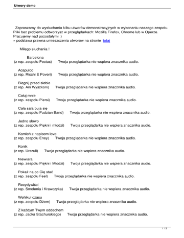 Utwory demo Zapraszamy do wysłuchania kilku utworów demonstracyjnych w wykonaniu naszego zespołu. Pliki bez problemu odtworzysz w przeglądarkach: Mozilla Firefox, Chrome lub w Operze. Pracujemy nad pozostałymi :) » podstawa prawna umieszczenia utworów na stronie tutaj Miłego słuchania ! Barcelona (z rep. zespołu Pectus) Twoja przeglądarka nie wspiera znacznika audio. Acapulco (z rep. Ricchi E Poveri) Twoja przeglądarka nie wspiera znacznika audio. Biegnij przed siebie (z rep. Ani Wyszkoni) Twoja przeglądarka nie wspiera znacznika audio. Całuj mnie (z rep. zespołu Piersi) Twoja przeglądarka nie wspiera znacznika audio. Cała sala buja się (z rep. zespołu Pudzian Band) Twoja przeglądarka nie wspiera znacznika audio. Jedno słowo (z rep. zespołu Piękni i młodzi) Twoja przeglądarka nie wspiera znacznika audio. Kamień z napisem love (z rep. zespołu Eney) Twoja przeglądarka nie wspiera znacznika audio. Konik (z rep. Urszuli) Twoja przeglądarka nie wspiera znacznika audio. Niewiara (z rep. zespołu Piękni i Młodzi) Twoja przeglądarka nie wspiera znacznika audio. Pokaż na co Cię stać (z rep. zespołu Feel) Twoja przeglądarka nie wspiera znacznika audio. Recydywiści (z rep. Smolenia i Krawczyka) Wehikuł czasu (z rep. zespołu Dżem) Twoja przeglądarka nie wspiera znacznika audio. Twoja przeglądarka nie wspiera znacznika audio. Z każdym Twym oddechem (z rep. Jacka Stachurskiego) Twoja przeglądarka nie wspiera znacznika audio. 1/3 Utwory demo Żono moja (z rep. zespołu Masters) Twoja przeglądarka nie wspiera znacznika audio. Mix przebojów (składanka lata 2011) Twoja przeglądarka nie wspiera znacznika audio. Ale Aleksandra (z rep. zespołu Andre) Twoja przeglądarka nie wspiera znacznika audio. Boys Boys Boys (z rep. Sabriny) Twoja przeglądarka nie wspiera znacznika audio. Daj mi tę noc (z rep. zespołu Bolter) Diablica (z rep. Casandry) Twoja przeglądarka nie wspiera znacznika audio. Twoja przeglądarka nie wspiera znacznika audio. Jestem bogaty (z rep. Michała Bajora) Twoja przeglądarka nie wspiera znacznika audio. Kochaj mnie (z rep. Zbigniewa Wodeckiego) Moja mała blondyneczko (z rep. zespołu Bayer Full) Oczy zielone (z rep. zespołu Akcent) Twoja przeglądarka nie wspiera znacznika audio. Twoja przeglądarka nie wspiera znacznika audio. Twoja przeglądarka nie wspiera znacznika audio. Przetańczyć z Tobą chcę (z rep. Anny Jantar) Twoja przeglądarka nie wspiera znacznika audio. Touch by touch (z rep. zespołu Joy) Twoja przeglądarka nie wspiera znacznika audio. Your my heart (z rep. zespołu Modern Talking) Zaczaruj mnie (z rep. Justyny Kozłowskiej) Zabiorę Cię (z rep. zespołu Kancelaria) Twoja przeglądarka nie wspiera znacznika audio. Twoja przeglądarka nie wspiera znacznika audio. Twoja przeglądarka nie wspiera znacznika audio. 2/3 Utwory demo 3/3