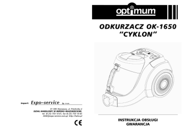 ODK URZACZ OK-1650 “CYKL ON” Import: 01-585 Warszawa, ul. Próchnika 4 DZIAŁ HANDLOWY W MIŃSKU MAZOWIECKIM: tel. (0-25) 759 18 81, fax (0-25) 759 18 85 [email protected], http://hoho.pl INSTRUKCJA OBSŁUGI GWARANCJA 1) Nie używać odkurzacza zbyt blisko grzejników i podobnych źródeł ciepła, niedopałków papierosów itp. 2) Zanim włożycie wtyczkę do gniazda ściennego, należy upewnić się, że ręce są suche. INSTRUKCJA OBSŁUGI OKURZACZ OK-1650 “CYKLON” 3) Zanim zaczniecie używać odkurzacz, prosimy usunąć duże i ostre obiekty z podłogi, w celu zapobieżenia uszkodzeniu odkurzacza. 4) Kiedy chcecie wyciągnąć wtyczkę z gniazda ściennego, prosimy ciągnąć za samą wtyczkę, a nie za kabel zasilający. Niniejszy odkurzacz jest wyposażony we wtyczkę i kabel zasilający, który zwija się automatycznie. Jeżeli którykolwiek z tych elementów zostanie uszkodzony, zarówno wtyczka jak i kabel muszą być naprawione przez wykwalifikowanego technika serwisu lub elektryka. ŁĄCZENIE PODZESPOŁÓW ODKURZACZA Zawsze należy wyjąć wtyczkę z gniazda zasilającego przed przystąpieniem do zakładania lub zdejmowania akcesoriów! 1. Łączenie podzespołów odkurzacza 1. Zakładanie węża: 10 INFORMACJE DOTYCZĄCE BEZPIECZEŃSTWA 1. Należy uważnie przeczytać niniejszą instrukcję. 2. Przed uruchomieniem odkurzacza należy upewnić się, że napięcie zasilania w sieci elektrycznej odpowiada napięciu na tabliczce znamionowej. 3. Odkurzacz powinien być podłączony do gniazda zasilającego prądu przemiennego o napięciu ~230 V. 4. Nie pozostawiać odkurzacza z wtyczką kabla zasilającego włożoną do gniazda ściennego. Wtyczka zawsze powinna być wyjęta, kiedy odkurzacz nie jest używany lub poddawany zabiegom serwisowym. 5. Do czyszczenie odkurzacza nie wolno stosować benzyny czy innych produktów ropopochodnych oraz rozpuszczalników. 6. Ażeby zmniejszyć groźbę porażenia prądem elektrycznym, nie wolno używać odkurzacza na zewnątrz budynku lub na wilgotnych powierzchniach. 7. Nie pozwalać aby odkurzacz był używany do zabawy. W czasie używania odkurzacza w pobliżu dzieci, konieczne jest zachowanie szczególnej uwagi. 8. Używać wyłącznie jak to jest opisane w niniejszym podręczniku. Stosować akcesoria zalecane przez producenta. 9. Odkurzacz powinien zostać podłączony do gniazdka ze stykiem ochronnym. 10. Nie używać kiedy kabel zasilający lub wtyczka są uszkodzone. Jeżeli odkurzacz nie pracuje tak jak powinien, został upuszczony na podłogę, uszkodzony, pozostawiony na dworze albo wrzucony do wody, należy go oddać do centrum serwisowego. 11. Nie ciągnąć ani nie nosić trzymając za kabel zasilający, nie używać kabla jako rączki, nie przytrzaskiwać kabla drzwiami ani nie przeciągać kabla poprzez ostre krawędzie lub narożniki. Nie przejeżdżać odkurzaczem po jego kablu. Trzymać odkurzacz z dala od nagrzanych powierzchni. 12. Nie wyjmować wtyczki z gniazda ciągnąc ją za kabel. Ażeby wyjąć wtyczkę, należy chwycić za nią samą, a nie za kabel. 13. Nie obsługiwać odkurzacza mokrymi rękoma. 14. Nie wkładać żadnych przedmiotów do otworów odkurzacza. Nie używać odkurzacza, jeżeli którykolwiek otwór jest zatkany. Utrzymywać w czystości, bez kurzu, nitek, włosów i wszystkiego co mogłoby tamować przepływ powietrza. 15. Zachować szczególną ostrożność w czasie sprzątania schodów. 16. Jeżeli kabel zasilający zostanie uszkodzony, musi on być wymieniony przez producenta, jego przedstawiciela serwisu lub podobnie wykwalifikowany personel, w celu uniknięcia zagrożeń. 17. Nie używać rączki pojemnika na kurz do noszenia korpusu odkurzacza. Do noszenia odkurzacza zawsze należy używać rączki odkurzacza. 7 1. Pokrywa pojemnika na kurz rączka węża elastyczny wąż 5. Przycisk zwalniający pojemnik na kurz rączka rura przedłużająca 2. Filtr HEPA regulacja mocy przycisk zwijania 6. Odpylacz cyklonowy 7. Filtr nylonowy 3. Przycisk zwalniający pokrywę pojemnika na kurz pojemnik na kurz 8. Pojemnik na kurz kółko korpus podstawy złącze węża szczotka 8 4. Przycisk zwalniający dno pojemnika na kurz 9. Dno pojemnika na kurz przycisk przełącznika ŚRODKI OSTROŻNOŚCI Jeżeli otwór przez który zasysane jest powietrze, rura ssąca lub pręt teleskopowy na rurze zostaną zablokowane, należy natychmiast wyłączyć odkurzacz. Przed podjęciem próby ponownego uruchomienia odkurzacza należy najpierw usunąć blokujący materiał. 9 1. Pokrywa pojemnika na kurz rączka węża elastyczny wąż 5. Przycisk zwalniający pojemnik na kurz rączka rura przedłużająca 2. Filtr HEPA regulacja mocy przycisk zwijania 6. Odpylacz cyklonowy 7. Filtr nylonowy 3. Przycisk zwalniający pokrywę pojemnika na kurz pojemnik na kurz 8. Pojemnik na kurz kółko korpus podstawy złącze węża szczotka 8 4. Przycisk zwalniający dno pojemnika na kurz 9. Dno pojemnika na kurz przycisk przełącznika ŚRODKI OSTROŻNOŚCI Jeżeli otwór przez który zasysane jest powietrze, rura ssąca lub pręt teleskopowy na rurze zostaną zablokowane, należy natychmiast wyłączyć odkurzacz. Przed podjęciem próby ponownego uruchomienia odkurzacza należy najpierw usunąć blokujący materiał. 9 1) Nie używać odkurzacza zbyt blisko grzejników i podobnych źródeł ciepła, niedopałków papierosów itp. 2) Zanim włożycie wtyczkę do gniazda ściennego, należy upewnić się, że ręce są suche. INSTRUKCJA OBSŁUGI OKURZACZ OK-1650 “CYKLON” 3) Zanim zaczniecie używać odkurzacz, prosimy usunąć duże i ostre obiekty z podłogi, w celu zapobieżenia uszkodzeniu odkurzacza. 4) Kiedy chcecie wyciągnąć wtyczkę z gniazda ściennego, prosimy ciągnąć za samą wtyczkę, a nie za kabel zasilający. Niniejszy odkurzacz jest wyposażony we wtyczkę i kabel zasilający, który zwija się automatycznie. Jeżeli którykolwiek z tych elementów zostanie uszkodzony, zarówno wtyczka jak i kabel muszą 