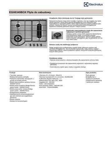 EGH6349BOX Płyta do zabudowy Urządzenie, które dostosuje się do Twojego stylu gotowania Naczynia kuchenne mają różne kształty i rozmiary. Czy nie mogłyby być takie palniki gazowe? Nowa płyta gazowa BridgeBurner firmy Electrolux jest wyposażona w specjalne palniki, które można połączyć w jedno większe pole grzejne. Idealny do dużych naczyń lub grillowania palnik BridgeBurner zapewnia swobodę gotowania dużych i małych potraw. Doskonałe rozprowadzanie ciepła dla zapewnienia najlepszych wyników gotowania Wydajny palnik o mocy 4kW zapewnia równomierne rozprowadzanie ciepła, co pozwala uzyskać doskonałe wyniki gotowania. Główne zalety palnika można docenić szczególnie, gdy na gotowanie nie ma zbyt wiele czasu. Żeliwne ruszty dla stabilnego podparcia Nadaj swojej kuchni profesjonalny wygląd dzięki żeliwnym rusztom nad palnikami BridgeBurner. Są one bardzo wytrzymałe, mają stylowy wygląd i zapewniają stabilne, pewne podparcie ciężkim naczyniom podczas gotowania dużych ilości potraw. Dodatkowe zalety: • Stylowe obramowanie o skośnej krawędzi dla zapewnienia ochrony blatu • Dodatkowa przestrzeń dla zapewnienia ergonomii i optymalnej regulacji płomienia • Automatyczny zapłon gazu myślą o wygodzie obsługi Funkcje: Dane techniczne: Opis produktu: • Typ płyty: gazowa •Rodzaj sterowania: pokrętła •Położenie elementów sterujących: z przodu po prawej stronie •Strefa lewa przednia: potrójna korona , 4000W/122mm •Strefa prawa przednia: Bridge Burner, palnik średni , 2000W/70mm •Strefa prawa tylna: funkcja Bridge, średni palnik , 2000W/70mm •Zintegrowana zapalarka •Zabezpieczenie przeciwwypływowe: gaz jest odcinany po wygaśnięciu płomienia •Ruszty żeliwne •Zestaw do konwersji gazu • Wymiary (S x G) [mm] : 594x510 •Wymiary wycięcia (W x S x G) [mm] : 40x560x480 •Całkowita długość kabla [m] : 1,1 •Maksymalna moc gazu [W] : 9000 •Napięcie [V] : 220-240 •Kolor : stal szlachetna •Kod produktu (PNC) : 949 640 363 •Kod EAN : 7332543459995 Płyta gazowa BridgeBurner z wydajnymi palnikami, zintegrowaną zapalarką i żeliwnymi rusztami.